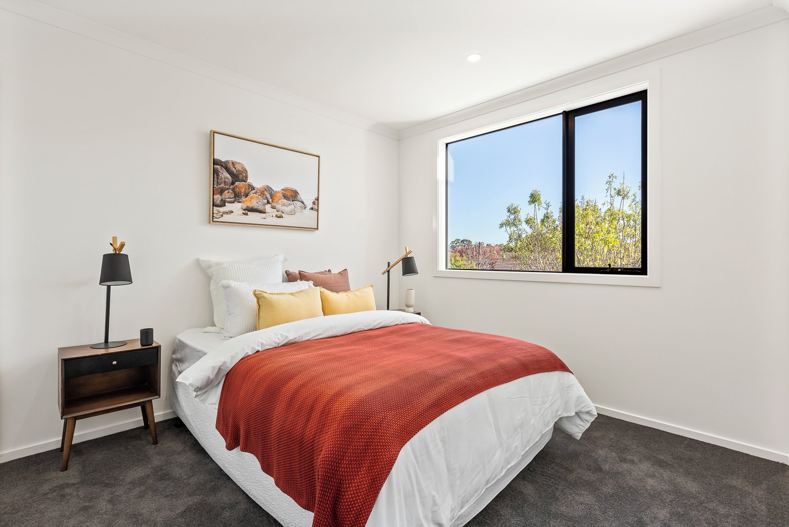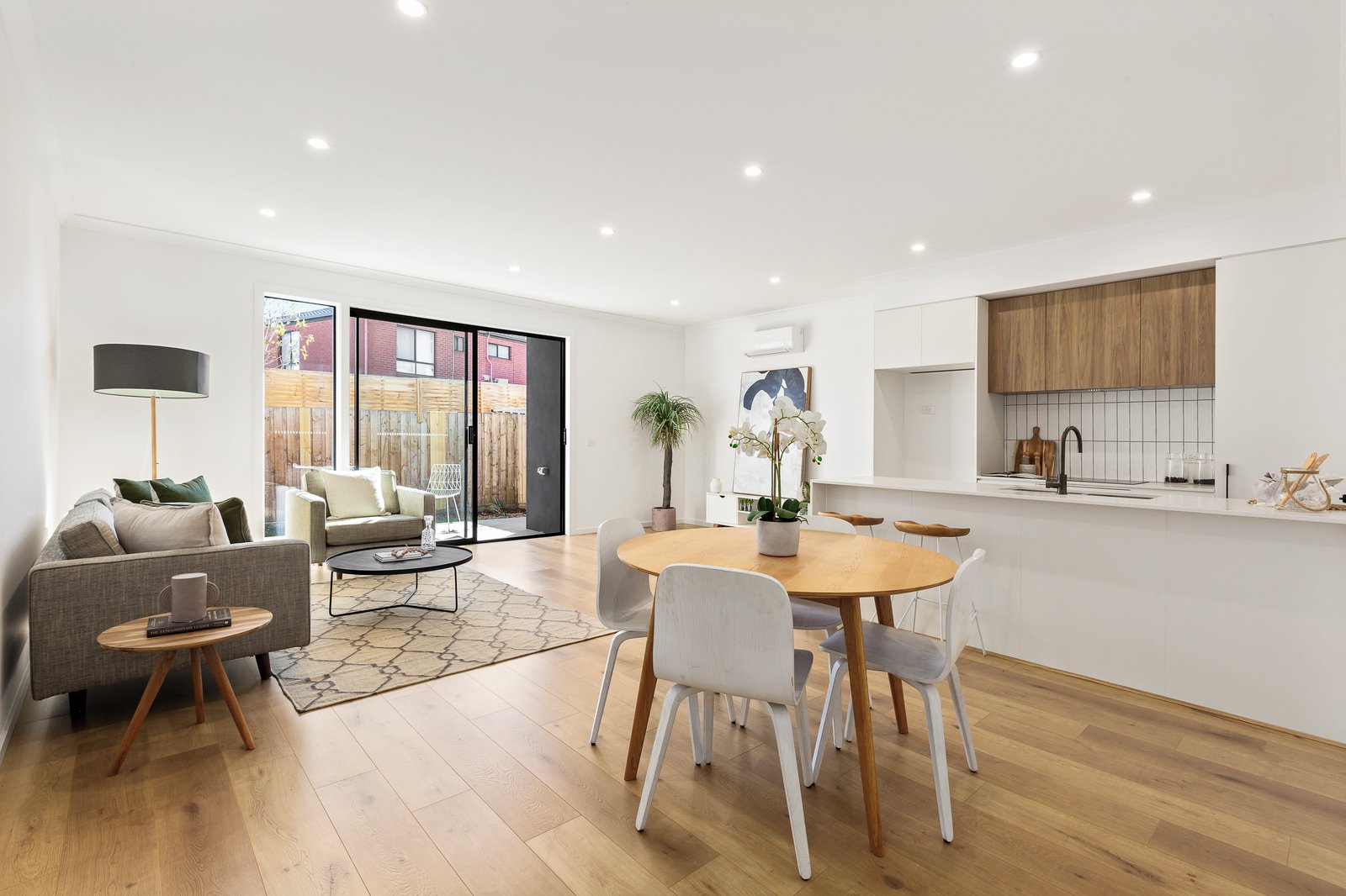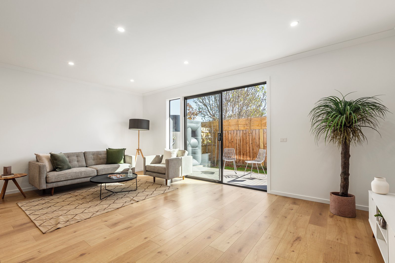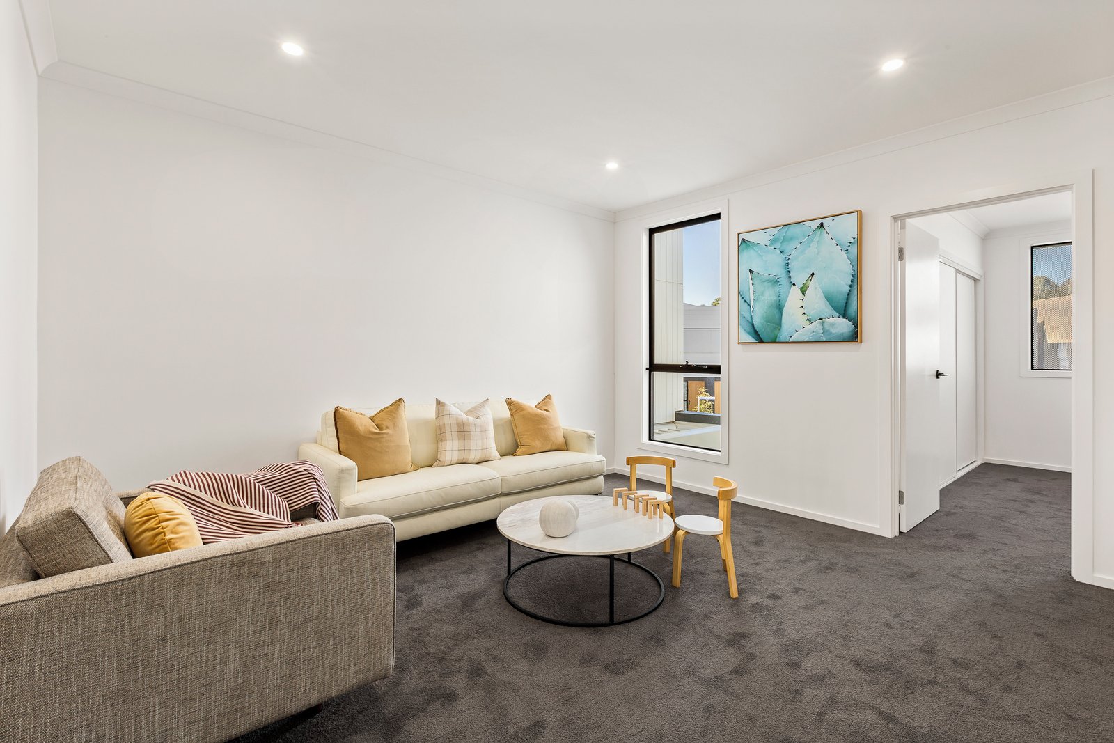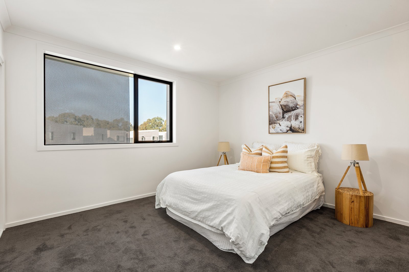 Inside, you will find three spacious bedrooms, two stylish bathrooms, plus a powder room, and dual living zones spread across two thoughtfully planned levels. The open-plan kitchen features reconstituted stone benchtops, sleek black tapware, and Bosch appliances, flowing seamlessly into a bright living and dining area that connects to a secure rear courtyard.