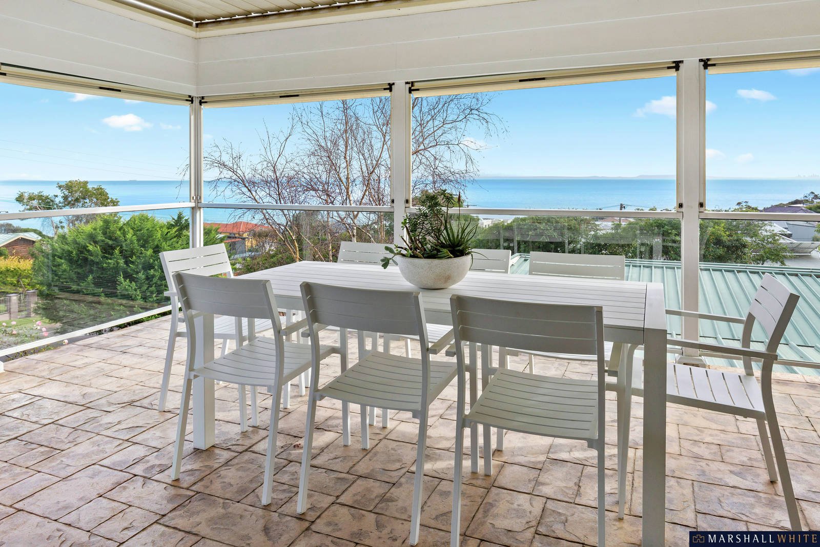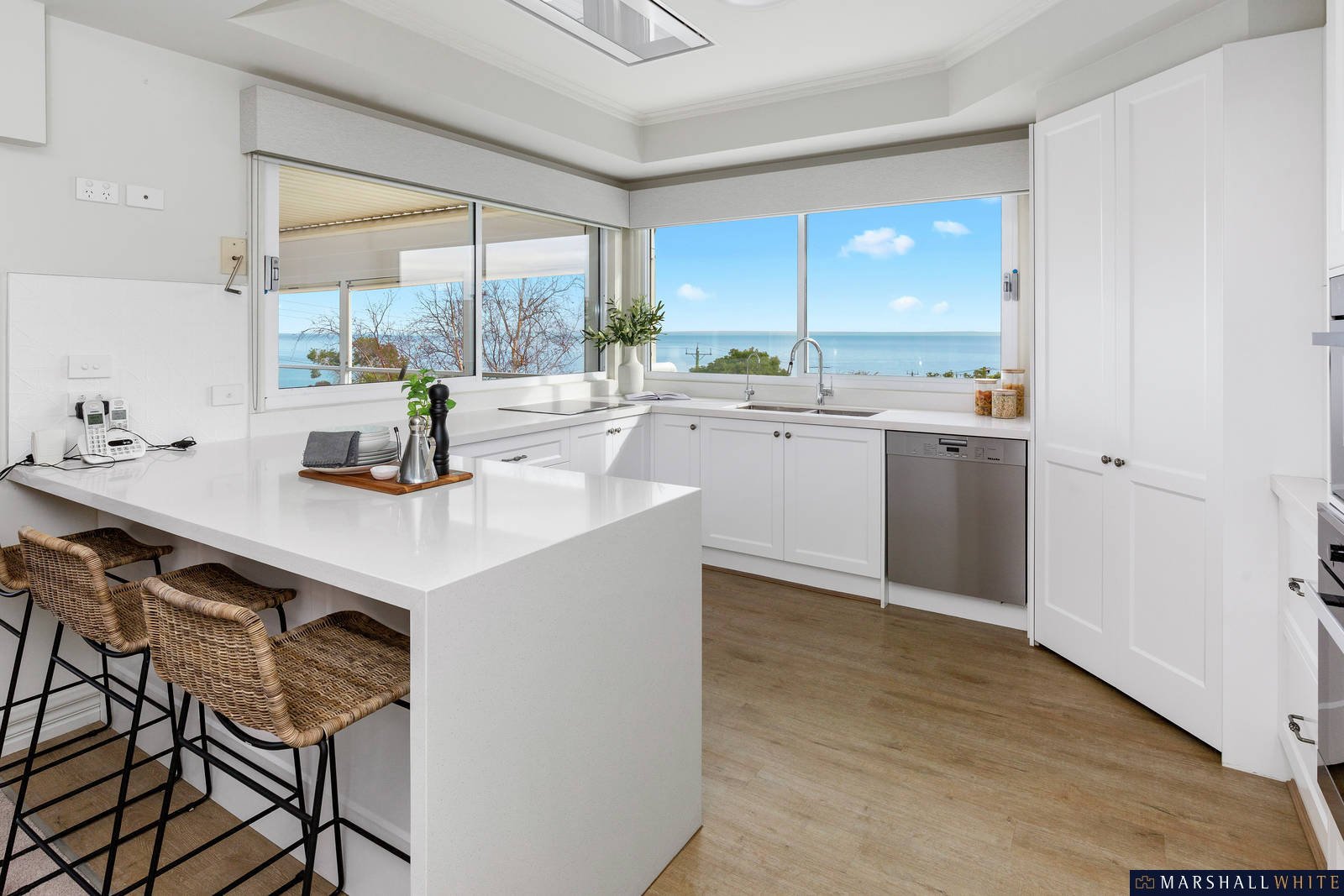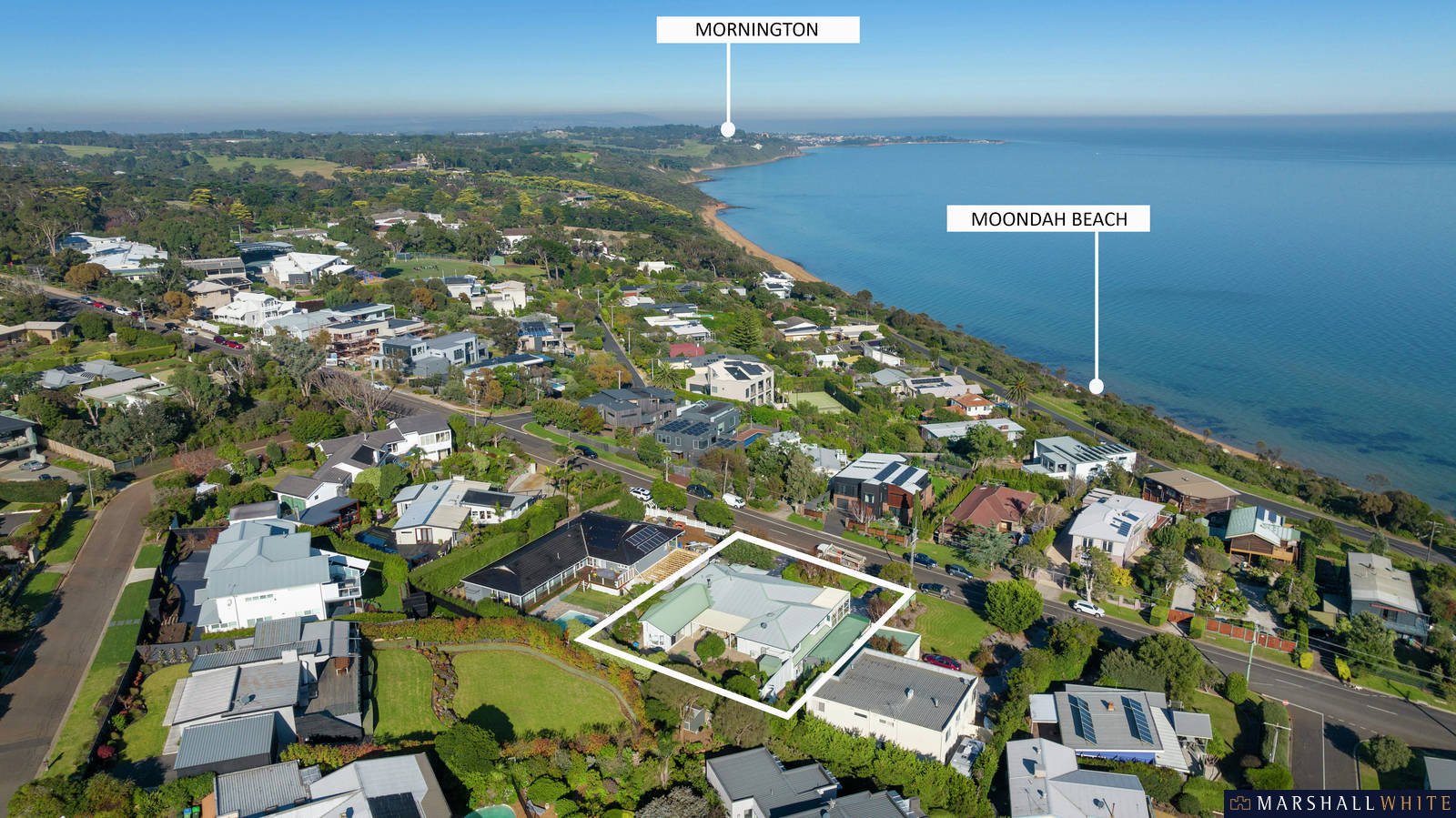 Sweeping views of Port Phillip Bay, Moondah Beach at the end of your street, a light filled home of impressive proportions and luxurious offerings; your search for coastal living at its finest could not yield a better result. Sitting proud on the high side of Kunyung Road, with a wide circular driveway leading to four remote garages sets the scene for the spacious dimensions to follow within.