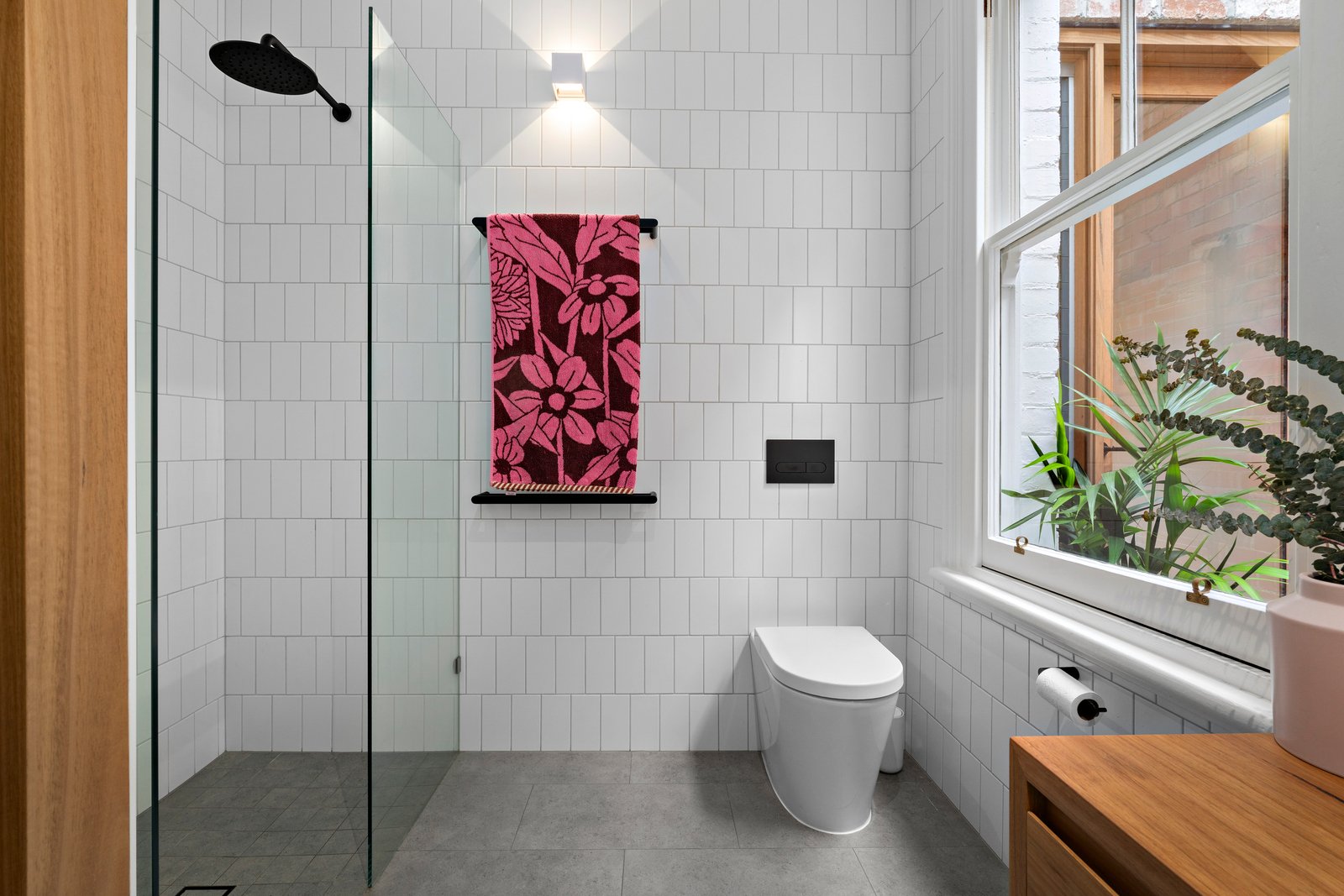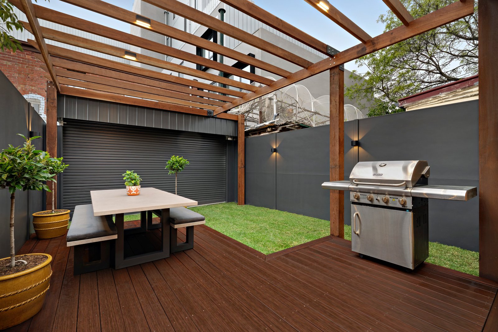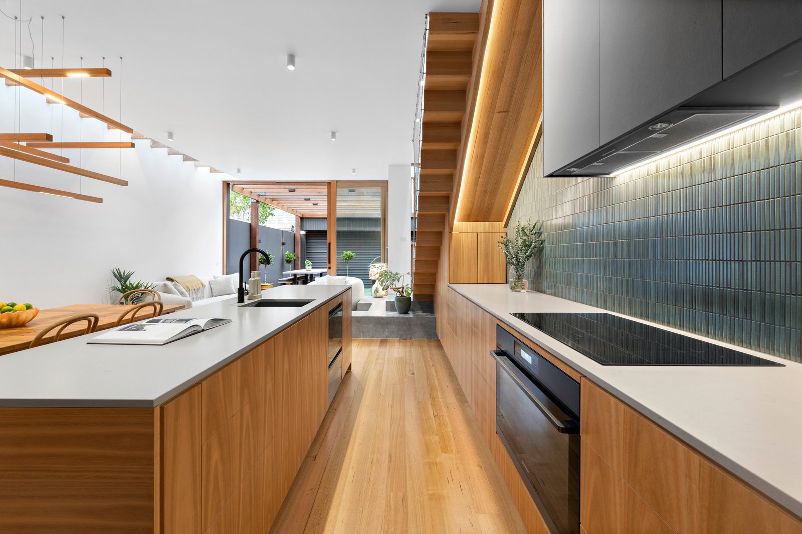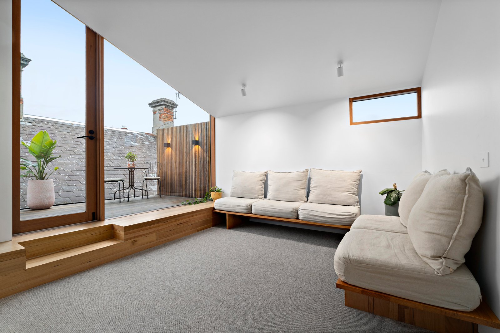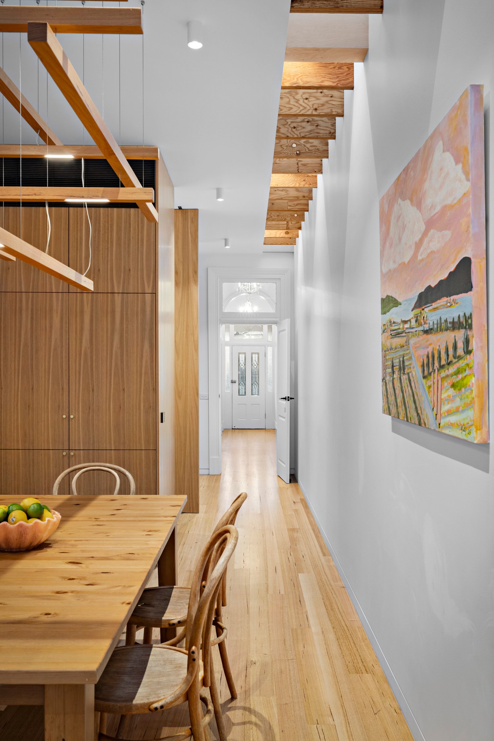 Behind a high walled forecourt, the wide arched hall featuring Tasmanian oak floors flows through to a stunning open plan living and dining room beneath soaring skylit ceilings and surrounded by warm bespoke Blackbutt joinery. Beautifully finished with mosaic tiles, stone benches and Blackbutt timber, the gourmet kitchen includes premium appliances and an integrated fridge/freezer. Full height timber framed glass sliders open to a peaceful north-facing pergola covered garden with large, decked area and off-street parking via the rear right of way. There are two double bedrooms, a full-size laundry and a stylish bathroom on the ground level while a sculptural timber staircase leads up to the main bedroom with built in robe, a designer bathroom and a spacious retreat / fourth bedroom with concealed study nook and private roof deck.