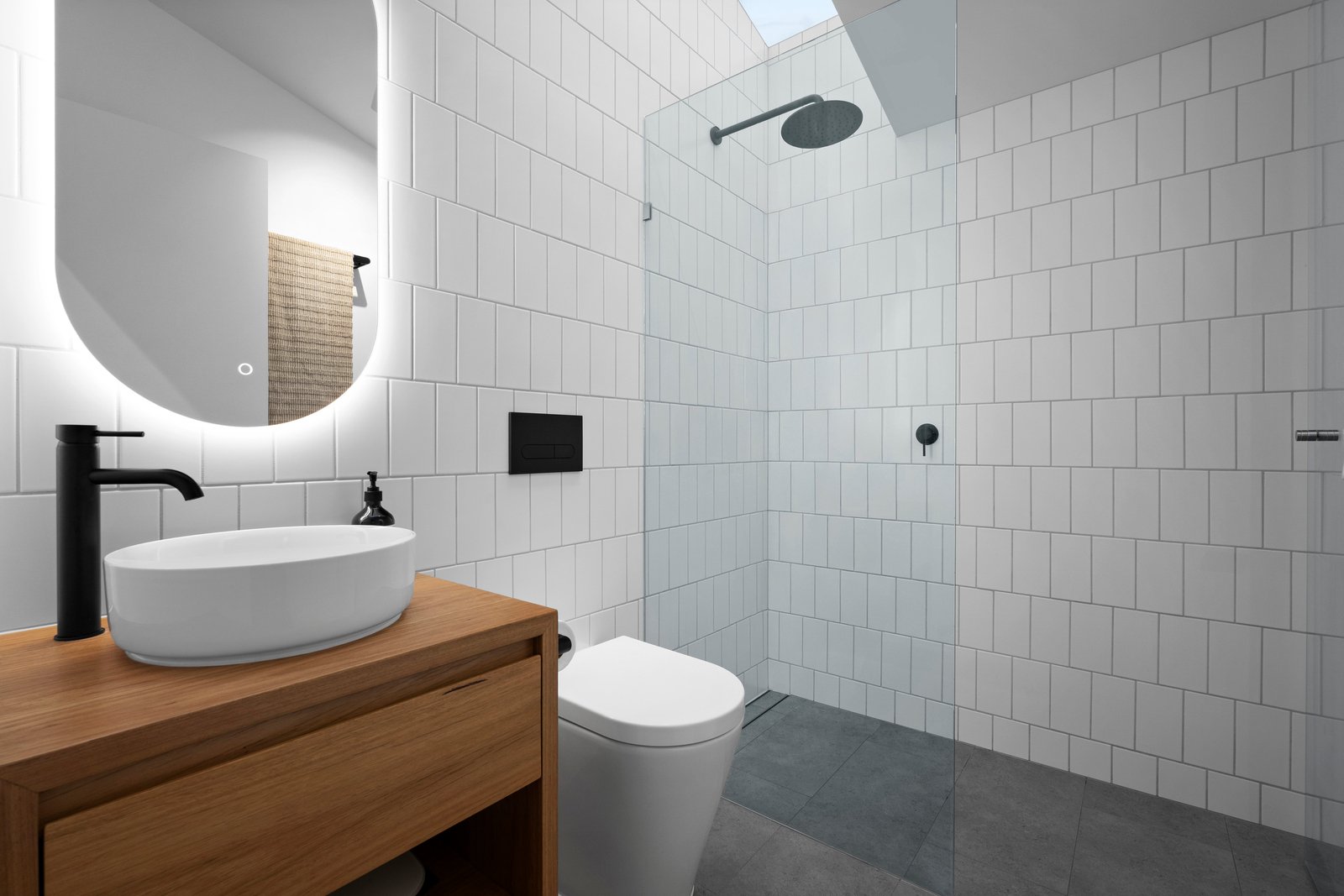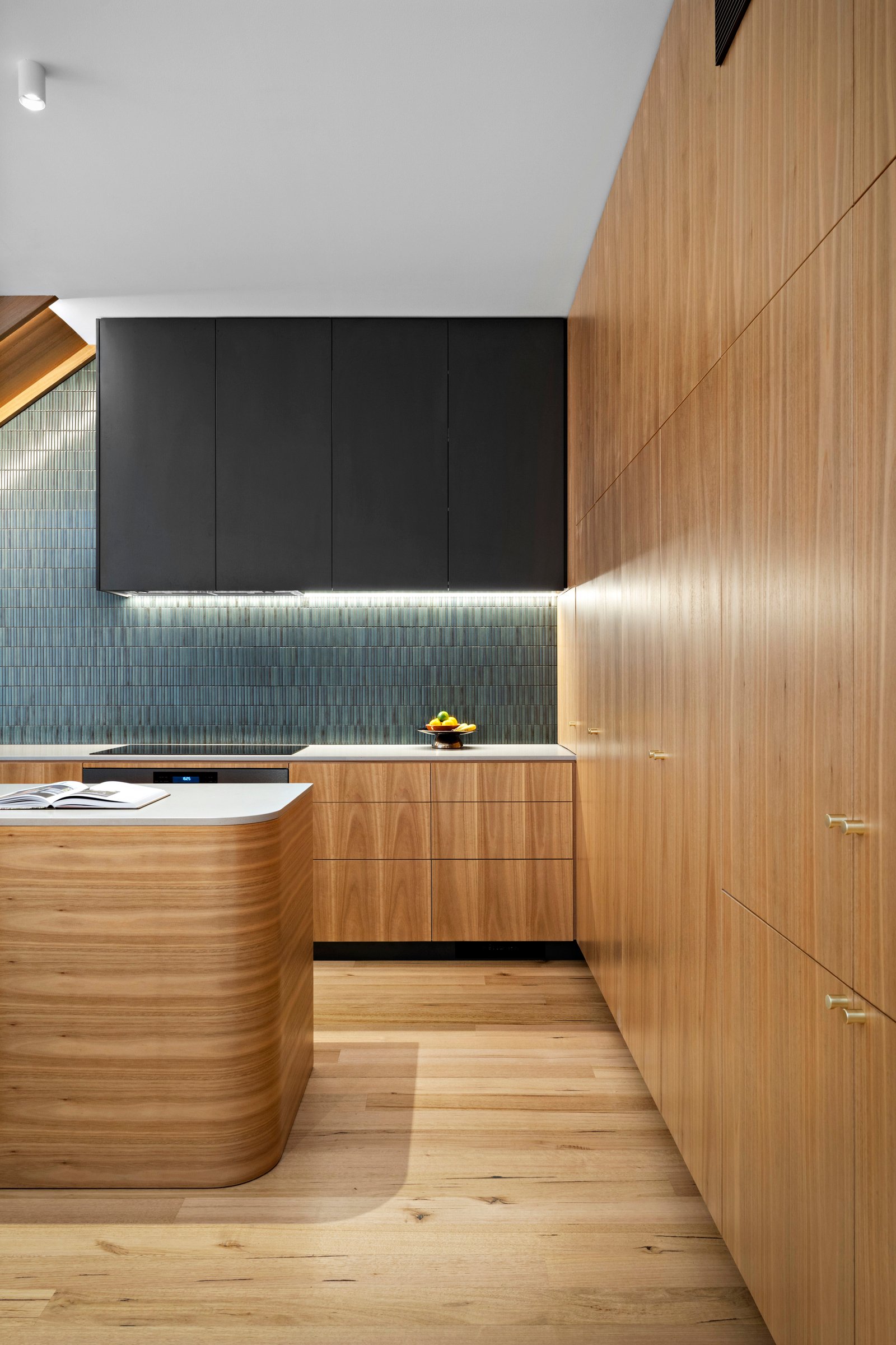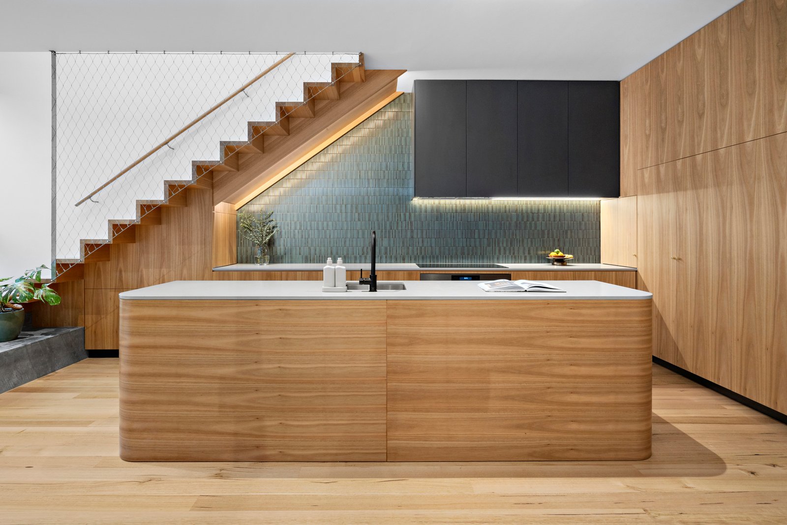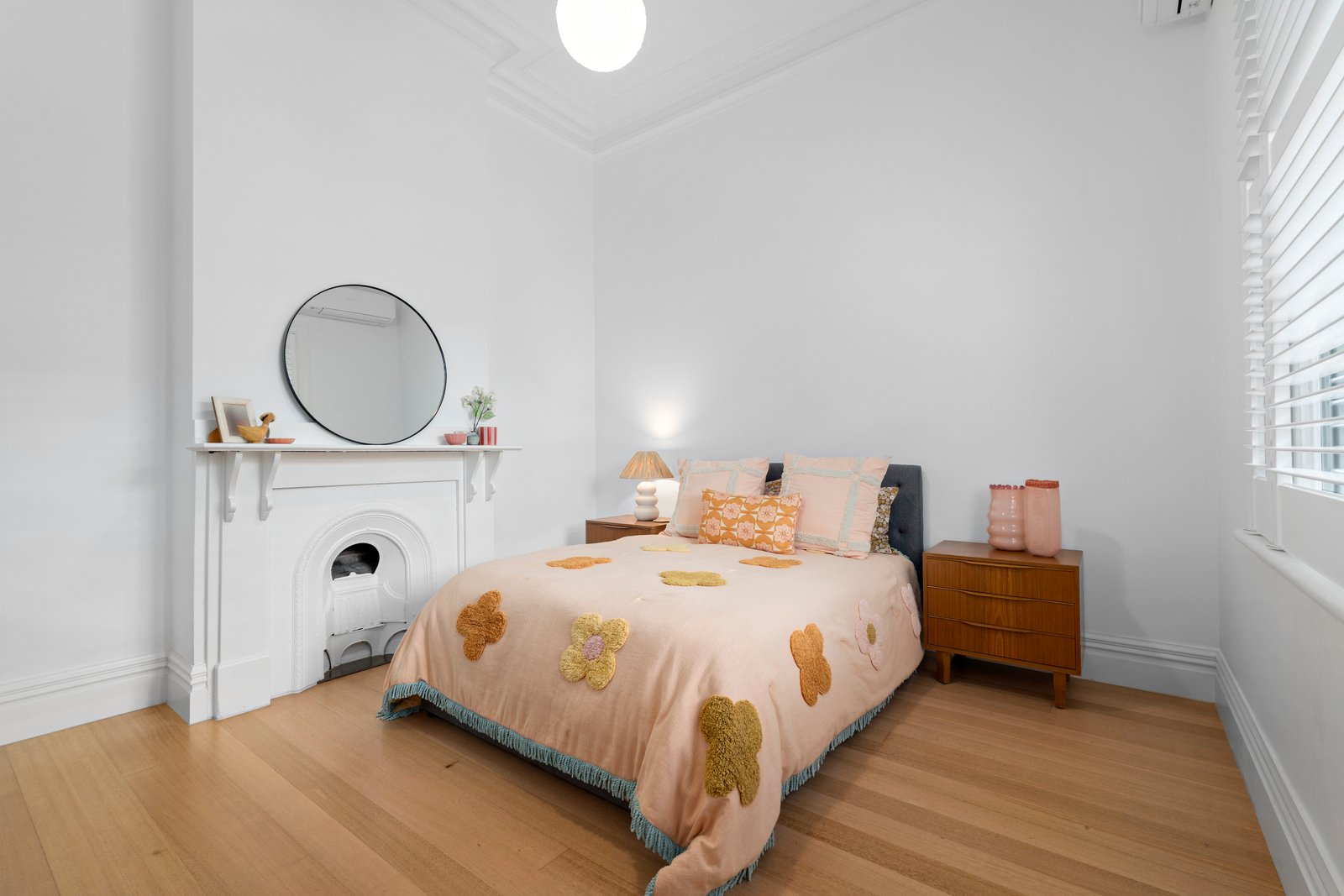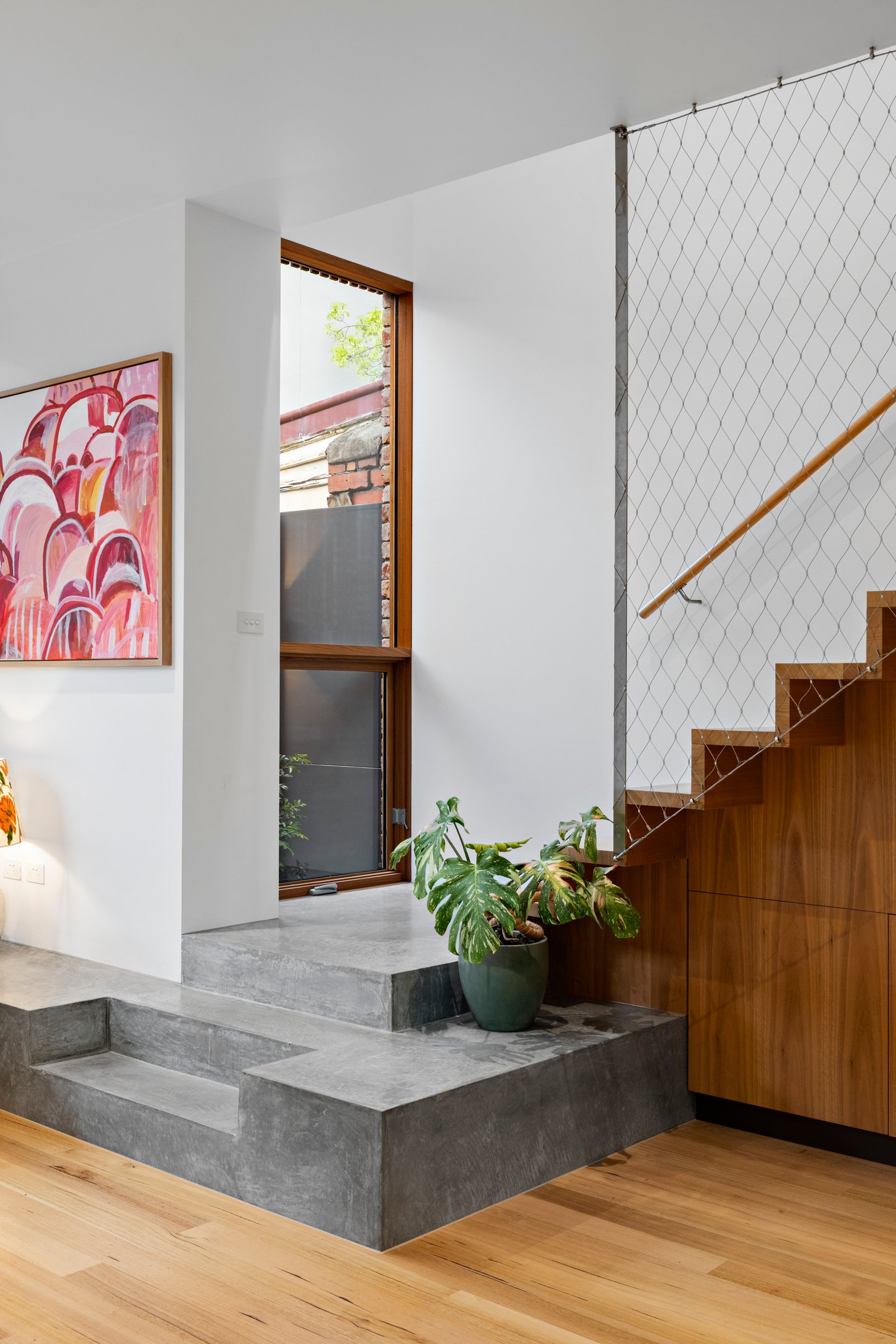 Behind a high walled forecourt, the wide arched hall featuring Tasmanian oak floors flows through to a stunning open plan living and dining room beneath soaring skylit ceilings and surrounded by warm bespoke Blackbutt joinery. Beautifully finished with mosaic tiles, stone benches and Blackbutt timber, the gourmet kitchen includes premium appliances and an integrated fridge/freezer. Full height timber framed glass sliders open to a peaceful north-facing pergola covered garden with large, decked area and off-street parking via the rear right of way. There are two double bedrooms, a full-size laundry and a stylish bathroom on the ground level while a sculptural timber staircase leads up to the main bedroom with built in robe, a designer bathroom and a spacious retreat / fourth bedroom with concealed study nook and private roof deck.
