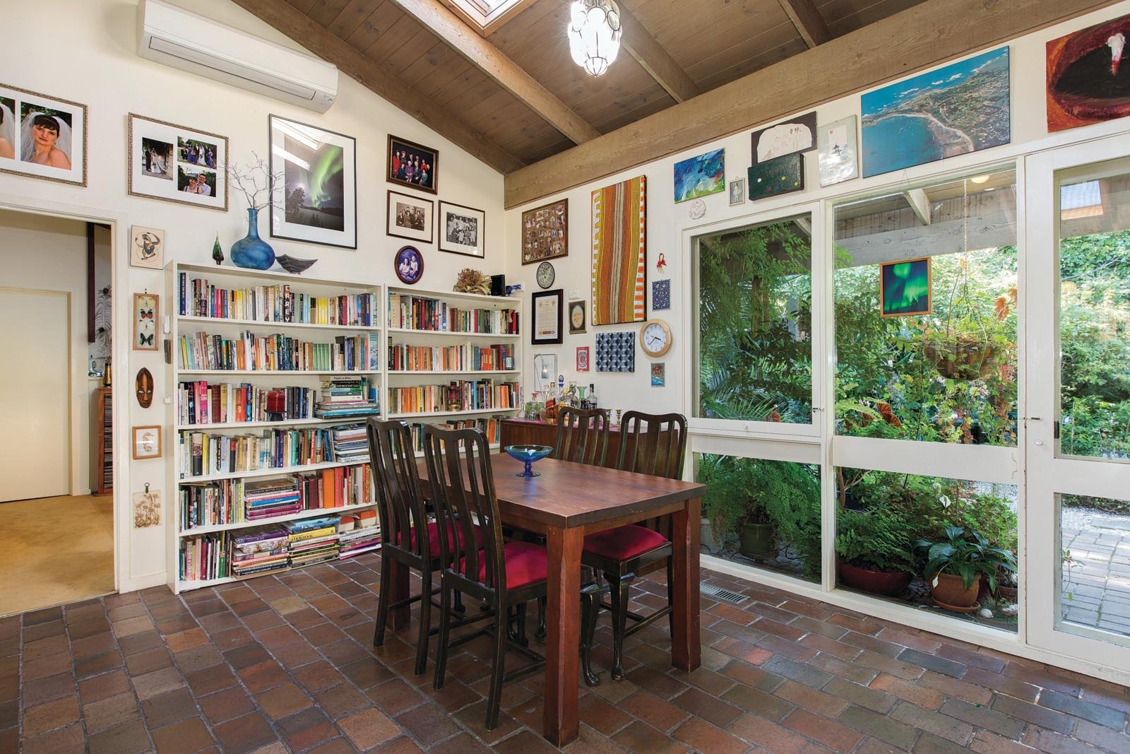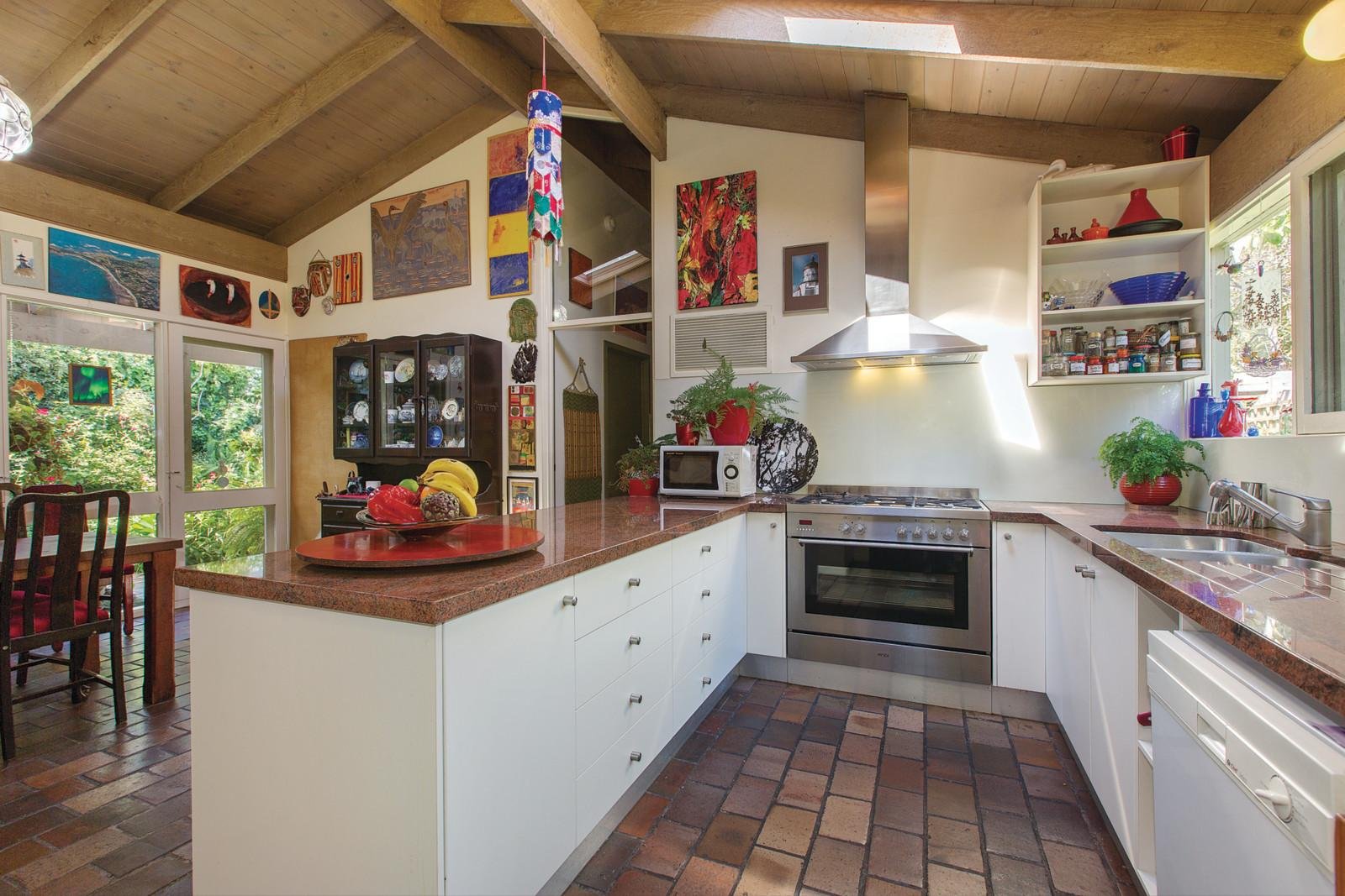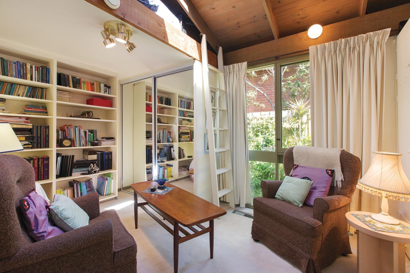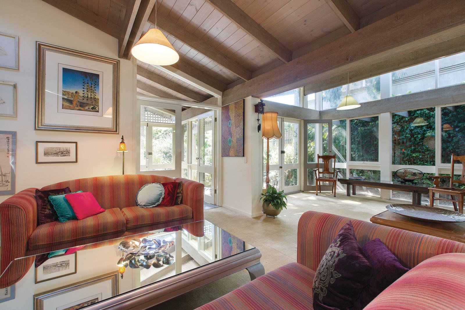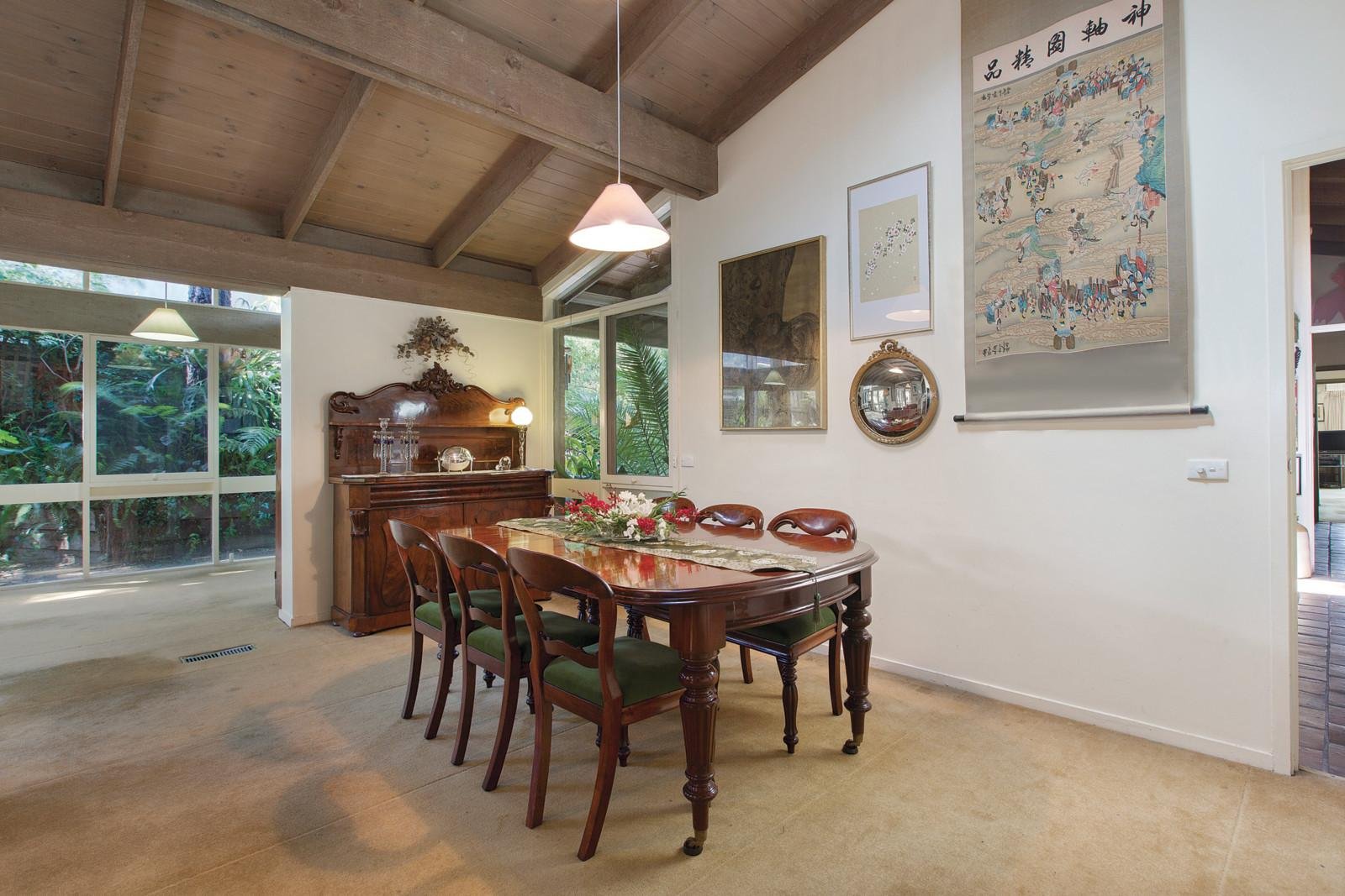 The residence features vaulted timber lined ceilings and an abundance of glass through the expansive formal sitting and dining room, a bookshelf lined study, casual dining and a refurbished kitchen. Flexible accommodation includes a main bedroom with en-suite and walk-in-robe, two further bedrooms with mezzanine beds and robes, a den, bright bathroom and an exceptionally spacious 4th bedroom/recreation room or convenient home office with its own entrance.