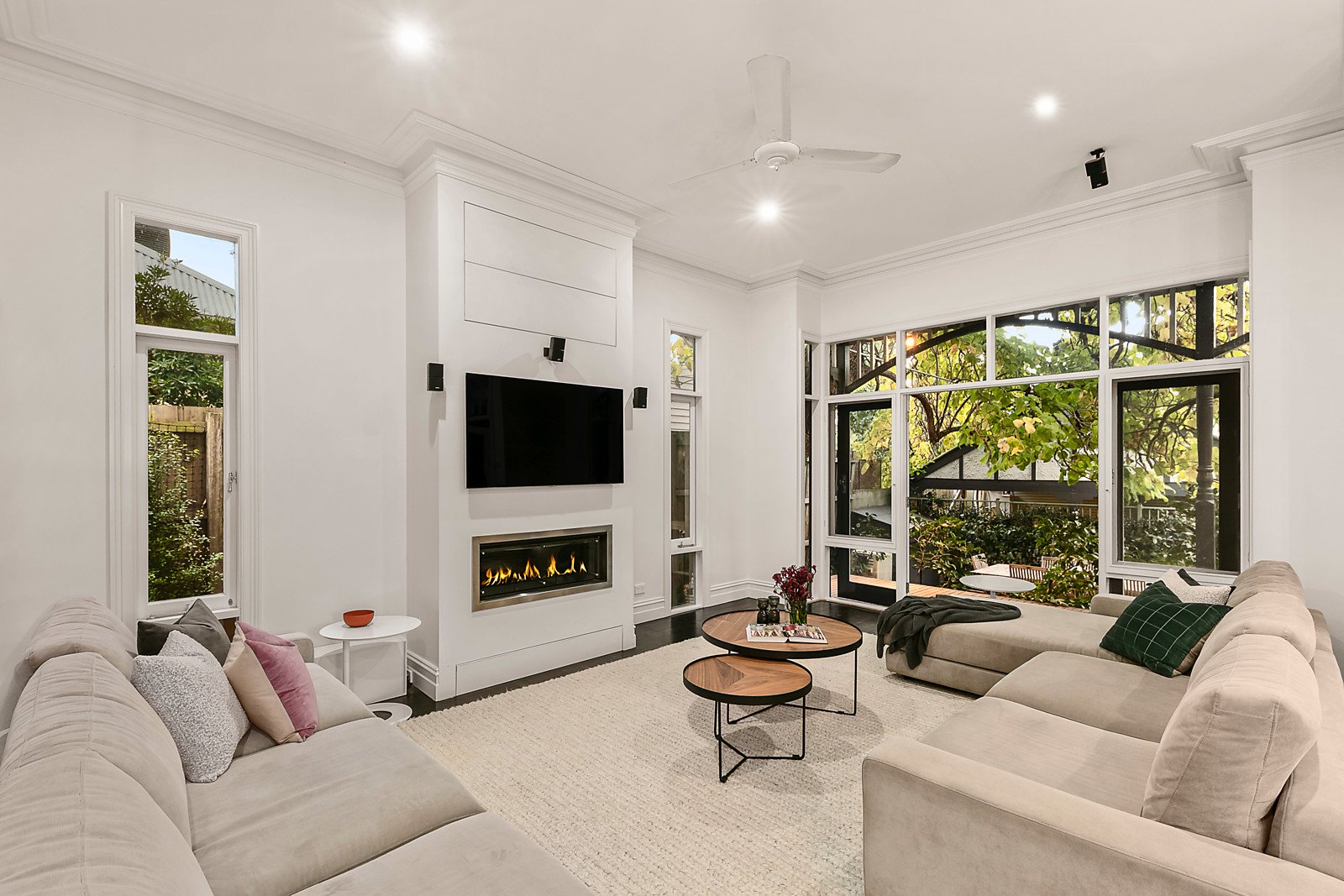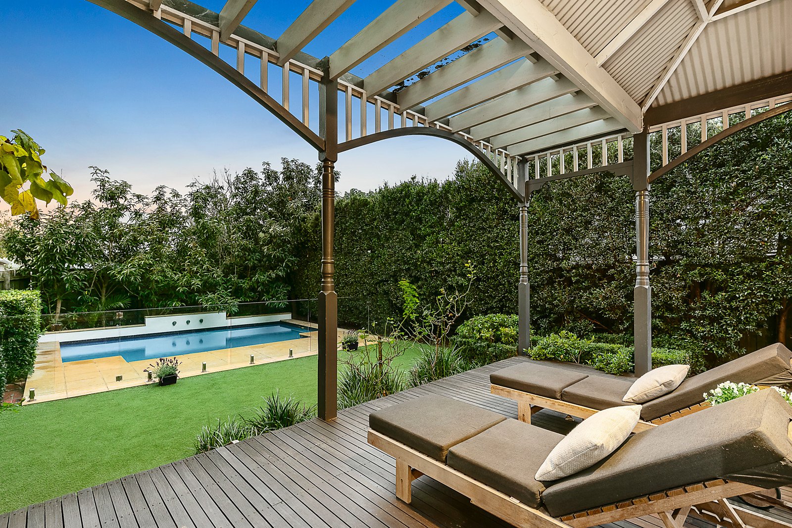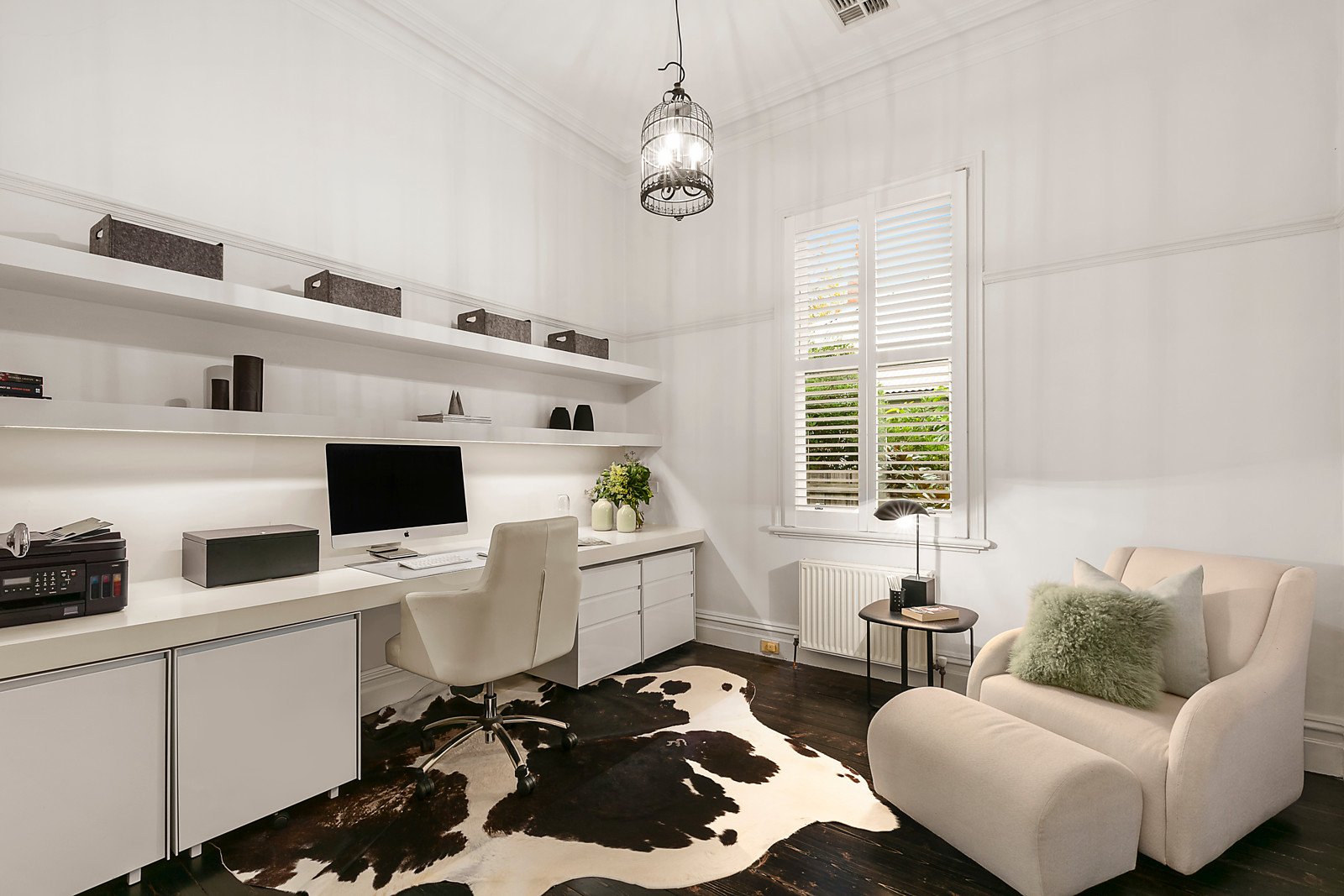 Nestled behind a picket fence and privately protected by tall hedging the home features a crisp white decor and subtly retained period attributes. A stained timber hallway leads to a formal sitting room with a spiral cellar below, four bedrooms, large main with a pristine fully-tiled ensuite, plus two upstairs with a generous family retreat and bathroom; a fitted study, fully-tiled family bathroom and a storeroom with underfloor storage. On the lower level a magnificent north-facing family domain offers the very best amenities for living, dining and entertaining; serviced by a sleek Calacatta marble kitchen equipped with a wide island bench, WIP, prestige Ilve stove and Miele integrated dishwasher and adjacent laundry. Opening to a verandah and paved alfresco dining area with a built in gas barbeque overlooking a gas heated pool - perfect for family relaxation and enjoyment.