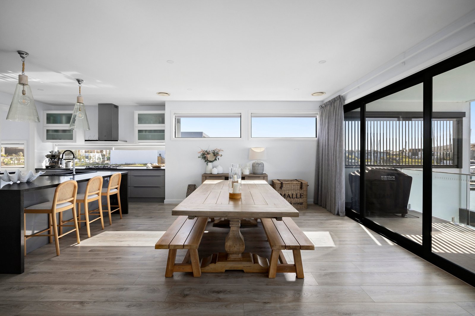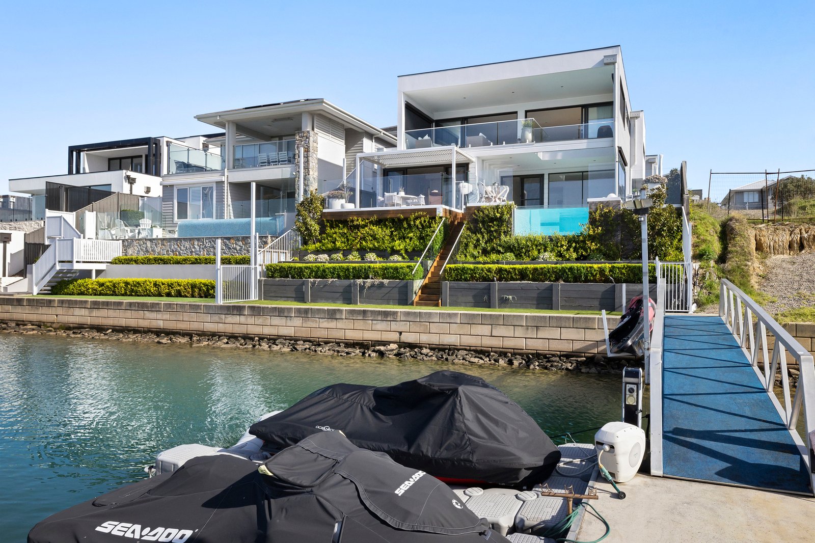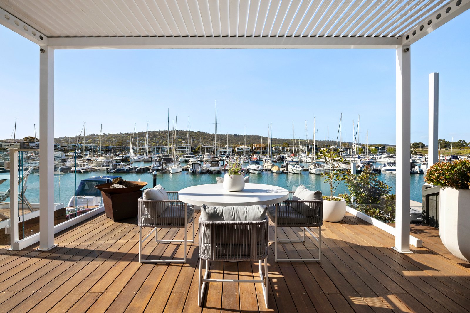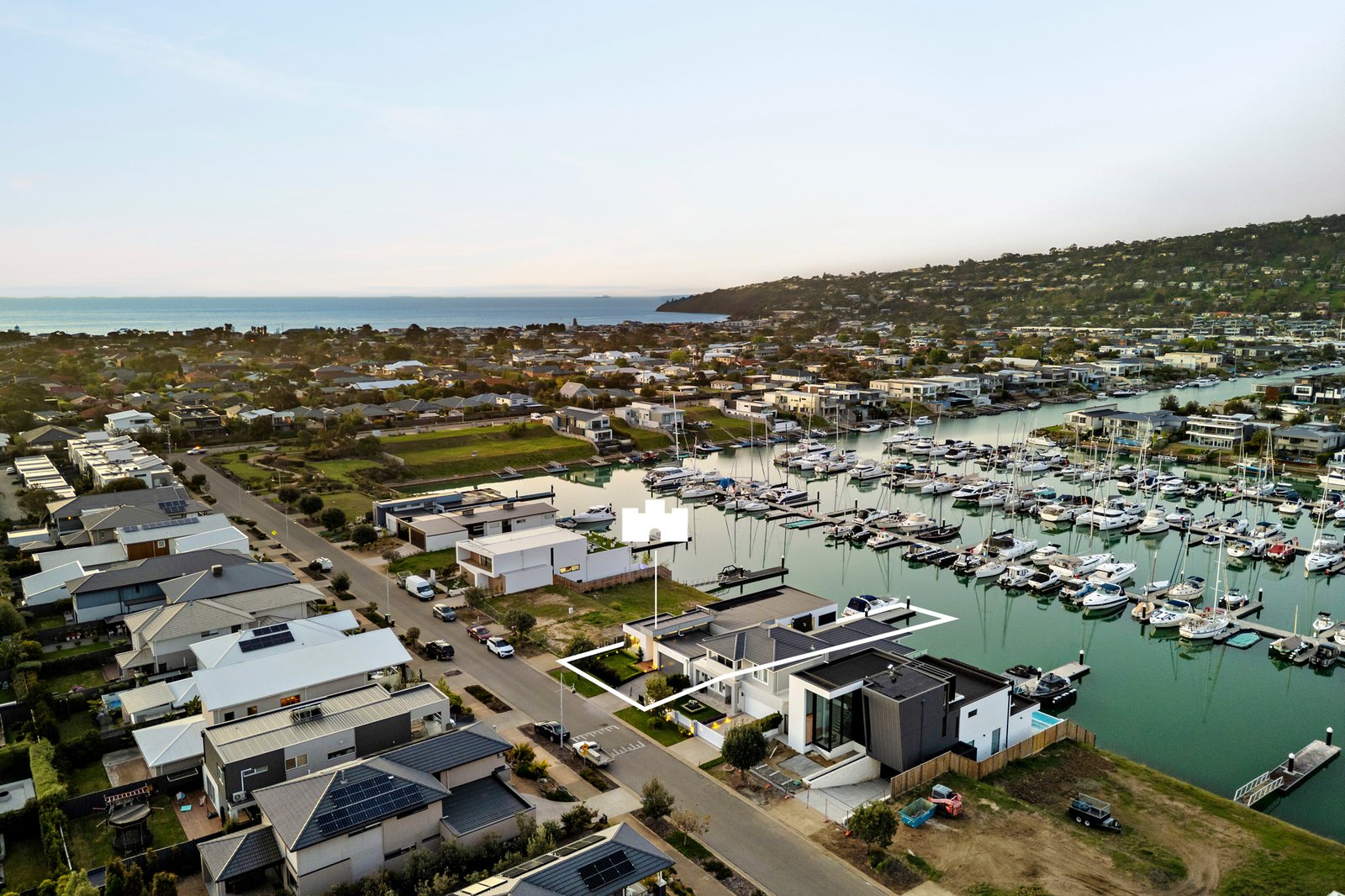 Private ramp access leads to the mooring, sized for a catamaran, with premium features including a remote double garage, auto gates with secure parking for two additional vehicles, a large laundry with a chute, zoned ducted heating and cooling, double glazing, video intercom, CCTV, fibreoptic cable to the house, and a ducted vacuum system. Moments from the beach, Martha’s Table, acclaimed wineries and fine dining, and within an hour of Melbourne’s CBD, it exemplifies the marina lifestyle at its most exclusive.