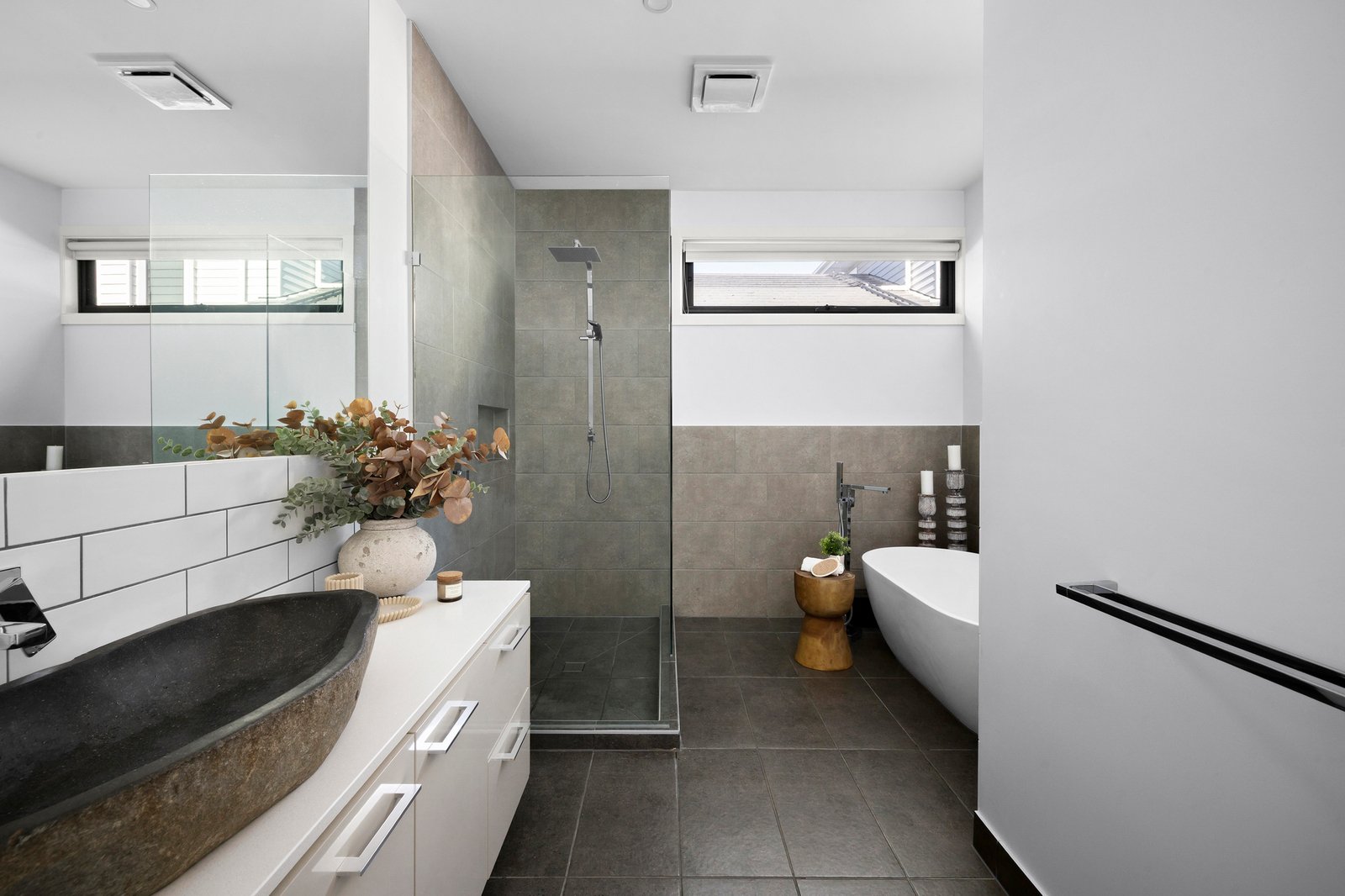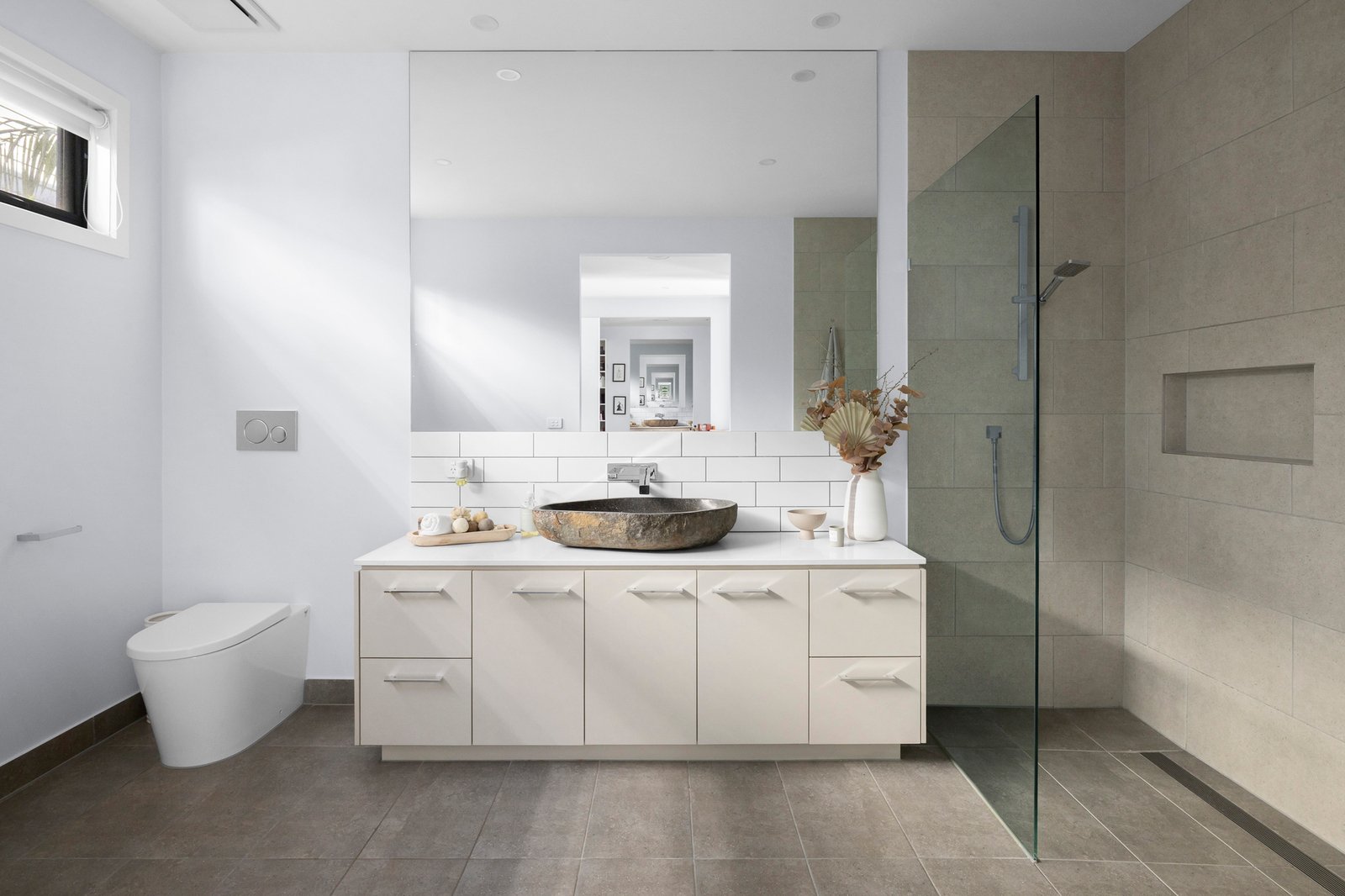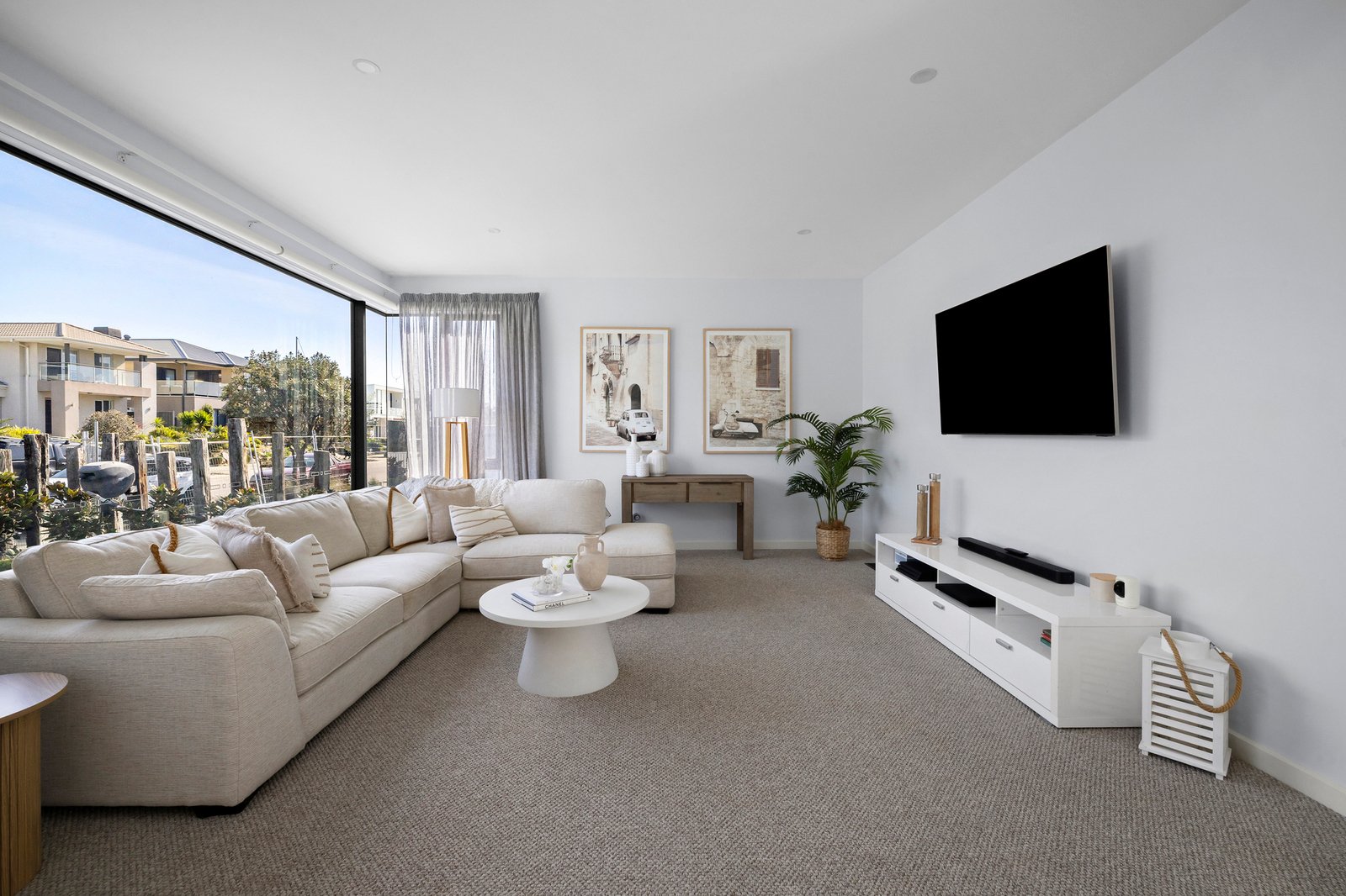 Architecturally striking and thoughtfully arranged over a dual-level layout, the interior stuns with a serene choice of natural materials and sunlight, with Mount Gambier sandstone and a soft neutral palette creating calm against the vivid backdrop of water and sky. Three independent living areas define the generous scale of the home, each offering a distinct sense of purpose yet connecting through a focus on light, outlook and relaxed luxury. The main living and dining zone flows through full-height glass to the harbour, forming a continuous visual link between the interior and the water beyond, with a gas fire for ambience, and uninterrupted views over the Yachts below. Motorised louvre blinds ensure year-round comfort and privacy, enhancing the indoor-outdoor connection, enriched by the entertainer's kitchen and butler’s pantry, catering beautifully to every need with high-end appliances, stone finishes and quality 2-pac cabinetry.