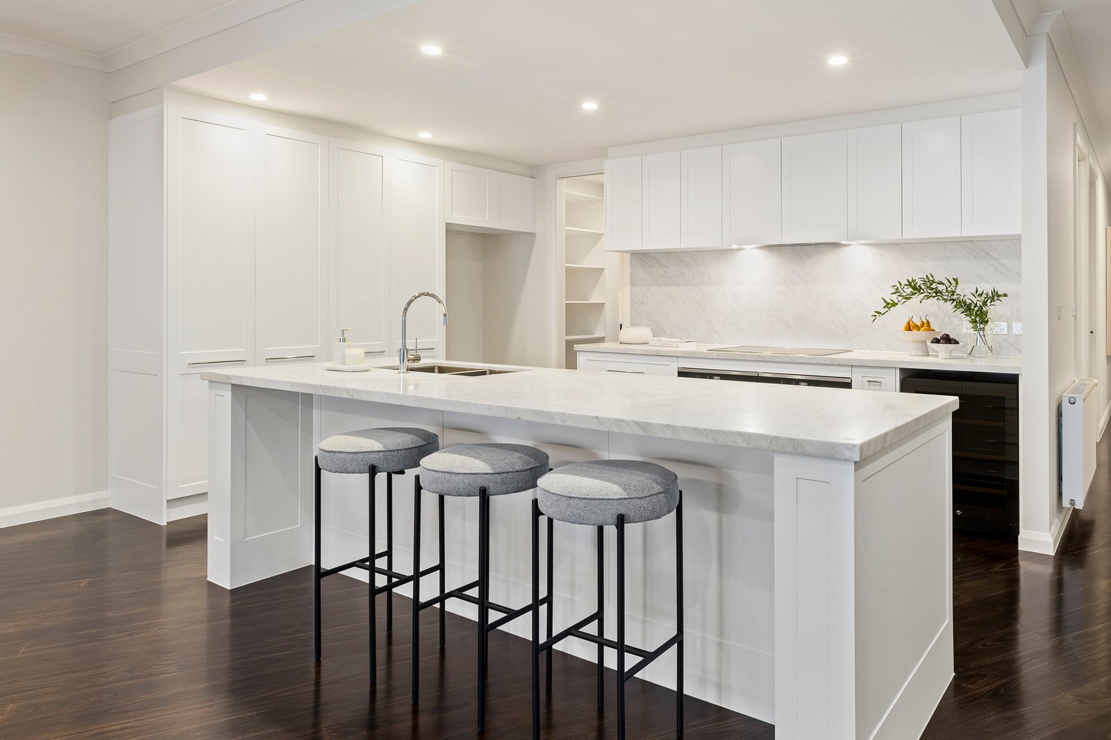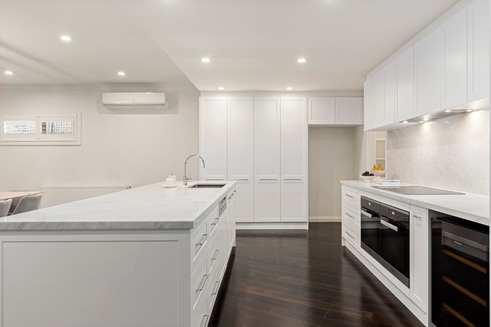 Impeccably appointed throughout, the light-filled interior reveals a refined elegance, enhanced by rich dark timber floors, plantation shutters, shaker style cabinetry and an opulent use of Carrara marble. A striking sense of scale is immediately evident upon entry, where a wide hall leads to an expansive open-plan living and dining domain. At its heart, a stunning gourmet kitchen with Carrara marble benchtops and splashback, a walk-in pantry and premium Miele appliances including dual ovens and a 6-zone induction cooktop, offers the perfect space for both family meals and culinary entertaining. Stacking glass doors seamlessly connect the indoors and out, extending to a private and generous undercover alfresco deck area and professionally landscaped garden bathed in north-facing light.
