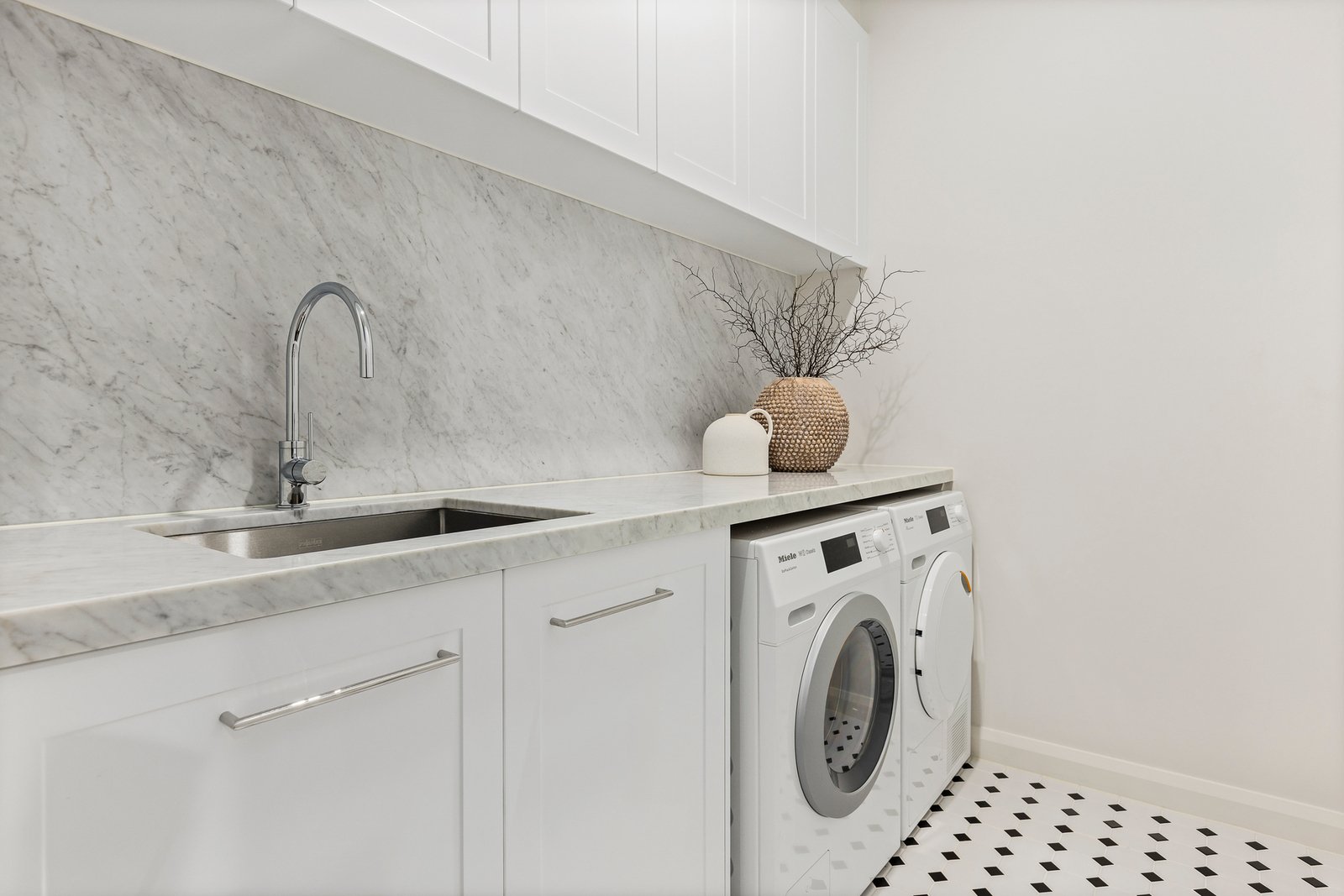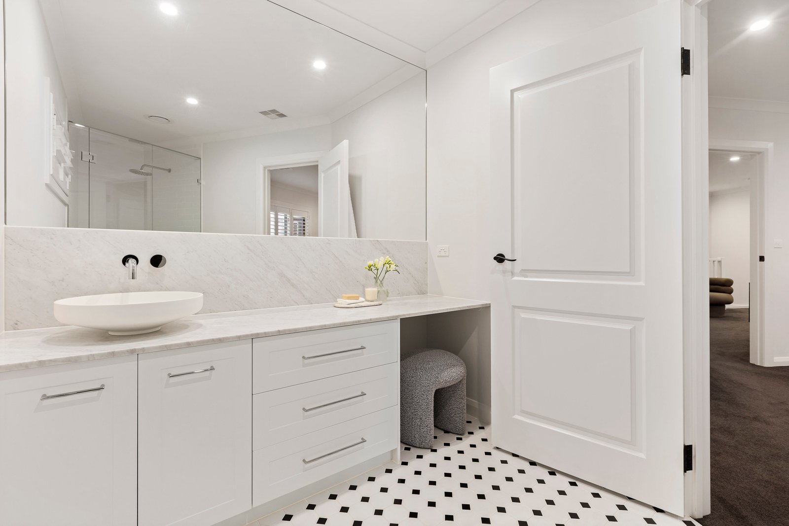 Accommodation is both flexible and indulgent. A ground-floor bedroom with built-in robes and a central sophisticated bathroom provides ideal guest or multigenerational living, whilst upstairs, the spacious main bedroom impresses with a lavish ensuite and walk-in robe. Two further robed bedrooms are complemented by a deluxe third bathroom, a separate toilet and an expansive retreat with a study nook. From dual basins and a freestanding bath in the main bathroom to a dedicated marble vanity in the ensuite, every detail has been thoughtfully curated.