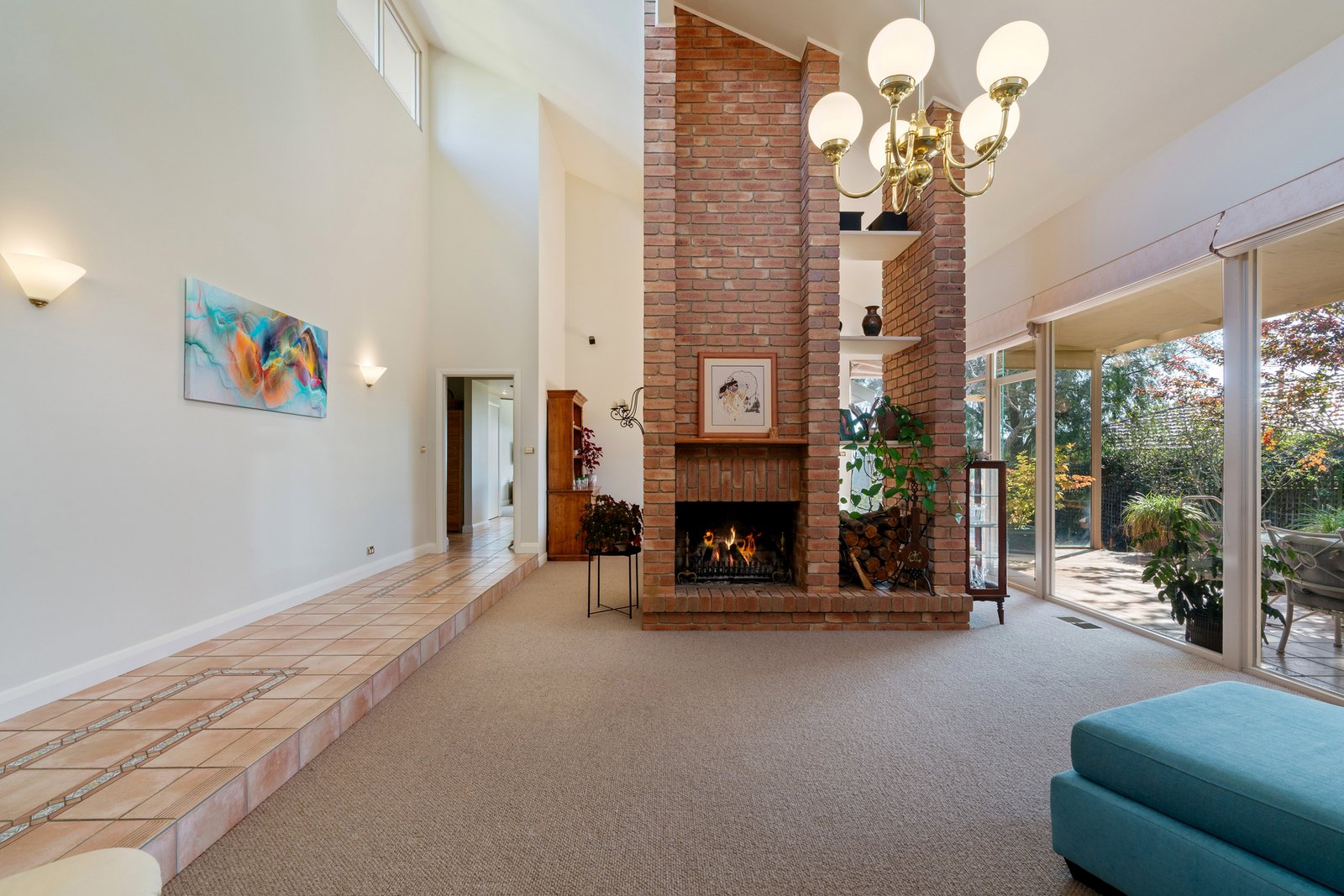 The classic facade gives nothing away about the size and light once inside, with formal living and dining rooms rising beneath vaulted ceilings, warmed by a central, exposed-brick wood-burning fireplace that separates the two spaces and draws the eye toward lush greenery beyond the oversized windows. French doors from the formal dining open to a paved alfresco with a built-in BBQ kitchen, pulling entertaining outward with ease, whilst the open-plan living and dining area, joined by a well-appointed granite-bench kitchen, captures the full bay outlook and connects to an elevated treetop balcony that puts birdsong and water views front and centre.