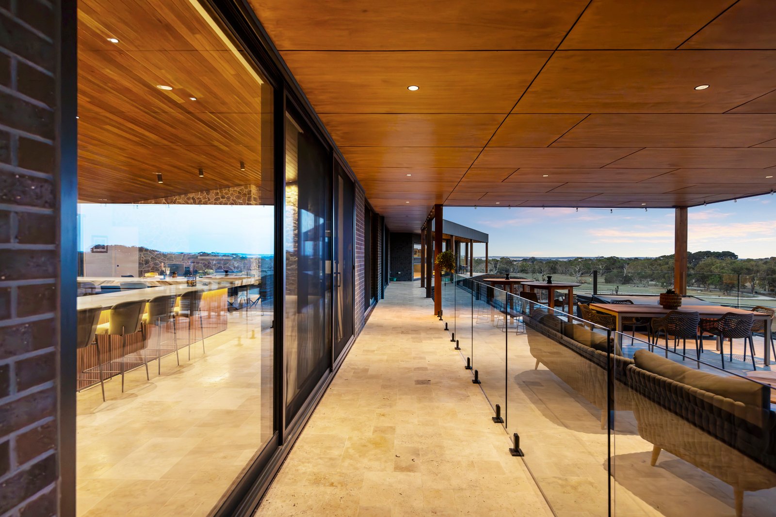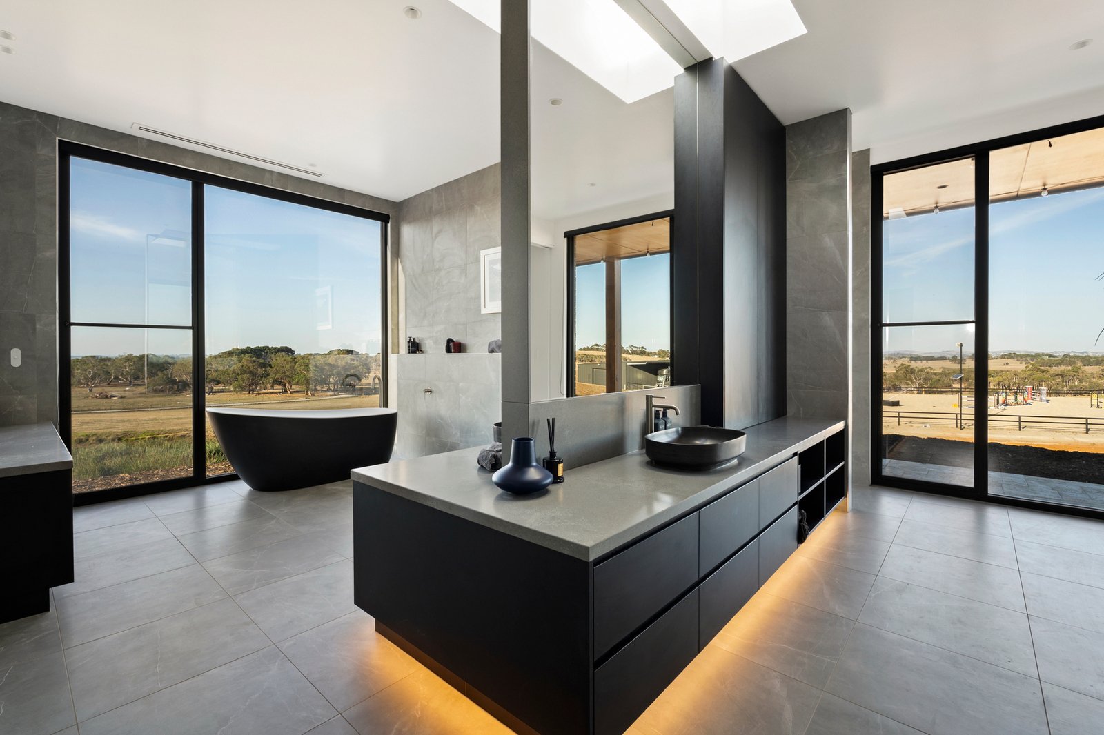 The residence itself is a study in sophisticated design, characterised by a Colorado stone exterior and interiors finished with spotted gum ceilings and French-patterned travertine. High-volume living spaces are anchored by a sunken lounge and a grand marble island kitchen, all set beneath soaring ceilings and framed by full-height glazing. An 80-meter north-facing verandah provides a seamless transition to the outdoors, while the primary suite occupies a dedicated eastern wing complete with a 14-meter robe and a freestanding bath positioned against the horizon. Every secondary bedroom is a private suite in its own right, supported by modern essentials such as underfloor hydronic heating, climate automation and an integrated bar.