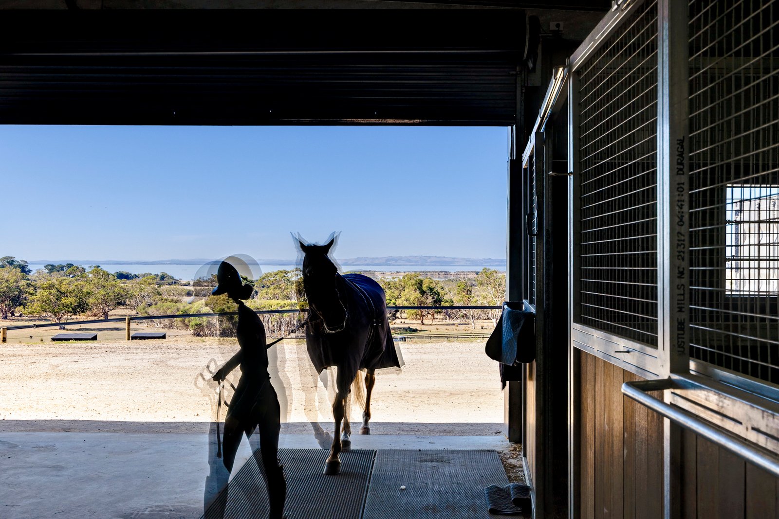 Agricultural and equestrian pursuits are catered to with infrastructure that rivals professional training facilities. A world-class equestrian complex features six rubber-lined stables, a private gym and a groom’s quarters, alongside a massive 80x40m floodlit arena. The estate’s commitment to self-sufficiency is evidenced by its sophisticated off-grid energy system, including a 50kw solar array that services the expansive 15-bay machinery shed and workshop. The land is further utilised by a premium herd of Black Angus cattle supported by high-quality Duncan Equine fencing, rotational pastures and professional working yards.