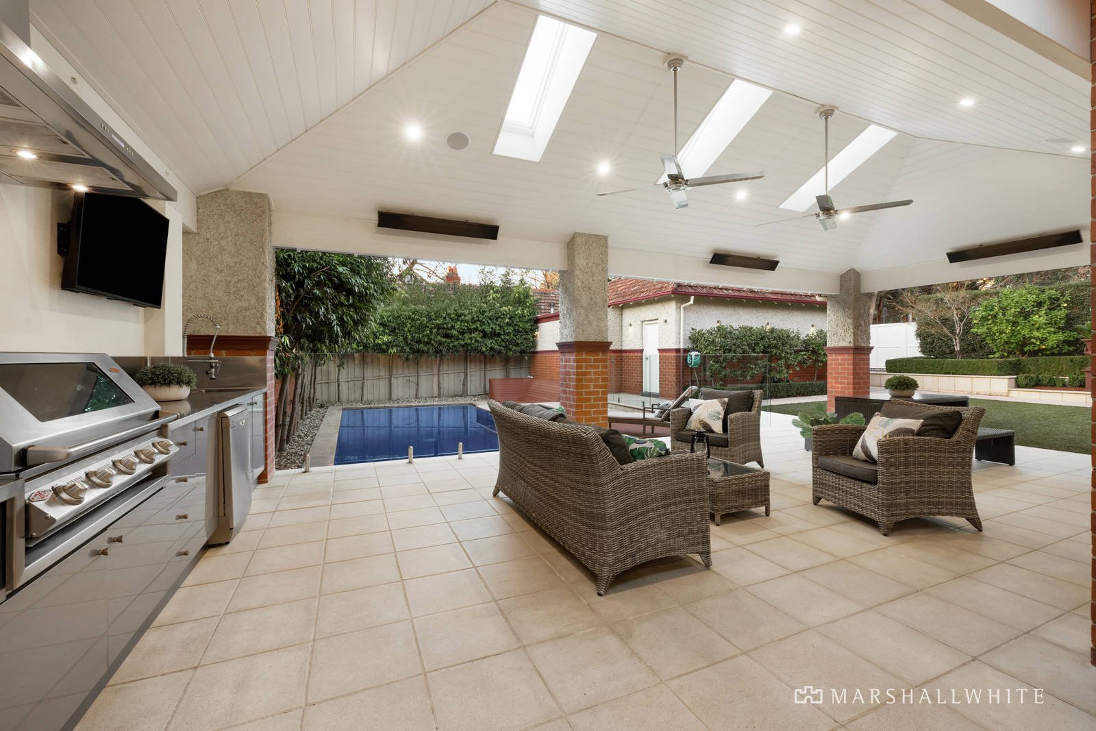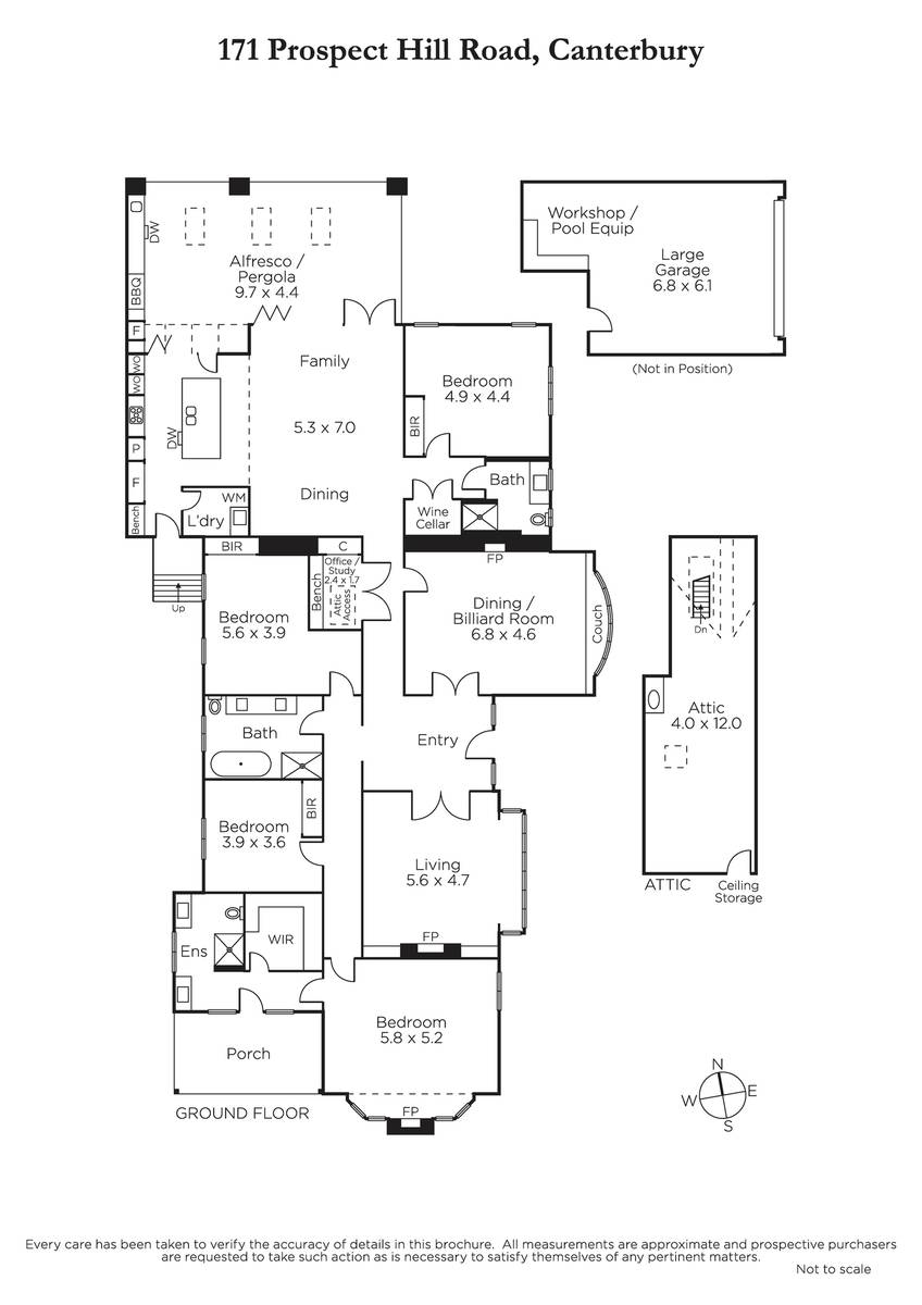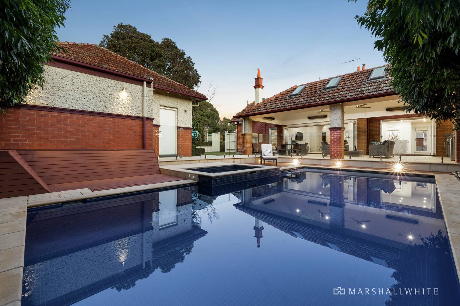 The accommodation comprises an entrance hall dividing a lovely formal sitting room with OFP and dining room with bay window (currently a billiard room); leading to four zoned bedrooms, a sumptuous main bedroom with a WIR and large ensuite, two sparkling family bathrooms and a study alcove with access to an attic studio, recreation room or teenage accommodation. The superb north-facing family domain includes a cellar and sleek marble and prestige Miele equipped kitchen with adjacent laundry. Opening to a covered terrace with overhead heaters and fans plus a full stainless steel barbeque kitchen overlooking private rear garden and solar heated azure blue pool and spa. Providing wonderful amenities for year round family relaxation and entertaining. Other features include video intercom, alarm, ducted heating and cooling, surround sound, auto gates and double garage with access from Logan Street.