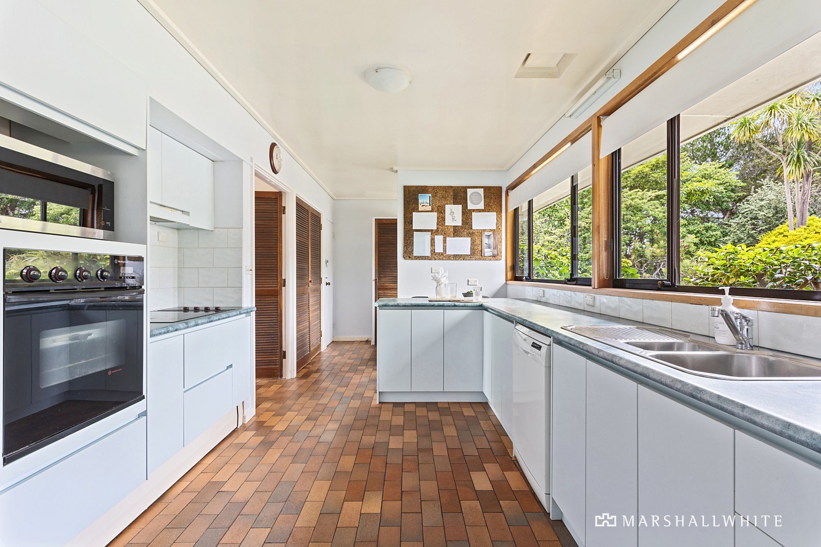 The single-level circa 1960s home has been designed around the central pool and alfresco area, with large picture windows to capture the far-reaching views towards the Bay. With two living areas, a classic bedroom wing featuring four bedrooms fitted with built-in robes and desks, two adjoining bathrooms, and a zoned master bedroom with glass sliding doors opening to the alfresco terrace and pool, the home is perfectly comfortable for family living right now, while planning future renovation or restoration. (STCA). The kitchen is fitted with a Westinghouse oven, electric cooktop and dishwasher, and adjoins the laundry, which could easily serve as a butler's pantry, and there is also an additional sunroom/sitting room with a side entry door.
