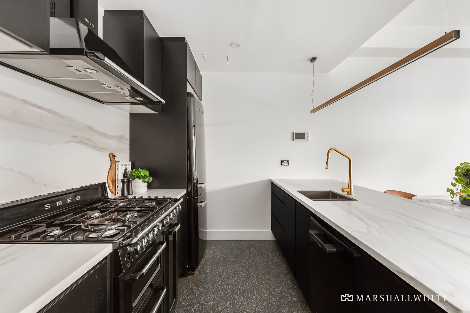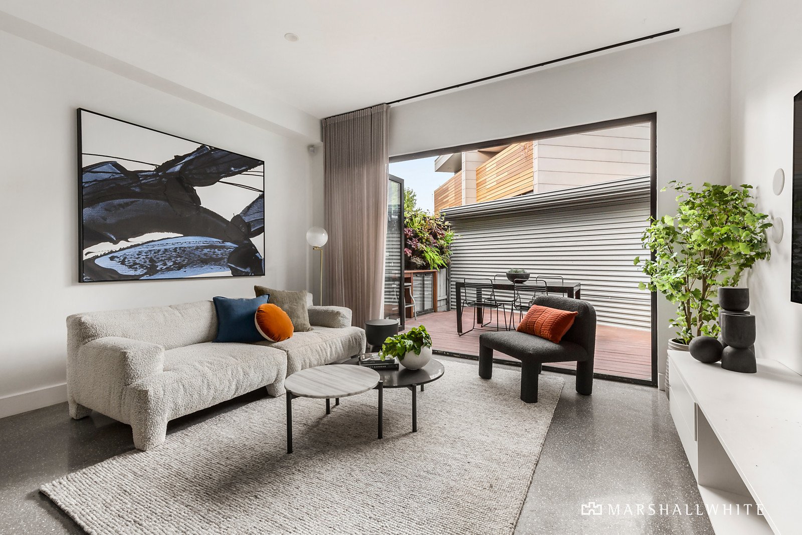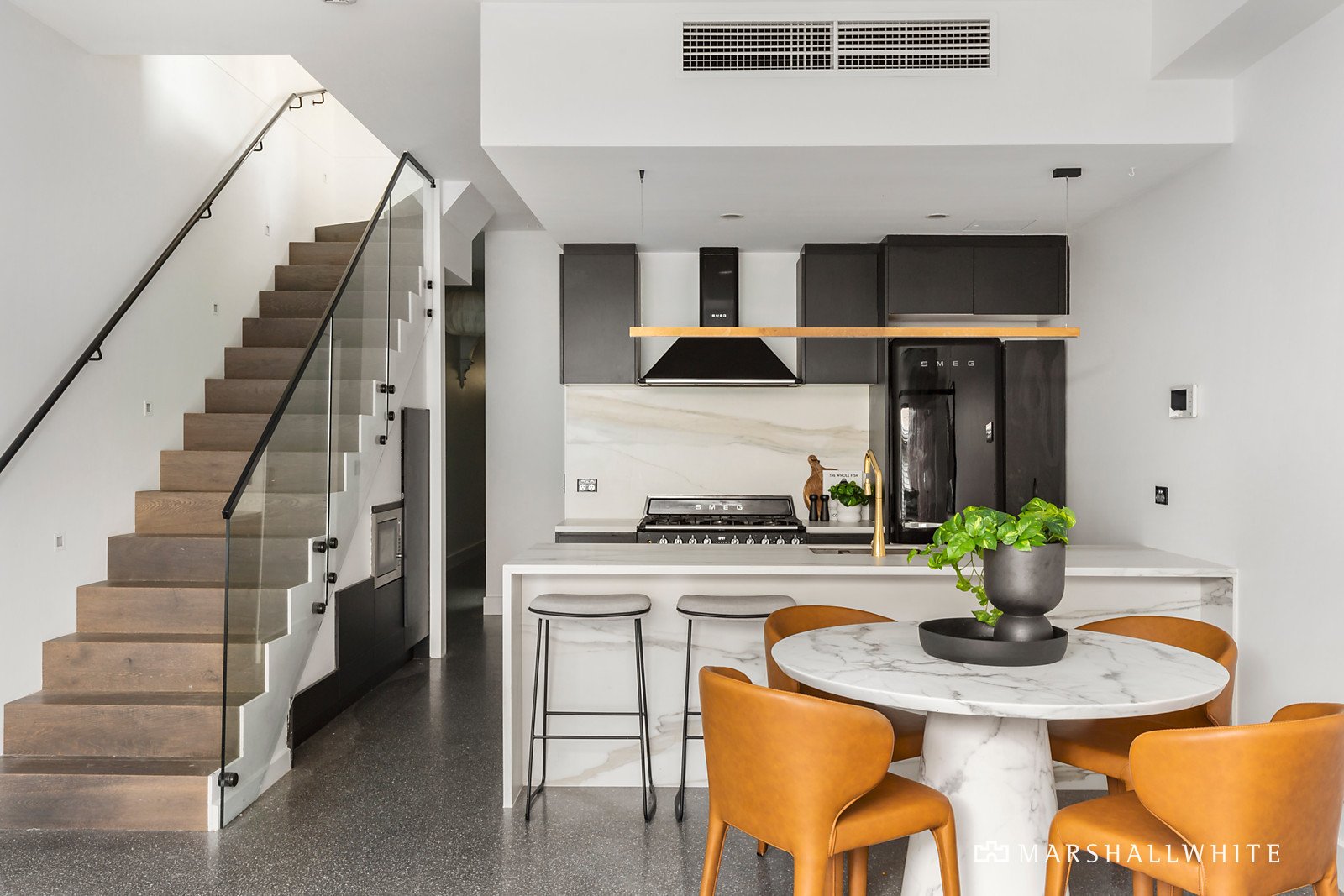 Polished concrete floors add contemporary refinement to the classic arched hall, two gorgeous bedrooms with built in robes and a stylish bathroom. Upstairs, timber floors flow through a home office with north-facing roof top terrace and the main bedroom with walk in robe, designer en suite and private balcony. The expansive light-filled open plan living and dining room with a sleek gourmet kitchen boasting stone benches and a 90cm Smeg oven open through bi-fold doors to a private decked courtyard with built in bar, bar-fridges.