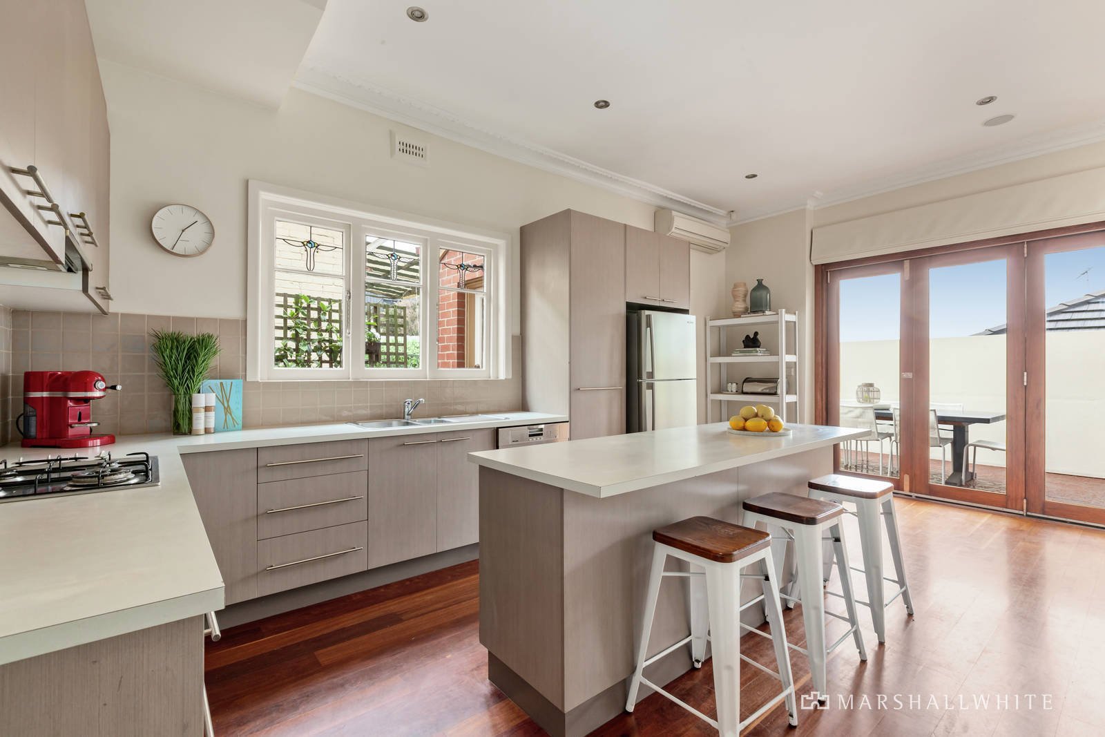 Behind the classic exterior, ornate ceilings, leadlight windows and timber floors reflect the period charm in the central hall and gracious sitting room with an open fire and French doors to the leafy side garden. The superbly appointed Miele kitchen and inviting family living and dining room are bathed in natural light and open through bi-fold doors to a large north-facing deck, ideal for outdoor dining. The gorgeous main bedroom with walk in robe and chic en suite is downstairs with a second bedroom with built in robe, a fitted home office and stylish bathroom. Upstairs there are two additional bedrooms with robes, a designer bathroom and large retreat with desk.