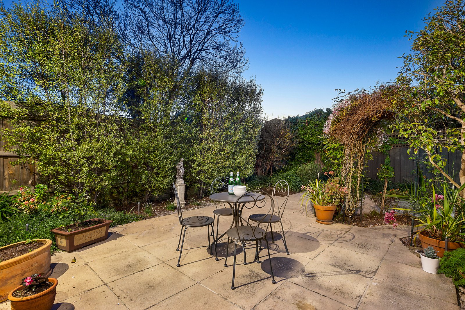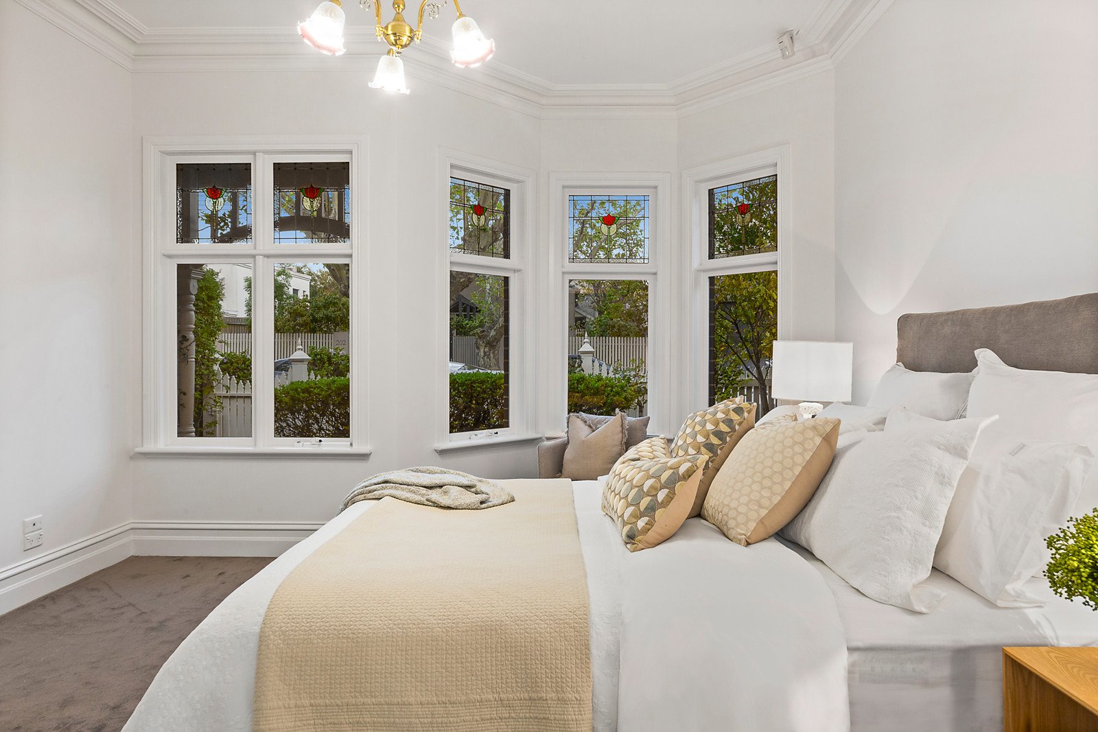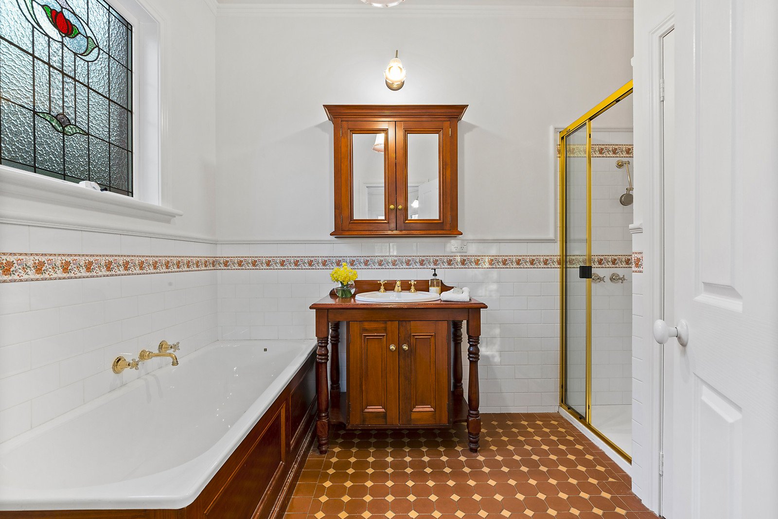 High ceilings add to the scale of the arched hall and the exceptionally generous formal room with an open fire. Timber floors flow through the light-filled open plan living and dining room with an open fire and gourmet European marble kitchen. The living spaces open to a private northwest garden, a leafy oasis for outdoor dining. Featuring a bay window, the main bedroom with period style en suite and walk in robe is matched by two additional bedrooms with built in robes and a second bathroom.