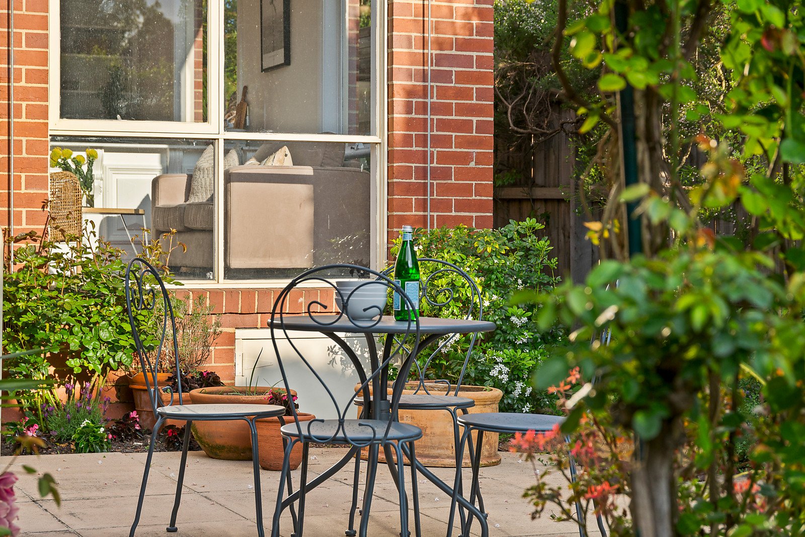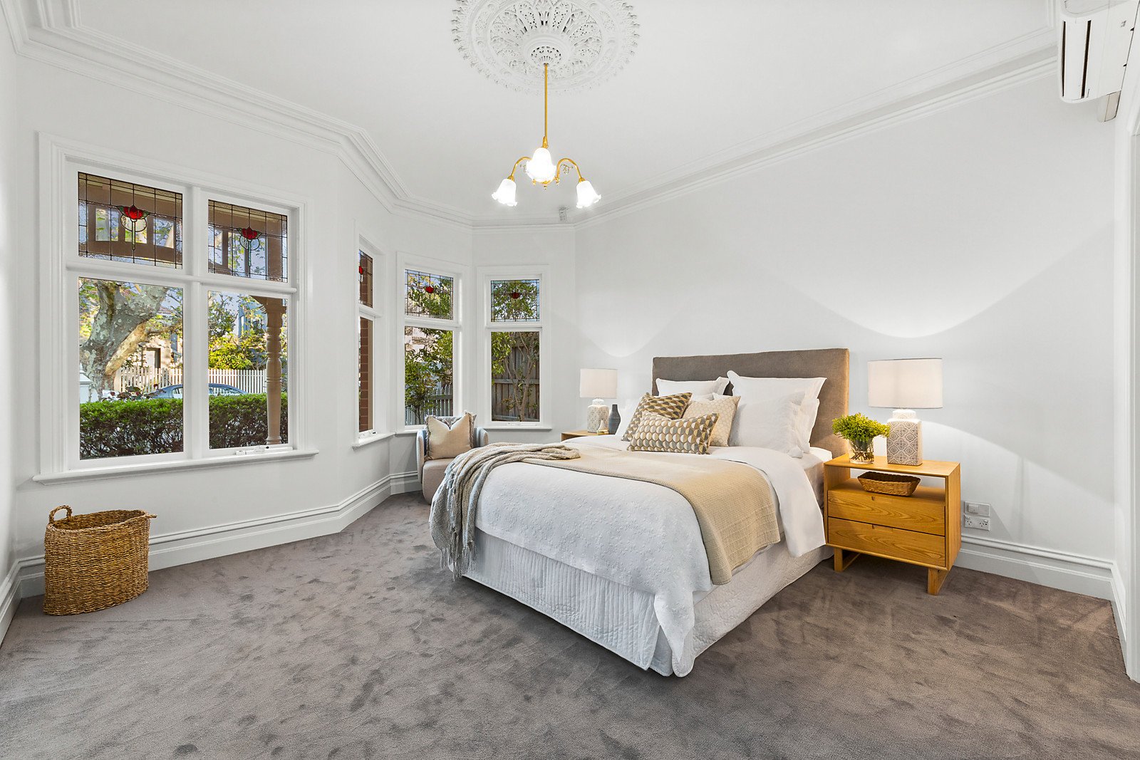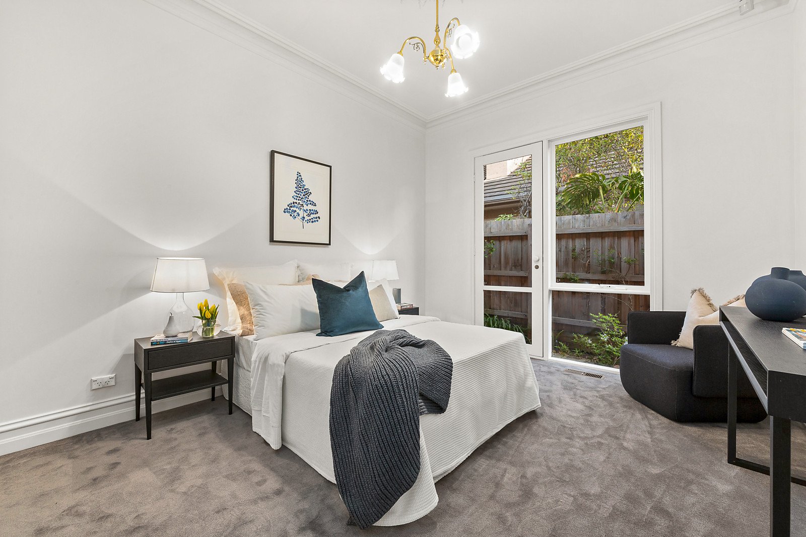 High ceilings add to the scale of the arched hall and the exceptionally generous formal room with an open fire. Timber floors flow through the light-filled open plan living and dining room with an open fire and gourmet European marble kitchen. The living spaces open to a private northwest garden, a leafy oasis for outdoor dining. Featuring a bay window, the main bedroom with period style en suite and walk in robe is matched by two additional bedrooms with built in robes and a second bathroom.