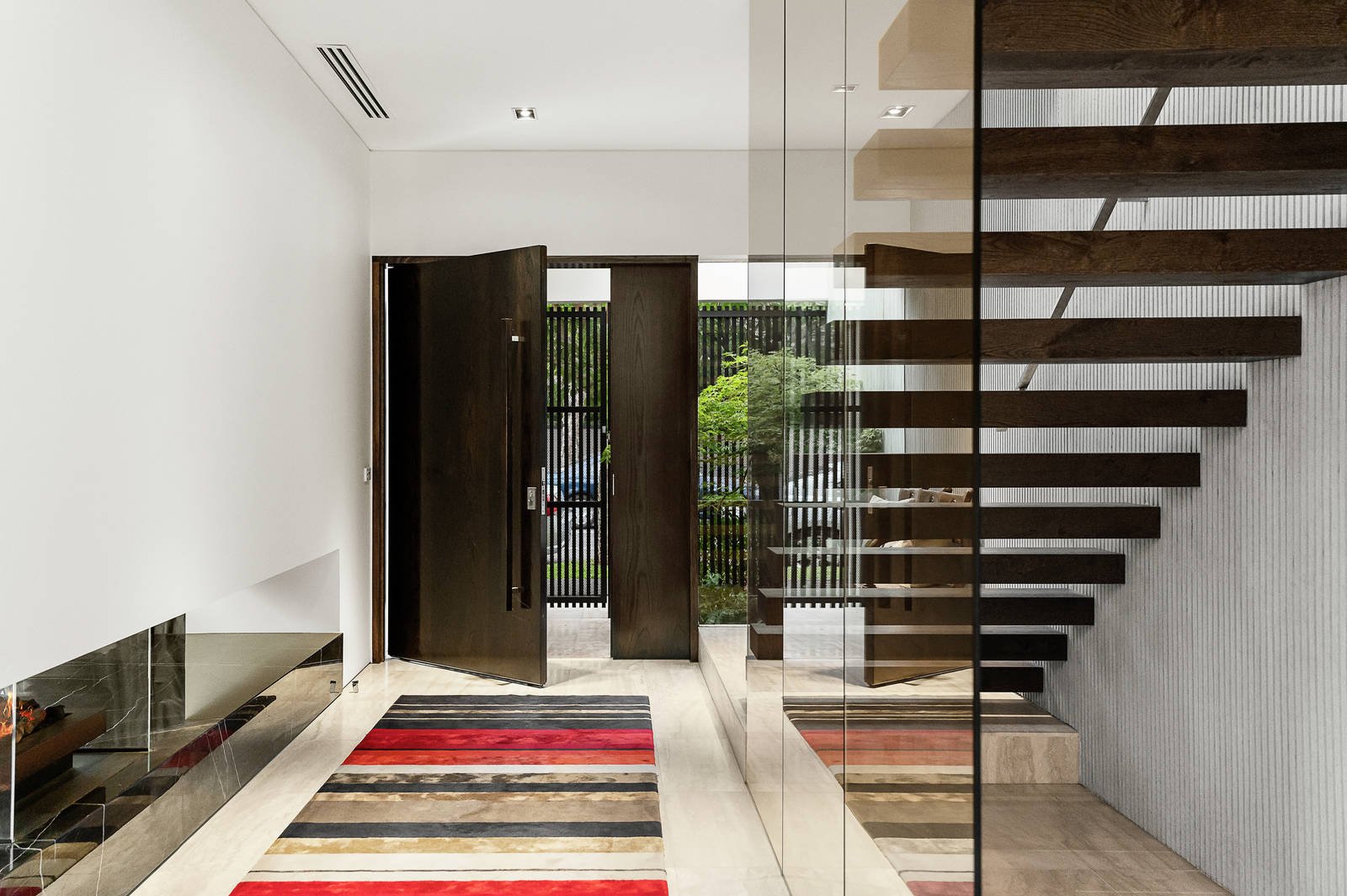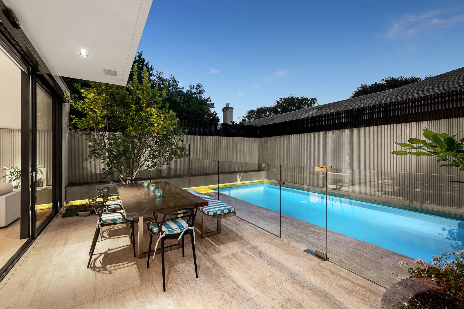 If luxury, quality and position are important to you, look no further than this show stopping architectural masterpiece. Casted in sunshine, and over scaled windows allow maximum daylight to play upon floors of creamy travertine, where walls of pre-cast concrete and ceilings of soaring heights create a simplicity of line, then this property by Simon Stokes Architects may be your next home. Black window frames are prim and sleek against pre-cast walls of solid concrete, an element which repeats internally and externally.
