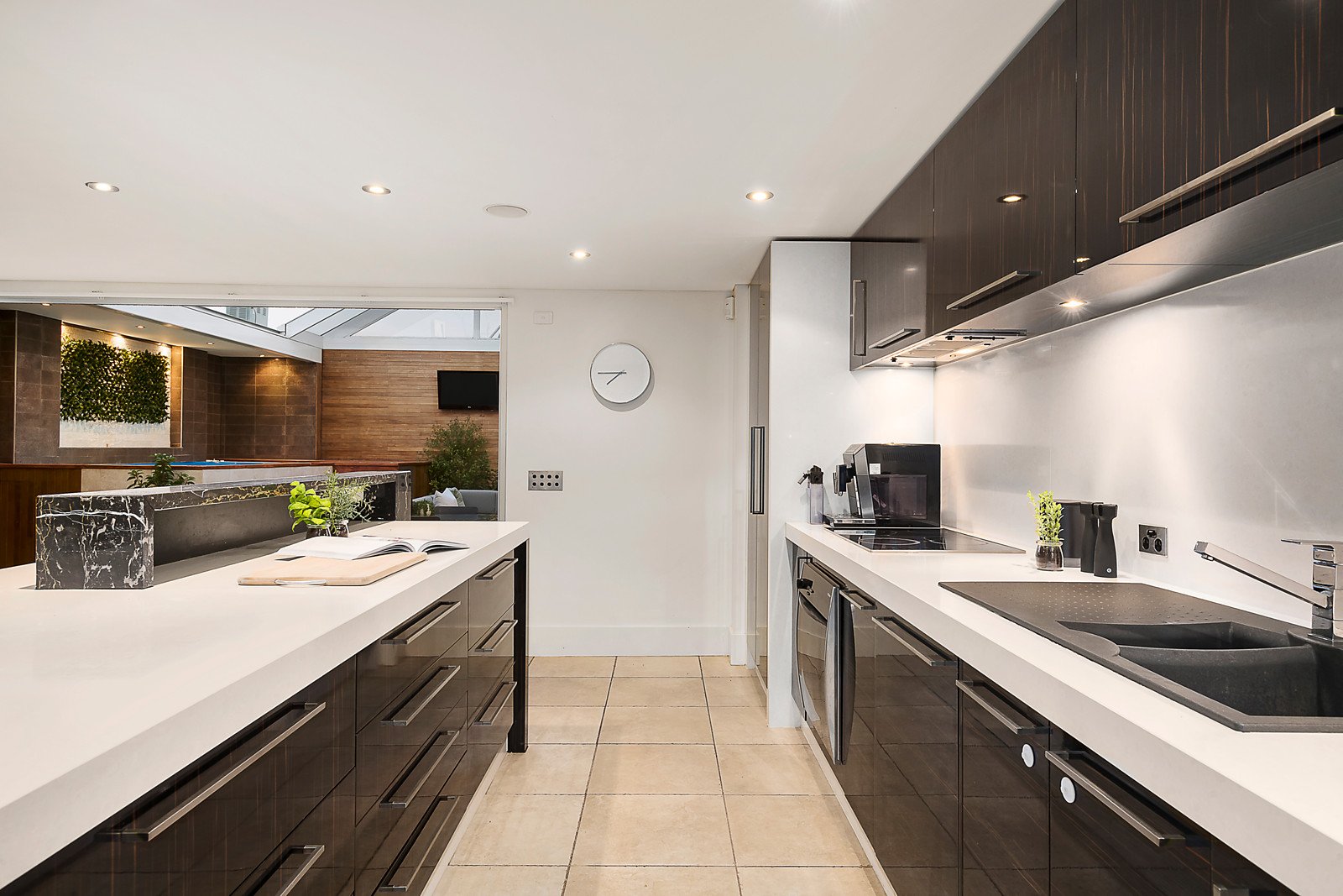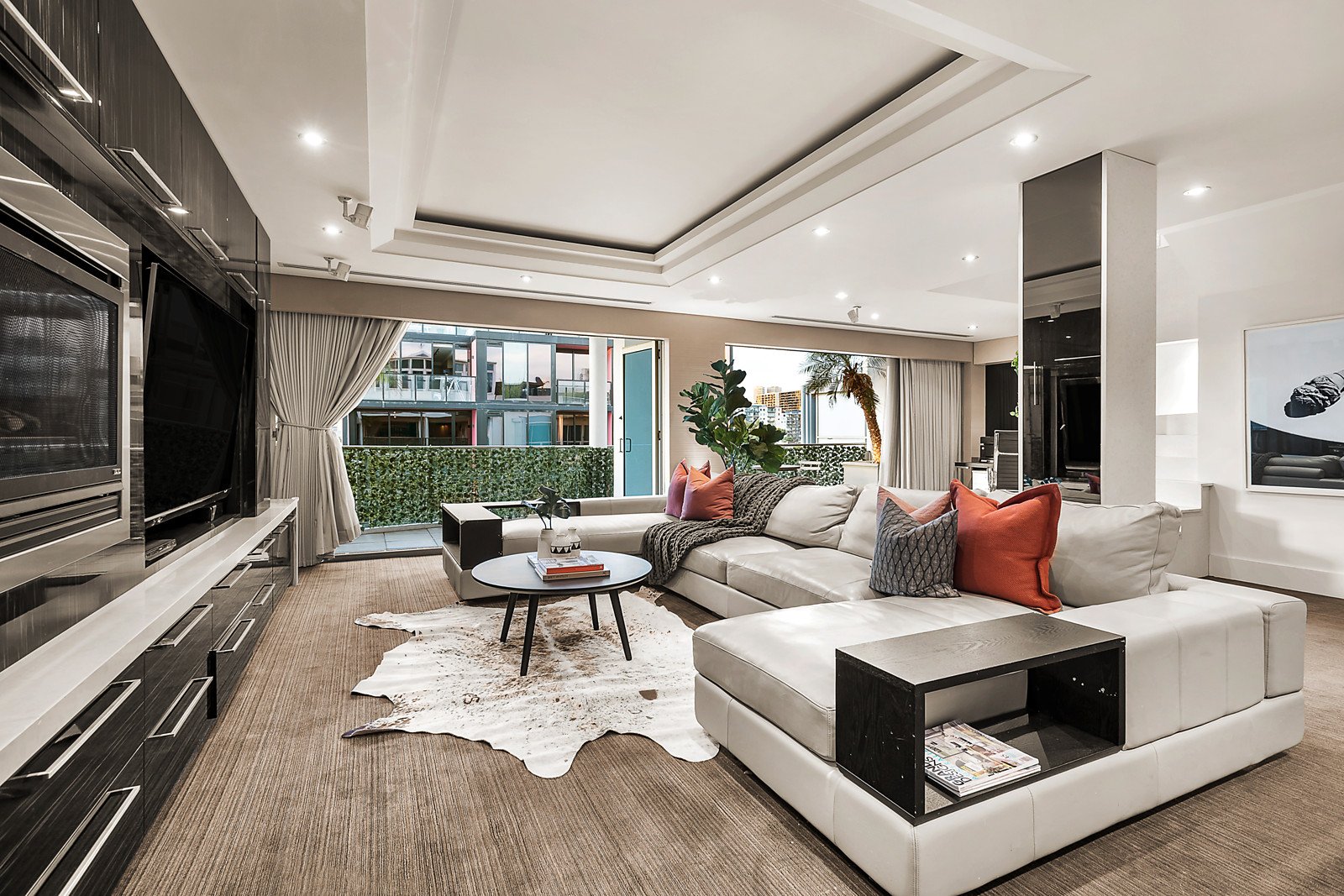 A stunning foyer leads through to a spectacular entertaining room with a wet bar fitted with numerous bar fridges and integrated fridge/freezer, a dining zone, study nook and expansive living area with gas log fire all opening to a wide covered northwest balcony. A white stone staircase ascends to a gourmet kitchen appointed with Caesar stone benches and a second spacious living and dining room. Bi-fold doors open to a remarkable alfresco space beneath a retractable glass roof with heated pool, sauna and a deluxe entertainer's kitchen complete with BBQ, hotplates, Teppanyaki grill, pizza oven, commercial grade storage and wine/drinks fridges. Generous family accommodation comprises a gorgeous main bedroom with opulent en-suite and built in robe, a second bedroom with en-suite/bathroom and built in robe and two additional bedrooms.