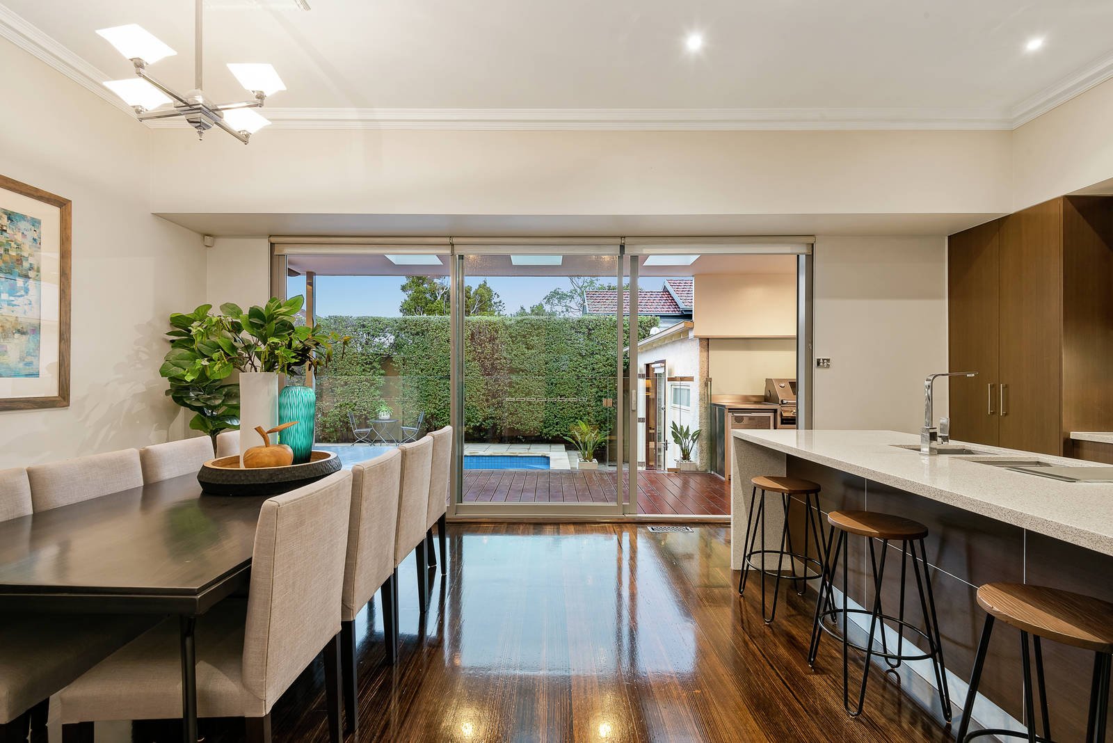 Beyond an immaculate façade and landscaped gardens, gloriously high decorative ceilings, polished hardwood floors, diamond pane leadlight glass and timber features throughout define this impeccable domain. A generously proportioned living space complete with Heat & Glo gas fireplace, adjoins light filled dining and an ultra stylish kitchen boasting stone benches, glass splashback, plentiful storage and Blanco stainless steel appliances including dishwasher, double oven and gas cooktop. At the rear, an alfresco dining area with built in barbecue and outdoor kitchen overlooks a sparkling salt water solar and gas heated swimming pool and spa, so you can entertain and relax in style.