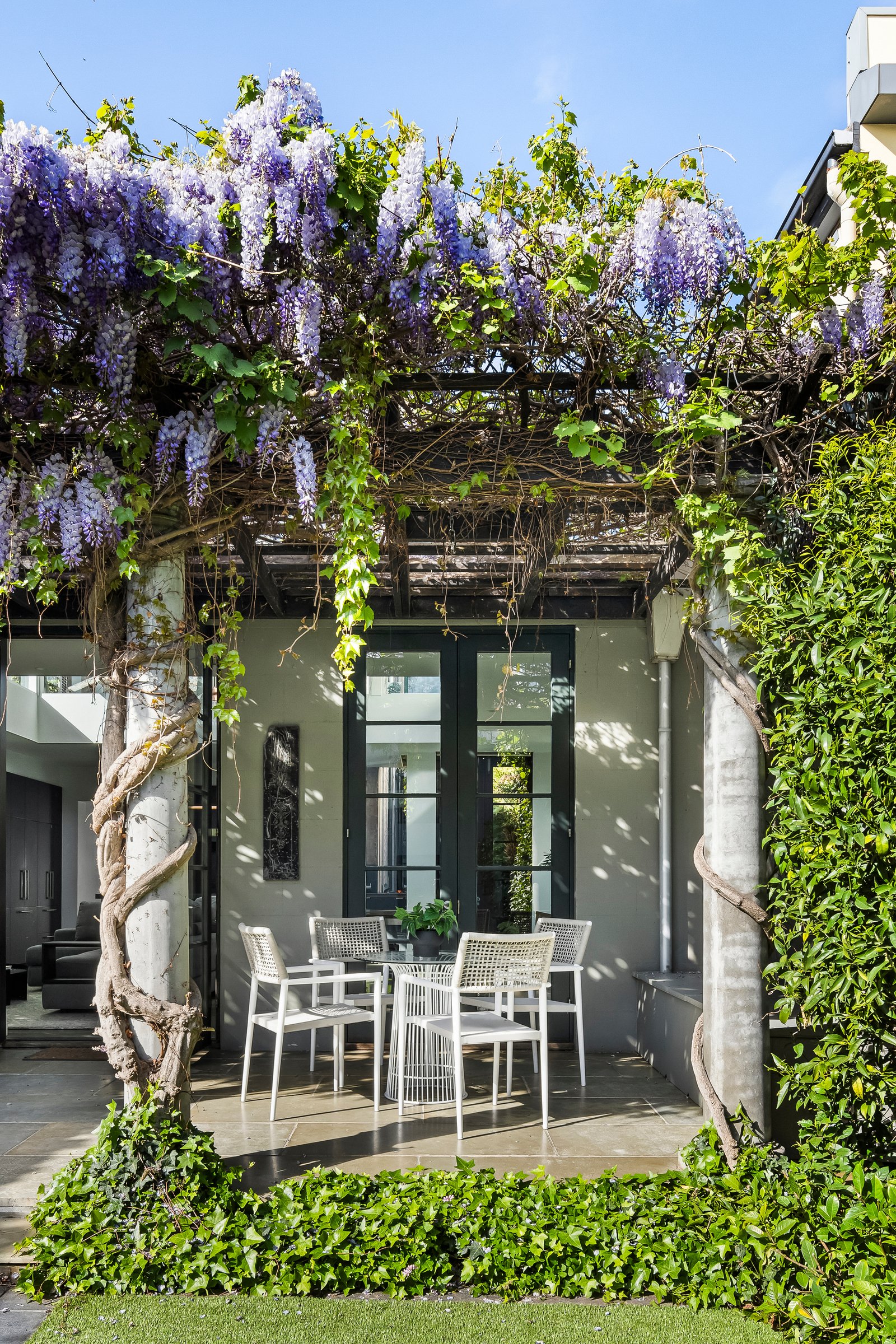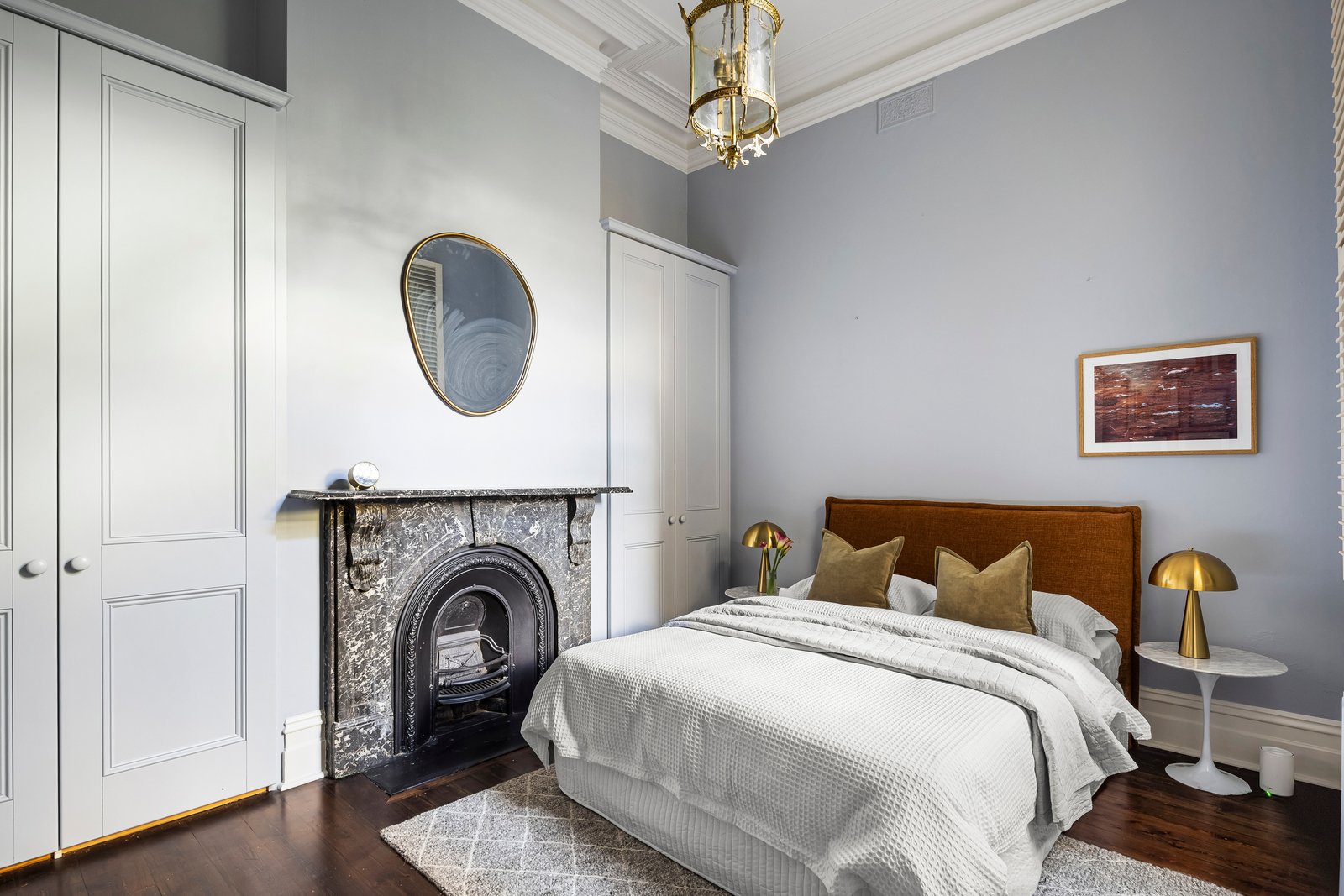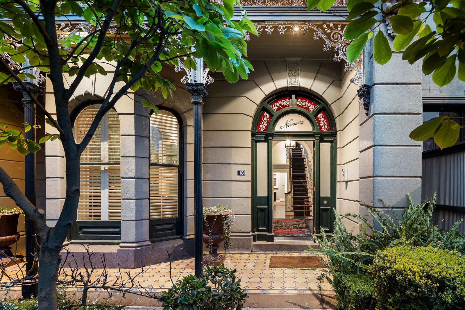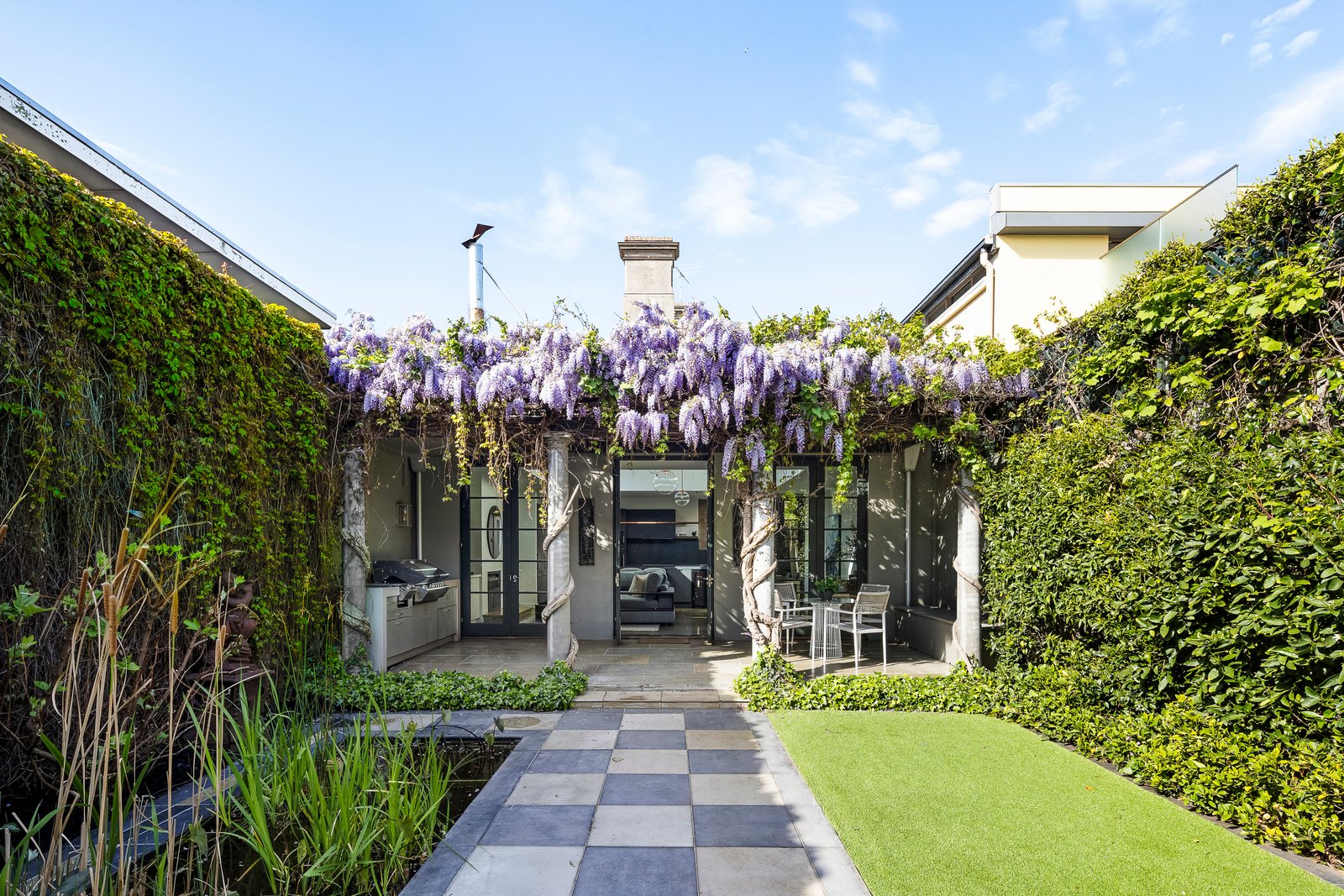 Set well back from the street and replete with gracious period detail, the signature ‘Nirvana’ signage signals the transition indoors, revealing soaring high ceilings, Baltic pine flooring and exquisite proportions crowned with grand arches. A refined sitting room with bespoke imported wallpaper in rich blue hues and an Italian marble fireplace forms a striking introduction to the layout. Past a ground floor bedroom, a central dining hall/ library extends to the inviting side garden with a tranquil water feature before extending into the rear open-plan living and dining areas, where entertainment is shrouded in lush greenery and natural light. High raised ceilings with clerestory windows allow the sun to permeate throughout the day, with banks of French doors revealing a wisteria-clad verandah and paved courtyard, serene and entirely private, with a water feature and plumbed BBQ for al-fresco entertaining.