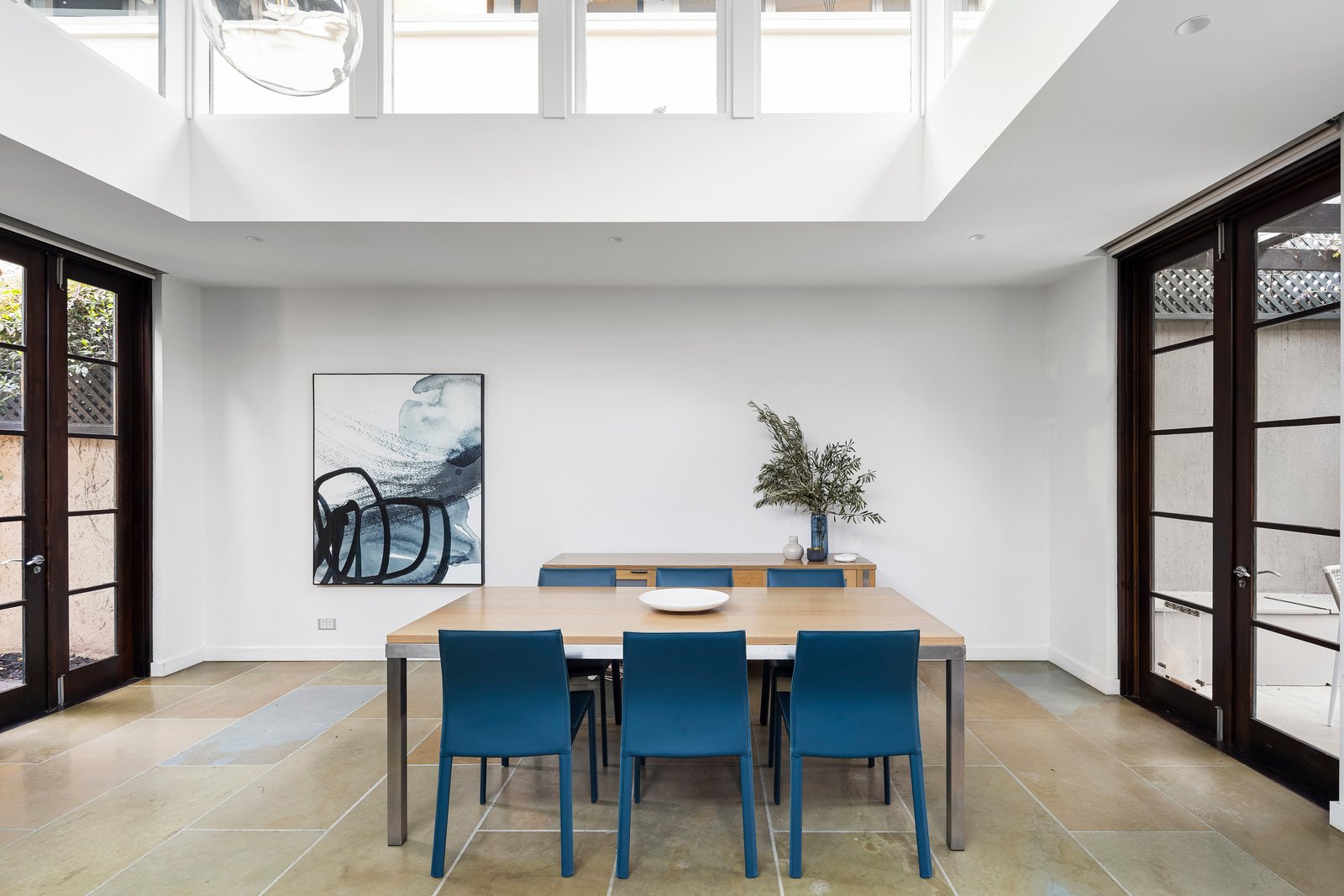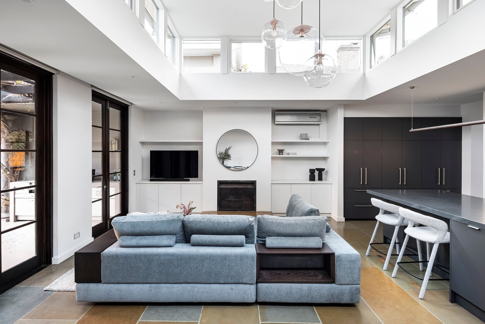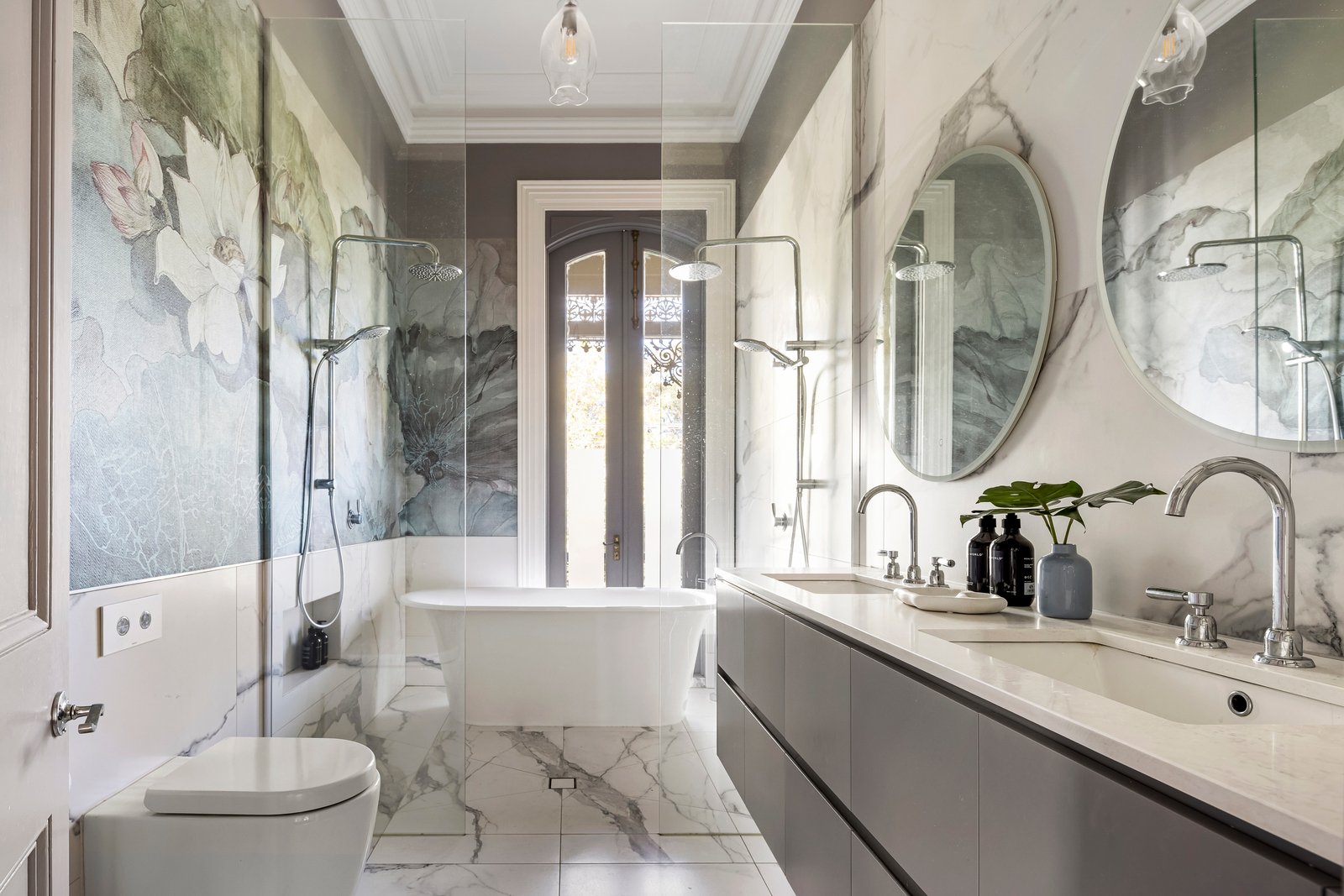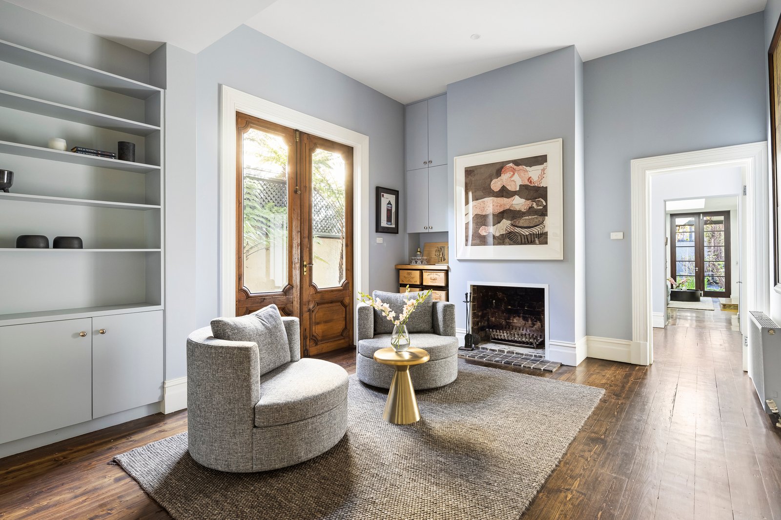 Set well back from the street and replete with gracious period detail, the signature ‘Nirvana’ signage signals the transition indoors, revealing soaring high ceilings, Baltic pine flooring and exquisite proportions crowned with grand arches. A refined sitting room with bespoke imported wallpaper in rich blue hues and an Italian marble fireplace forms a striking introduction to the layout. Past a ground floor bedroom, a central dining hall/ library extends to the inviting side garden with a tranquil water feature before extending into the rear open-plan living and dining areas, where entertainment is shrouded in lush greenery and natural light. High raised ceilings with clerestory windows allow the sun to permeate throughout the day, with banks of French doors revealing a wisteria-clad verandah and paved courtyard, serene and entirely private, with a water feature and plumbed BBQ for al-fresco entertaining.