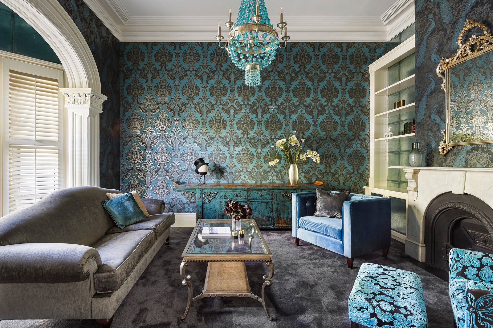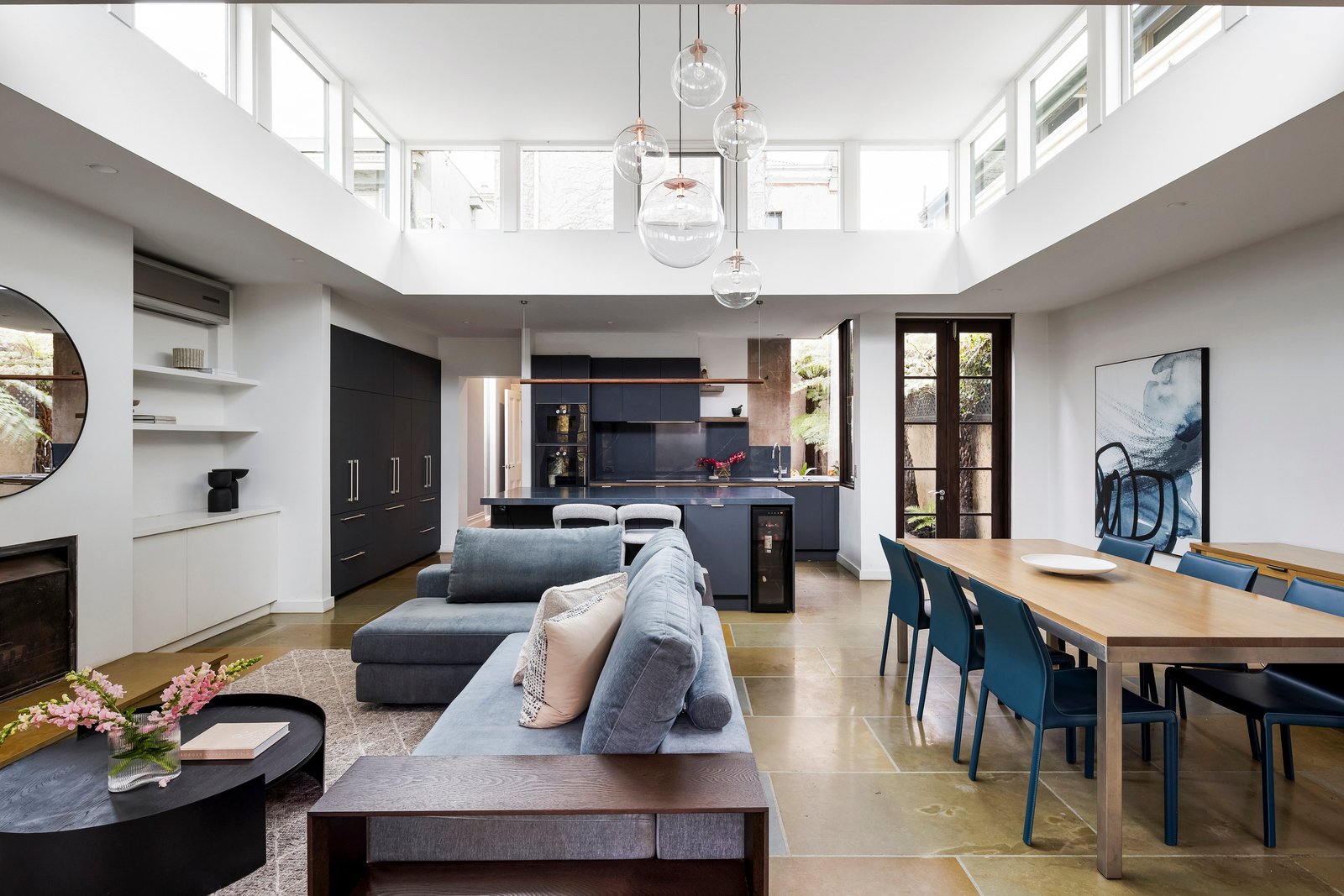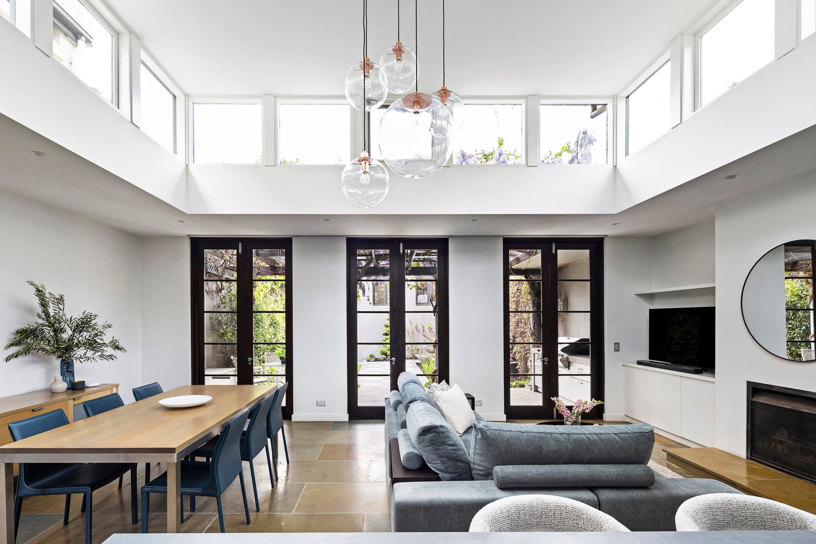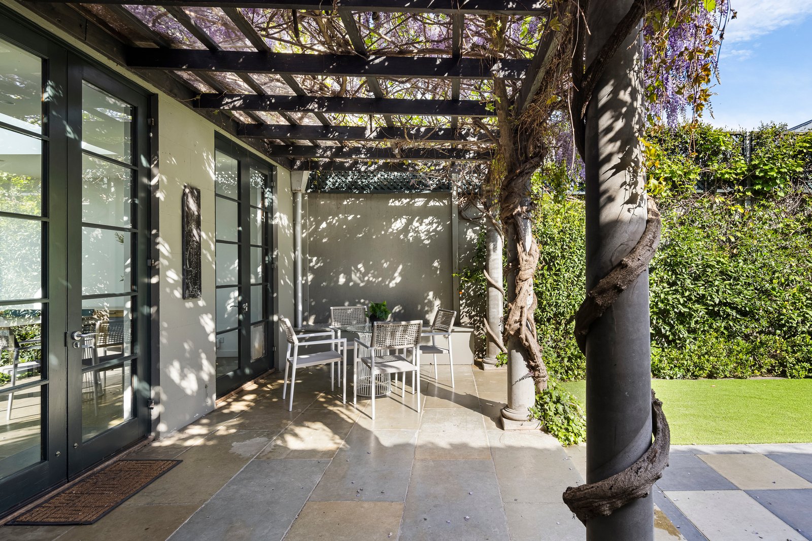 Set well back from the street and replete with gracious period detail, the signature ‘Nirvana’ signage signals the transition indoors, revealing soaring high ceilings, Baltic pine flooring and exquisite proportions crowned with grand arches. A refined sitting room with bespoke imported wallpaper in rich blue hues and an Italian marble fireplace forms a striking introduction to the layout. Past a ground floor bedroom, a central dining hall/ library extends to the inviting side garden with a tranquil water feature before extending into the rear open-plan living and dining areas, where entertainment is shrouded in lush greenery and natural light. High raised ceilings with clerestory windows allow the sun to permeate throughout the day, with banks of French doors revealing a wisteria-clad verandah and paved courtyard, serene and entirely private, with a water feature and plumbed BBQ for al-fresco entertaining.