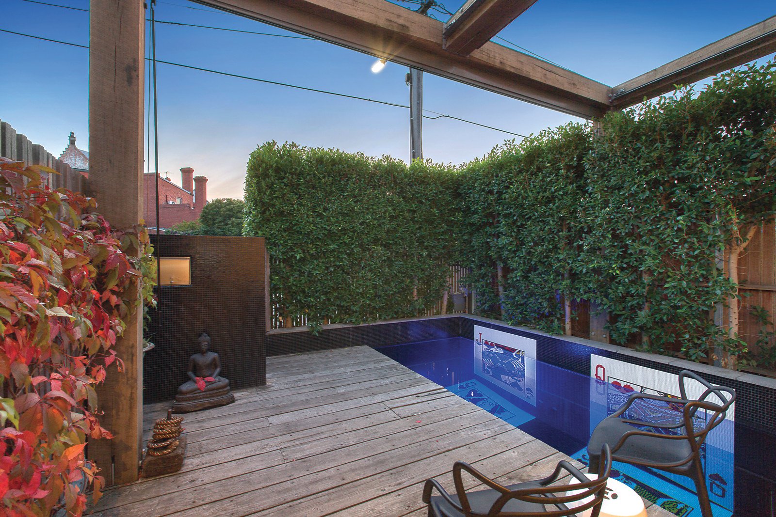 Wide oak floors and high ceilings flow through the expansive living room with open fireplace and fitted study opening to a private decked northwest-facing forecourt with a spectacular mosaic tiled heated plunge pool. Brilliantly designed for year round entertaining, the gourmet kitchen boasting a Paul Bocuse double oven features a 12 seat marble dining table that extends out through bi-fold doors to the private bluestone terrace. The main bedroom with lavish designer ensuite and built in robe is on its own level while two additional double bedrooms with built in robes and a balcony share a stylish bathroom.