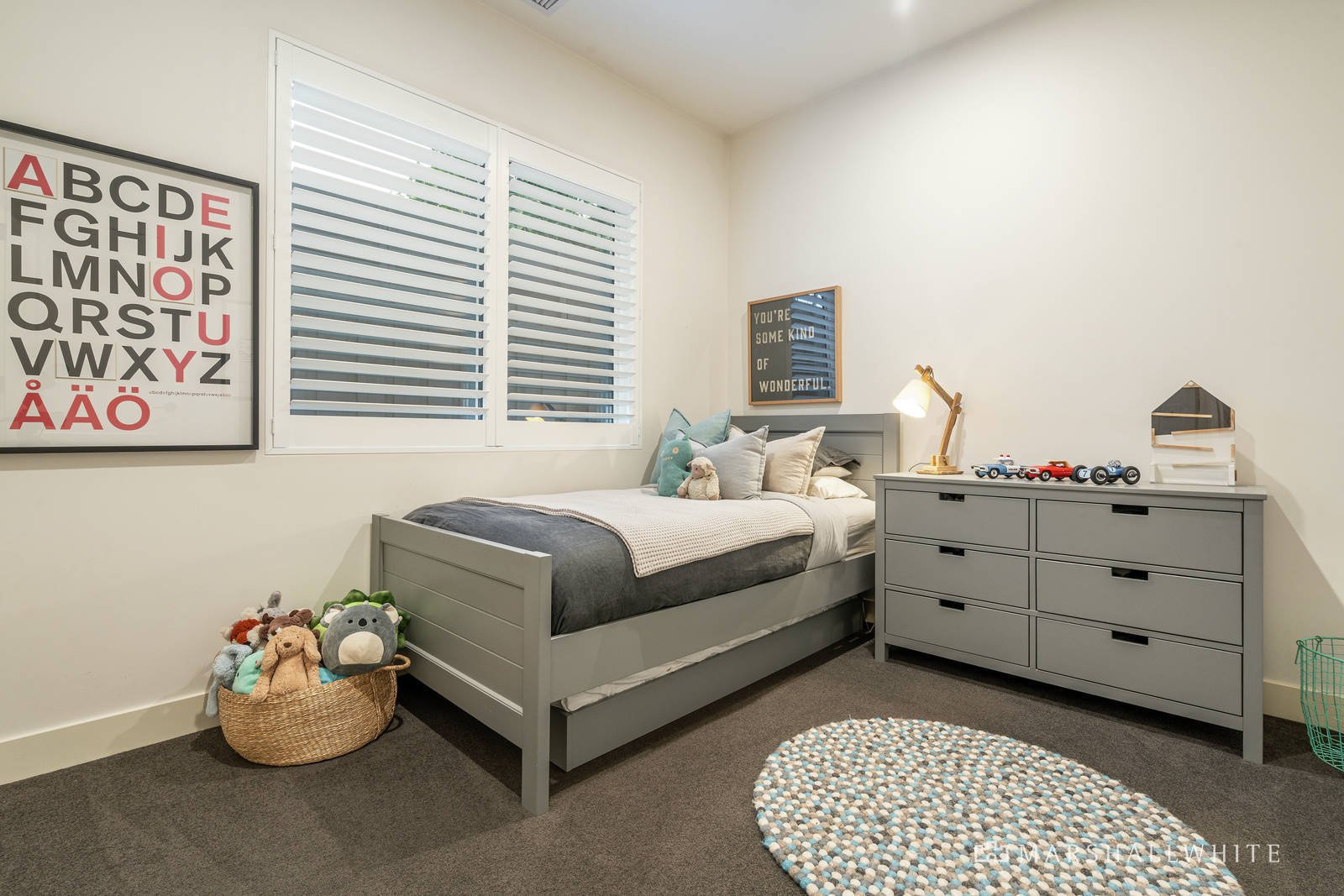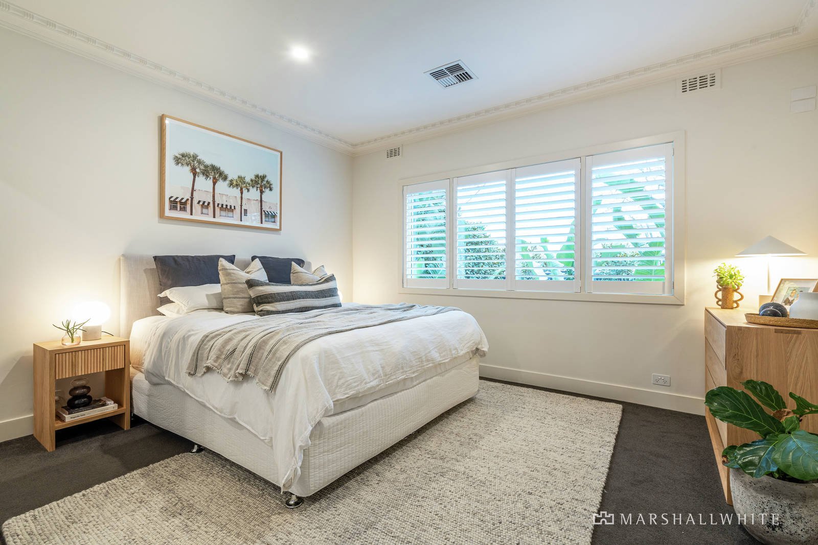 Bespoke soft-close cabinetry, plantation shutters, natural stone, as well as timber and concrete flooring add zing and warmth to the crisp white interiors at this family haven.