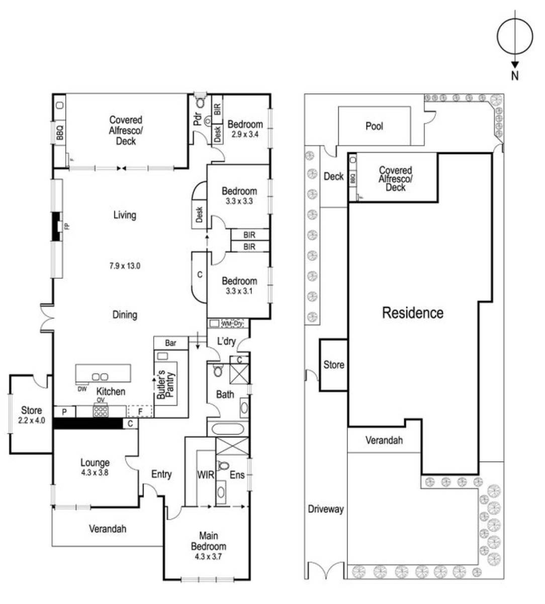 The kitchen features a grand 3 metre-wide Caesarstone island bench top and a smoky mirrored glass splashback reflecting the pool and outdoor tropical plants. A 900mm Smeg oven and cooktop, Blum soft-closing cabinetry and butler's pantry with a second sink overlooks the expansive living domain where natural stone-finished floating cabinets flank the impressive Escea gas fireplace. The living connects seamlessly to the sheltered alfresco deck creating a sense of continuity from inside to outside, with a brand new fully equipped built-in BBQ kitchen overlooking the pool and gardens.