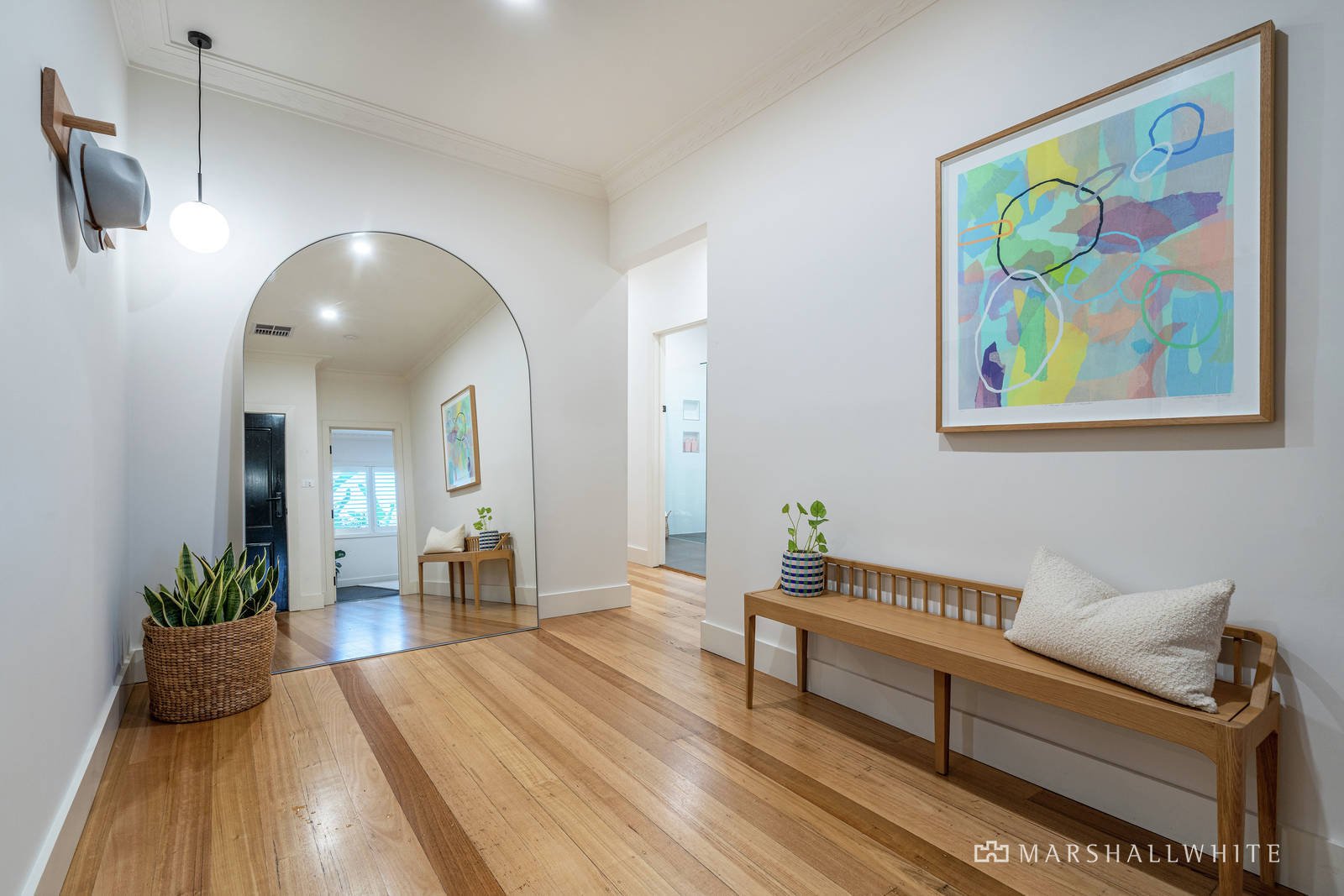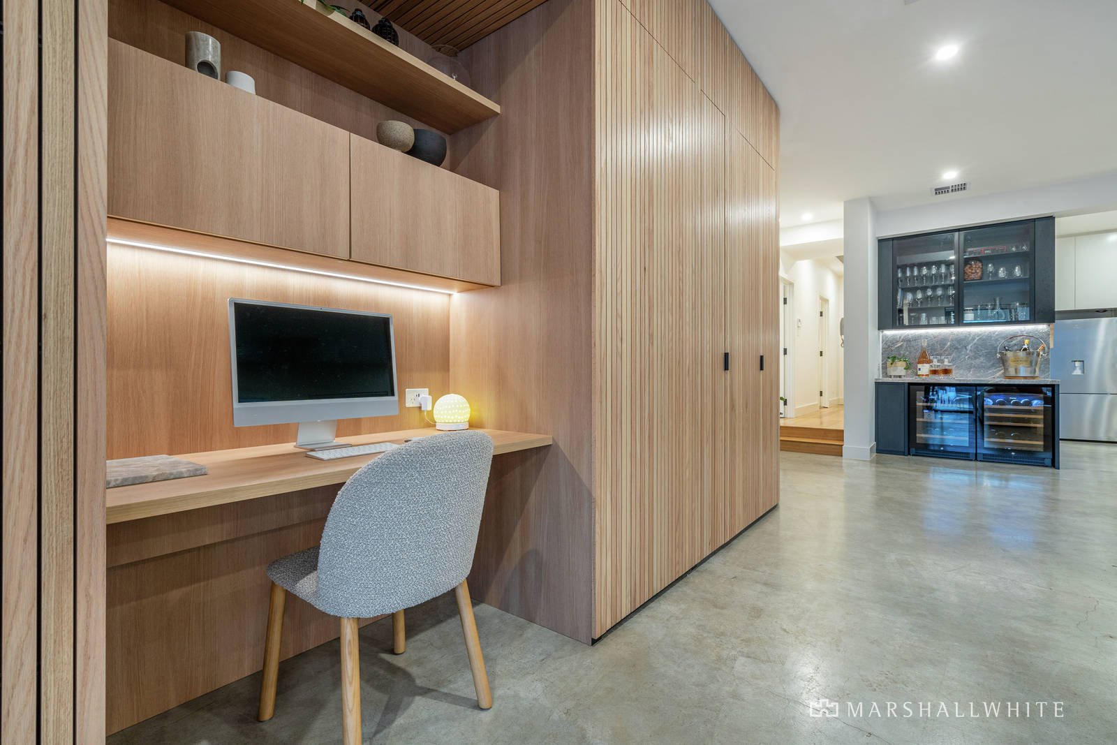 A harmonious and versatile floorplan features thoughtfully designed spaces including a striking curved wall of custom-built American oak cabinetry with storage, study nook and a "secret door" revealing a children's wing with two robed bedrooms, plus study / fourth-bedroom at the rear of the home.