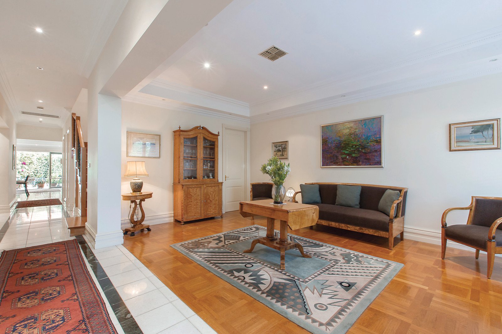 Impressively appointed with marble and parquetry floors and featuring high ceilings, an inviting contemporary elegance distinguishes the generous sitting room with fitted study and formal dining with marble open fireplace. The gourmet kitchen boasting stone benches and Smeg appliances and the expansive living and dining room open to a covered terrace overlooking a large leafy courtyard. The beautiful main bedroom with marble en-suite and walk in robe is complemented by two fitted double bedrooms, a spacious retreat and two marble bathrooms.