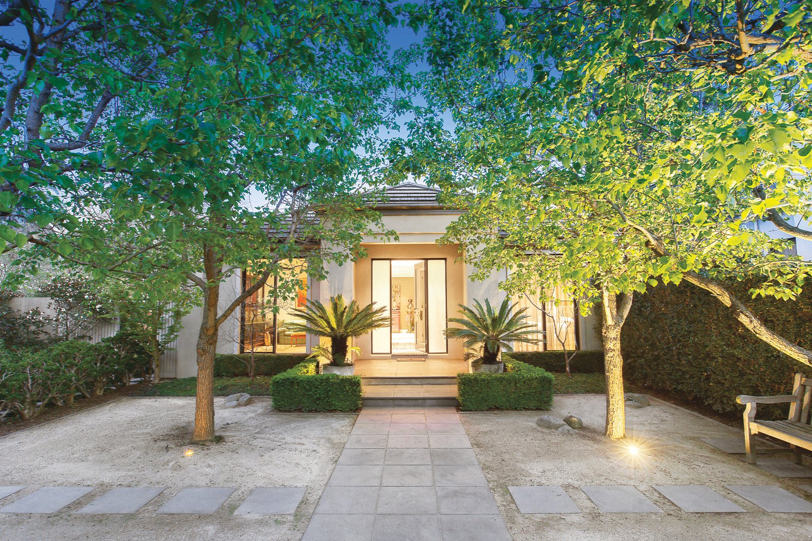 The flowing floor-plan was carefully designed to deliver loads of northern winter sunshine plus lush and leafy vistas of a courtyard garden and the soaring mature trees in the adjacent gardens. A wide tiled entrance hall leads to a main bedroom with dual WIRs and fully-tiled ensuite, a study/home theatre or third bedroom if desired; through to a well-equipped timber, granite and Miele kitchen plus an expansive living and dining room with glass wall opening to a paved and partially covered outdoor living and entertaining area with a water feature and gas mains barbeque - perfect for year round relaxation and dining. At the rear is a second zoned bedroom with BIRs, a pristine fully-tilled family bathroom, powder room, laundry and storeroom. Other features include intercom entry, alarm, floor heating and split-system air conditioning, surround sound, double glazed tinted windows, plenty of internal storage, rain water tanks with drip system and remote double garage+storage with secure internal access