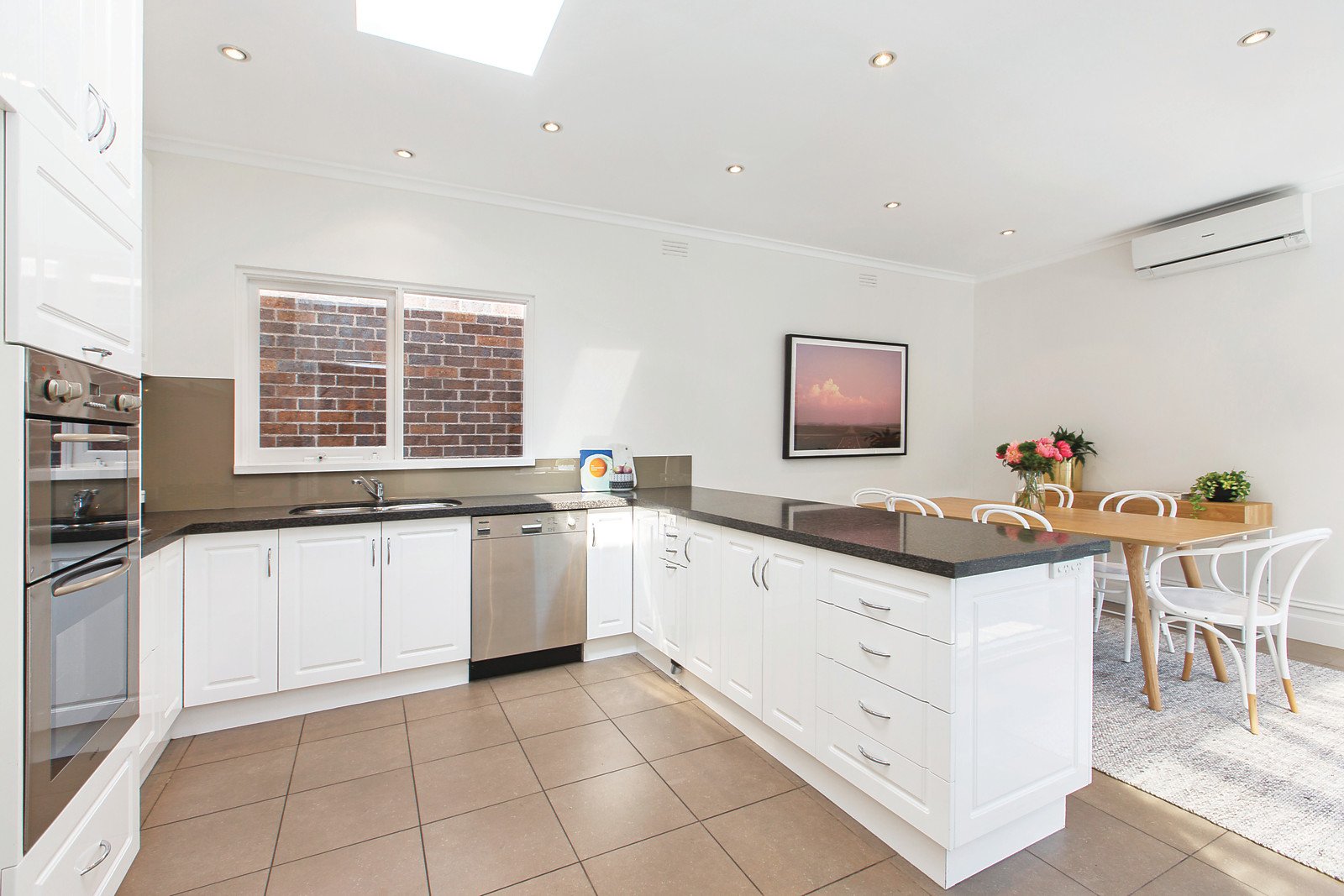 The central arched hallway introduces two generous double bedrooms with marble open fireplaces and built in robes, third bedroom and a stylish bathroom. Clerestory windows accentuate the natural light in the spacious living room with granite open fireplace. The sleek modern kitchen featuring stone benches and European appliances and a sunny dining room open to the private west oriented garden with a paved terrace.