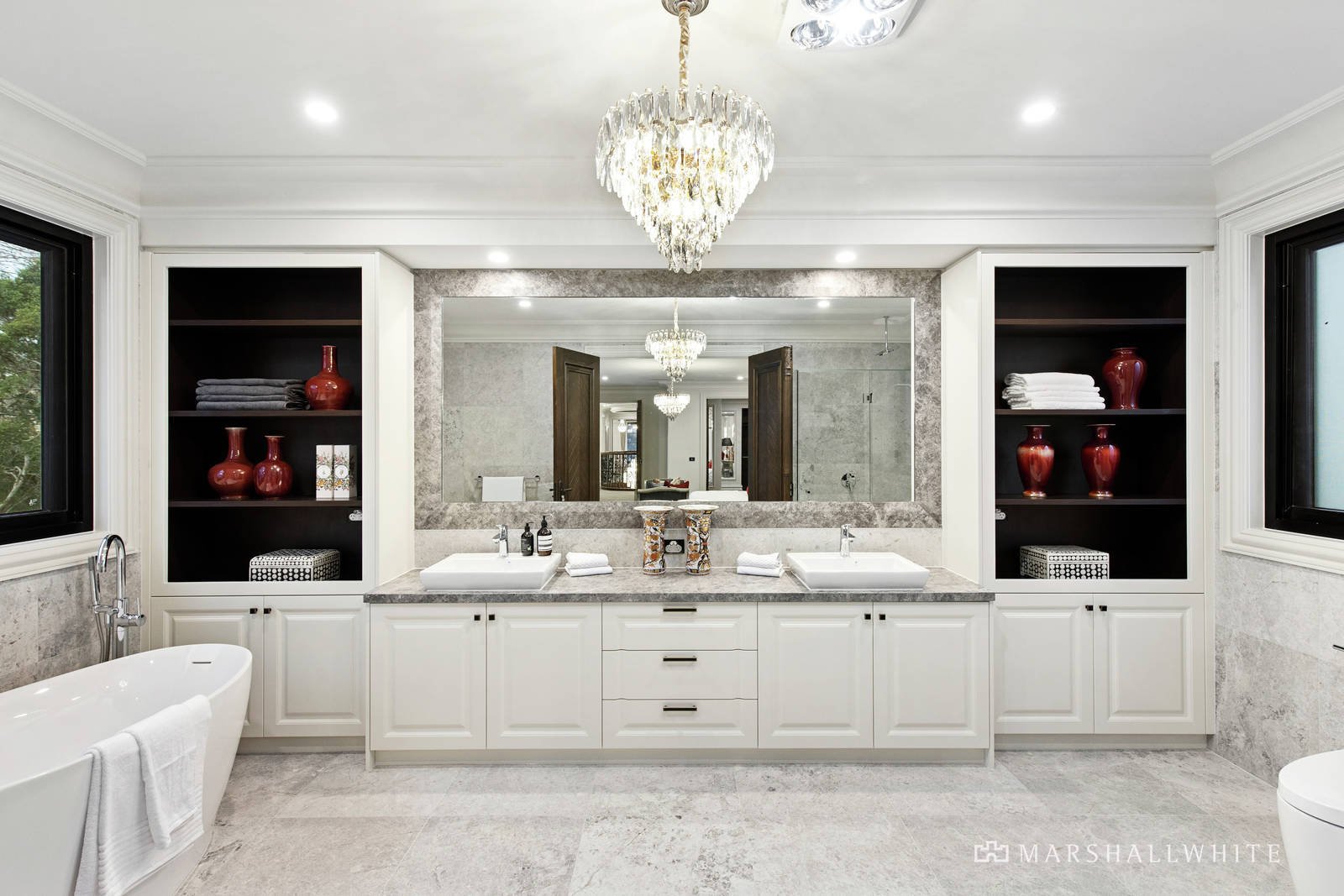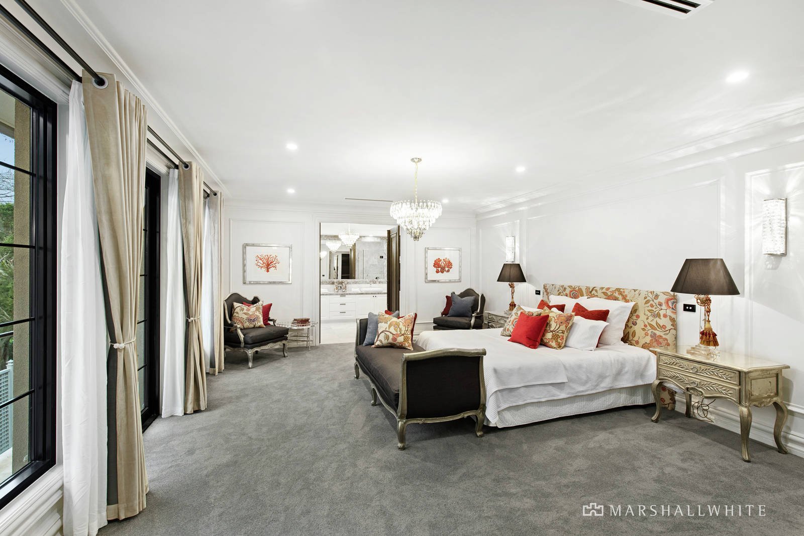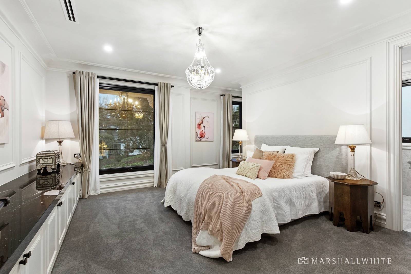 Remarkably large, the master bedroom presents unrivalled luxury with a dressing room and a deluxe ensuite where the use of marble continues and is complemented by a freestanding bath, a rainwater shower and a double basin vanity. Continuing the theme, marble is used liberally in each of the remaining five ensuites.
