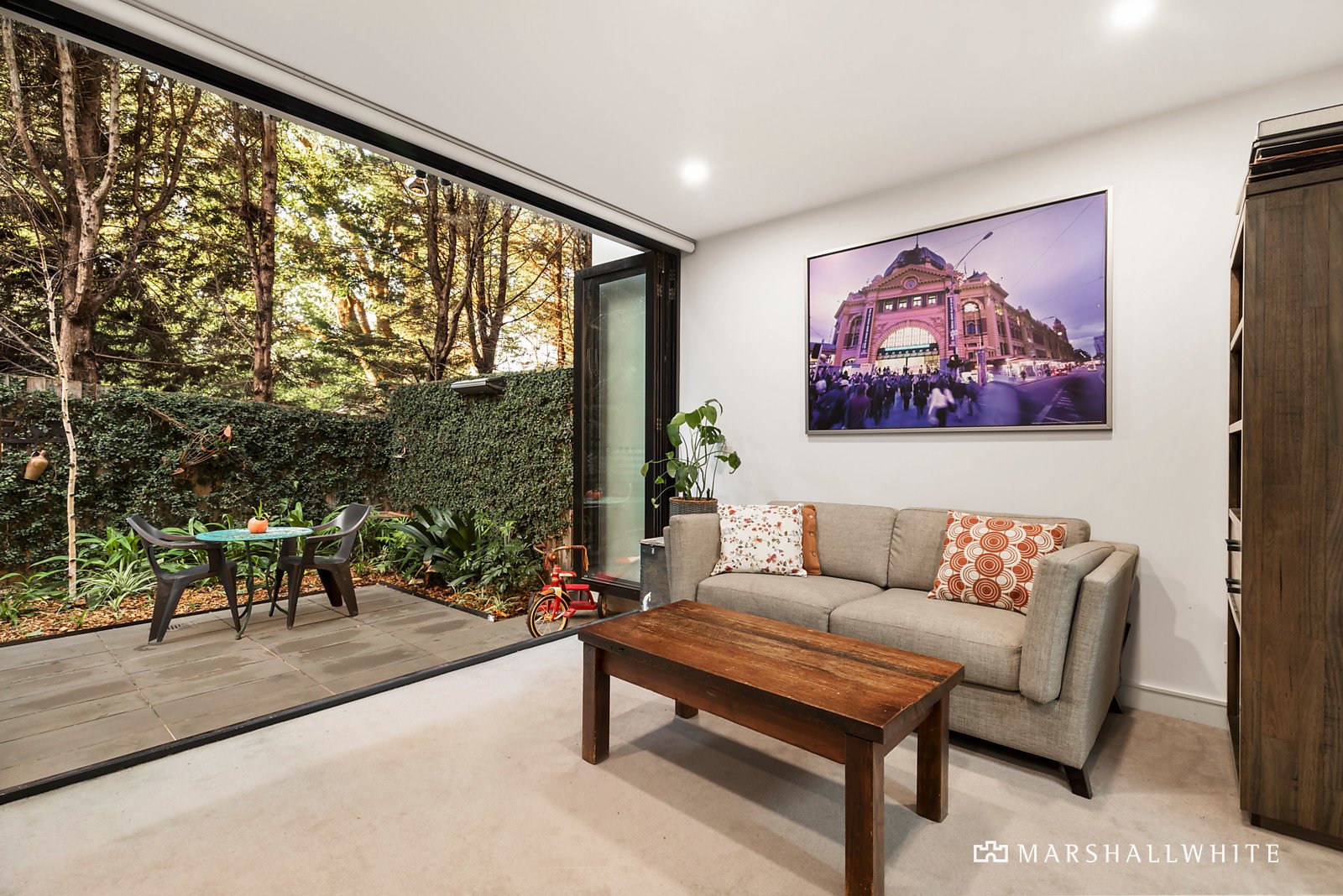 Superbly positioned within a prestige, architect-designed development by Rothe Lowman within the former gardens of the historic Stonington Mansion, this three-bedroom townhouse residence presents an executive lifestyle opportunity over three sophisticated levels. Stylish, light-filled living spaces offer privacy combined with practicality. Stairs lead to the first level, revealing timber floors, a north-orientated open-plan living/dining area, and kitchen featuring an integrated fridge, Miele appliances and kitchen island/breakfast bar. A carpeted bedroom with built-in-robes and adjacent powder room complete the living level of this contemporary dwelling. A spiral staircase leads down to a sun-drenched multi purpose room lending itself as a home cinema, home office, and guest room, easily converted to a guest room if required. Bi-fold doors extend out to a lovely, secluded, paved courtyard with garden and vine-covered fence boundary. This level also provides a second access to the garage and multipurpose storage space. Up to the third level, which delivers a sunny second bedroom with built-in-robes, bathroom with shower-over-bath, vanity and WC, and the spacious main bedroom offering a walk-through robe and ensuite with glass-enclosed shower, double vanity and WC. Additional appointments include Euro laundry, directly accessed two-car tandem garage, video intercom, alarm, reverse-cycle and ducted heating/cooling and exterior integrated gas supply. Conveniently located near Glenferrie Road shopping and dining, Robert Menzies Reserve, Monash Freeway, Tooronga station, CBD public transport links, elite schools and gardens.