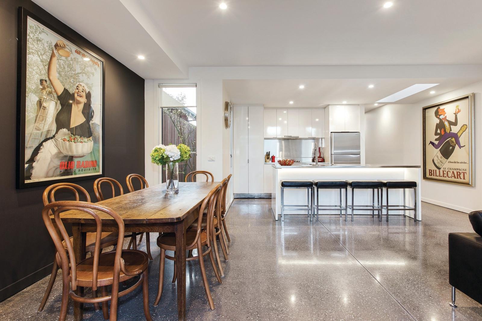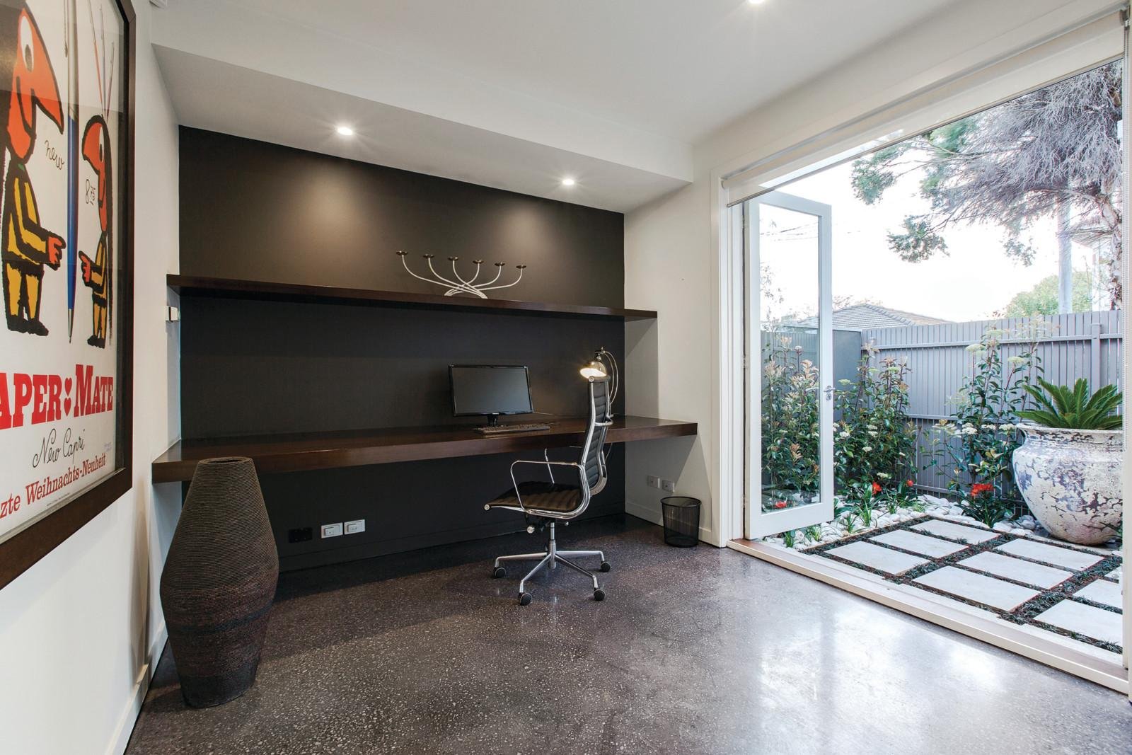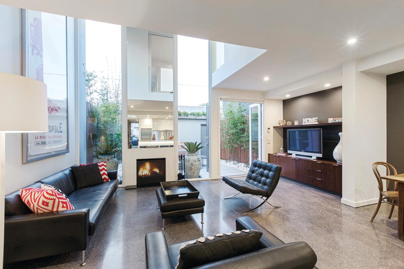 A streamlined approach that combines dark polished concrete floors with soaring voids and strategically placed windows and skylights creates an inviting private domain that seamlessly flows between sensational living areas and stunning outdoor dimensions. A serene fitted study opens to a private west-facing courtyard while the generously proportioned living and dining room with open fireplace and fabulous stainless steel Ilve kitchen extends out to a stunning landscaped northeast facing courtyard with BBQ, an ideal al fresco entertaining area. Timber stairs lead up to the gorgeous main bedroom with designer en-suite and built in robes and a second double bedroom with robes and a stylish bathroom.