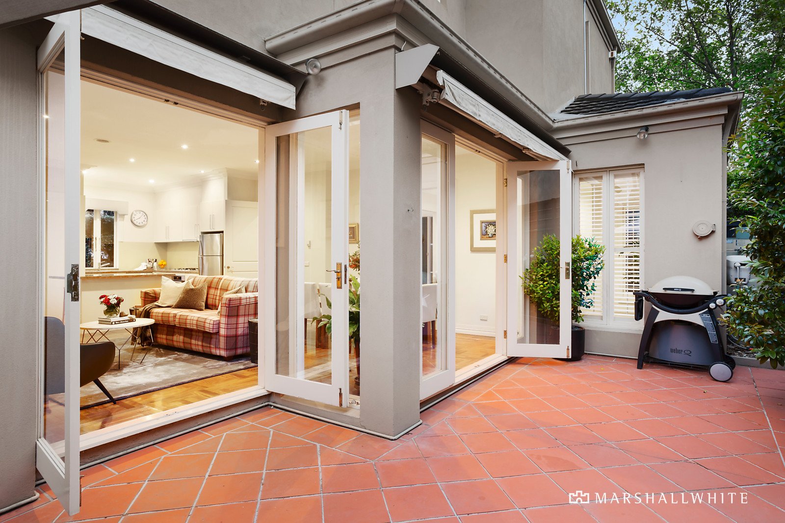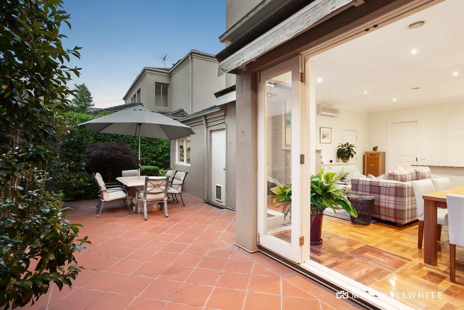 Beneath a double height ceiling, the entrance hall featuring parquetry timber floors introduces a home office and generous sitting room. The expansive open plan living and dining room with a gas fire and gourmet kitchen boasting stone benches and Miele/Asko appliances opens through French doors to a private north-facing paved garden courtyard with sun-awning. Generous accommodation upstairs comprises the main bedroom with lavish en suite, walk in robe and north-facing balcony, two additional bedrooms with robes and a stylish bathroom.