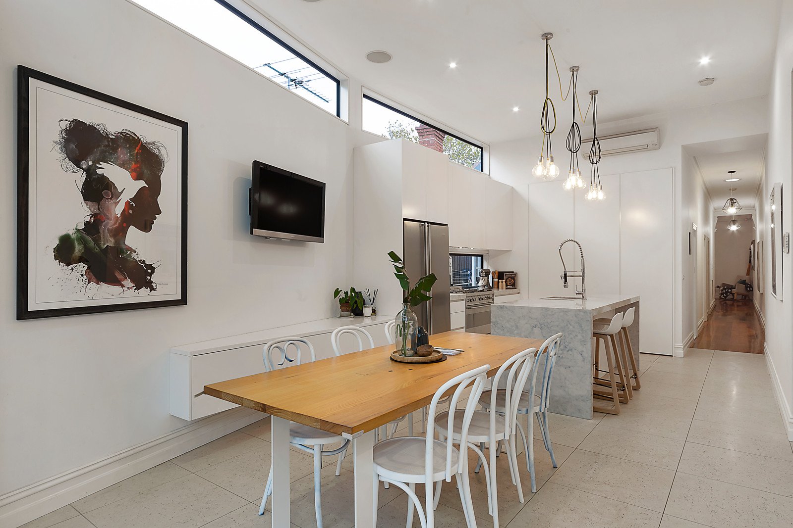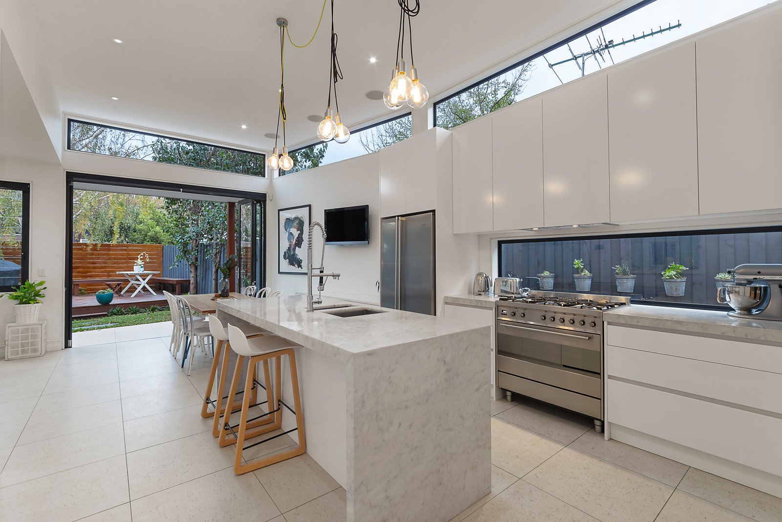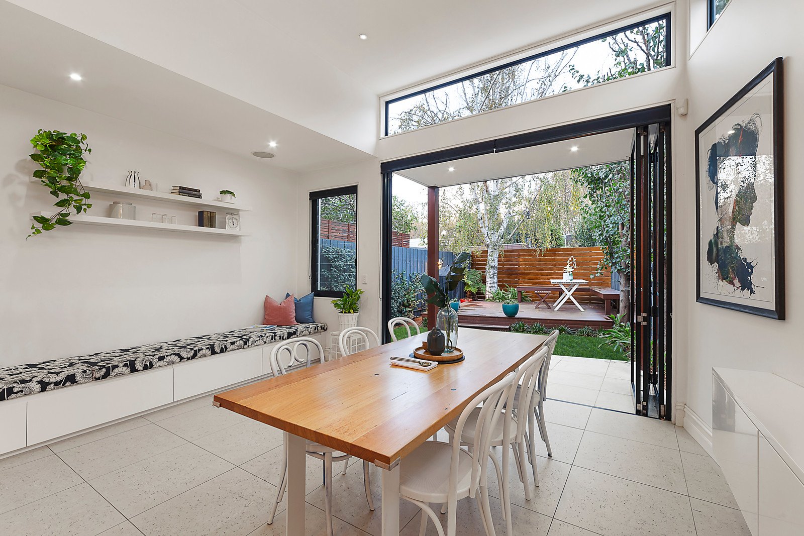 An evocative antique door reveals timber floors in the wide foyer and expansive living room warmed by an open fire. High ceilings and clerestory windows accentuate the sense of space and light in the sensational living and meals zone with built in banquet seating and a stunning Smeg kitchen appointed with Cararra marble benches. Bi-fold doors open the living out to a private landscaped west-facing garden with entertaining deck. A beautiful main bedroom with window seat, built in robe and chic en-suite is matched by two additional bedrooms and a designer bathroom with freestanding bath.