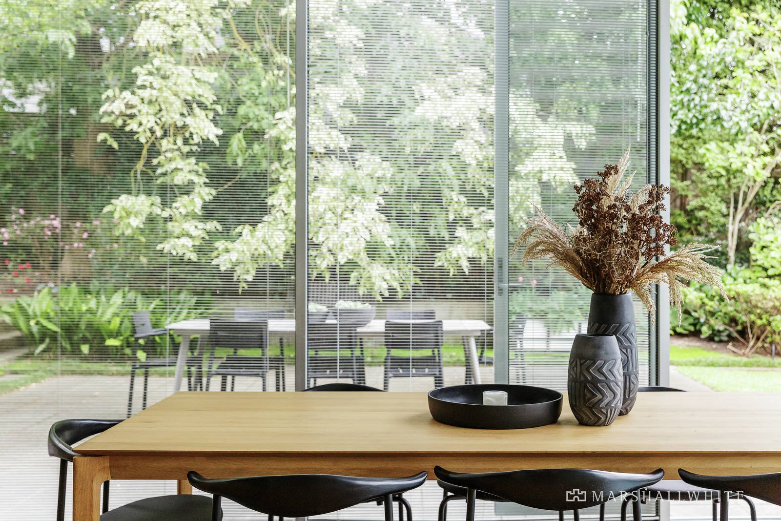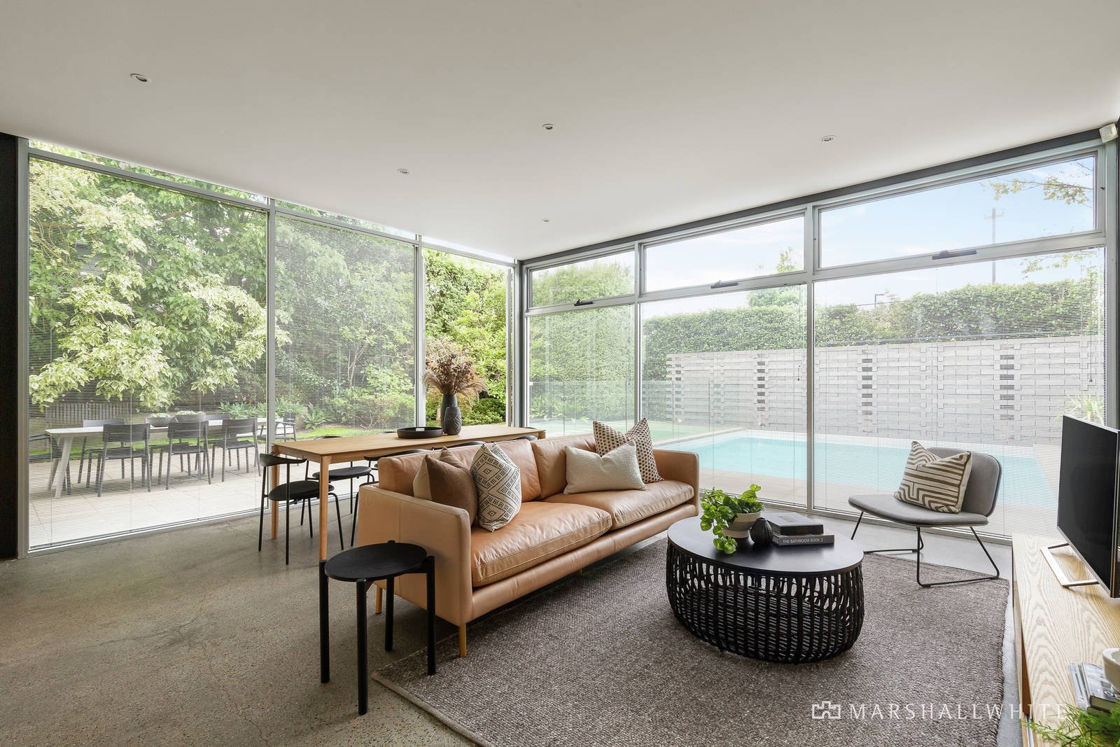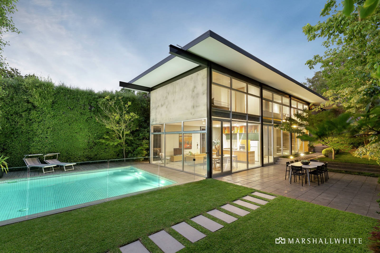 furthermore it retains its contemporary and passive solar design features to this day. Boasting simple lines, varying ceiling heights to the upper level and generous spaces which flow throughout the light-filled interior overlooking lush and tranquil gardens with rows of mature trees plus outdoor entertaining areas overlooking a square, gas-heated pool.
