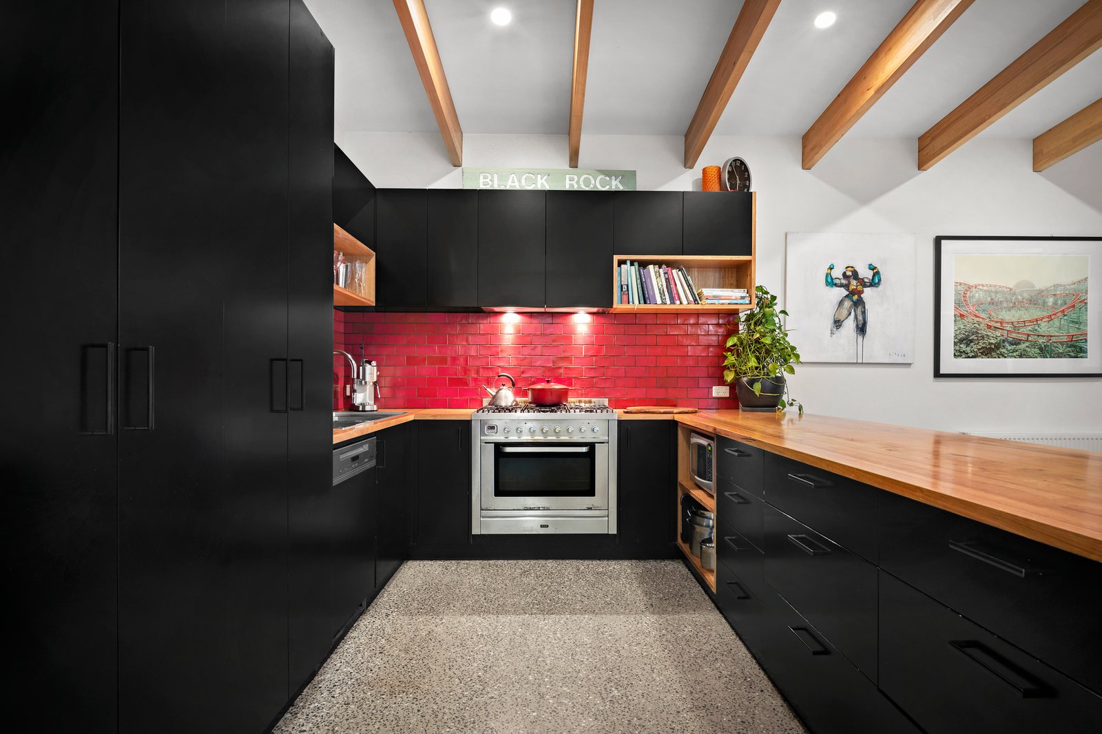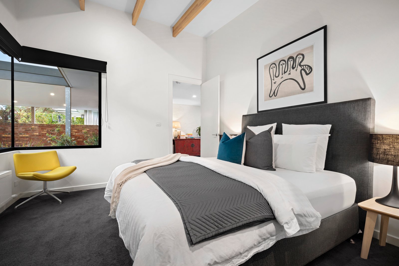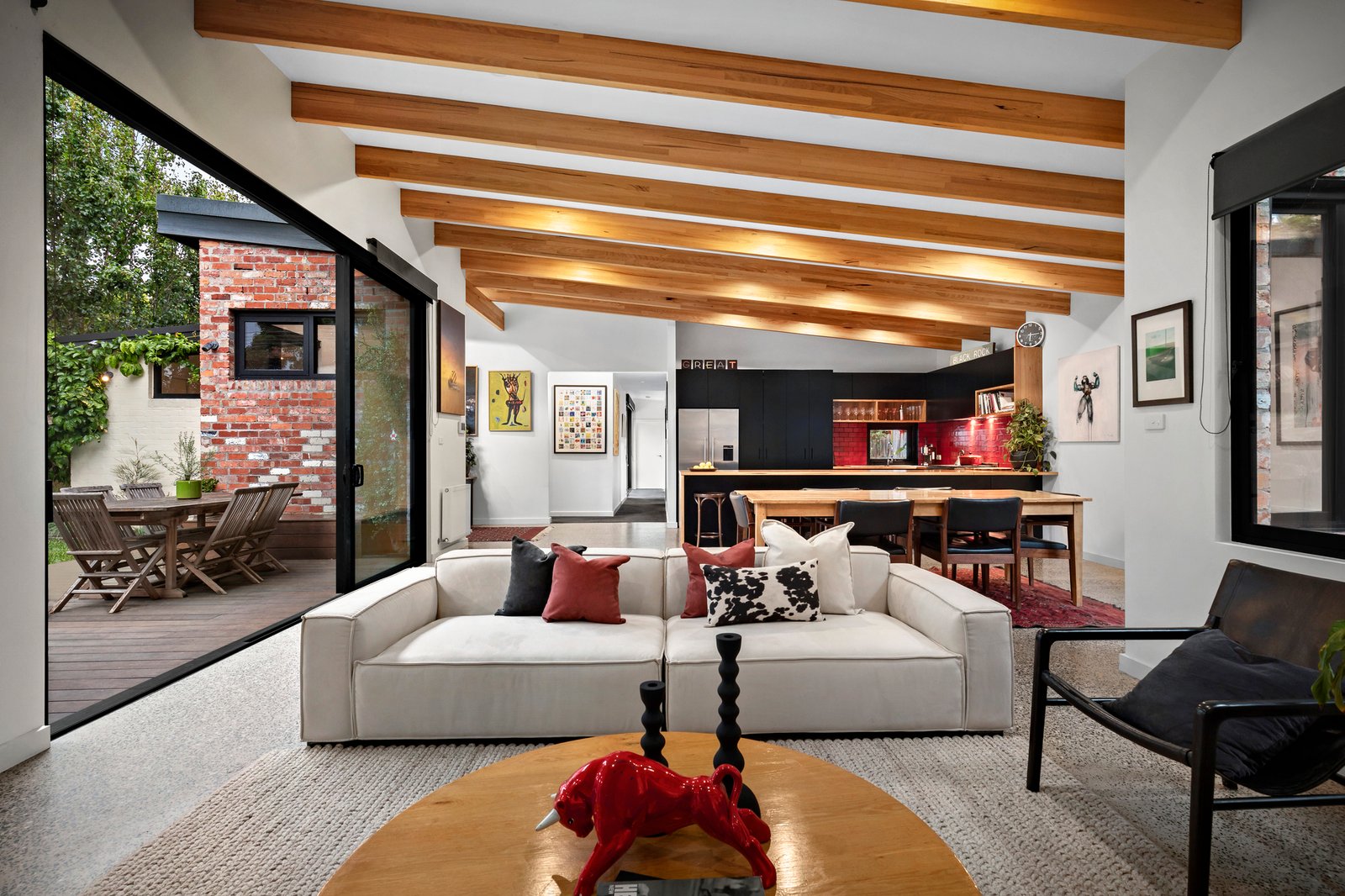 A welcoming polished concrete entranceway flows through to the open plan living zone, full of northern light, where timber beams and a soaring slanted ceiling create space. The dining zone extends to the garden, perfect for entertaining, and the kitchen features a spectacular 4.5-metre-long chestnut waterfall-island bench, sleek black cabinetry and high-end appliances, ideal for everyday living. An adaptable office nook sits adjacent to the kitchen, perfect for a work, study or library space.