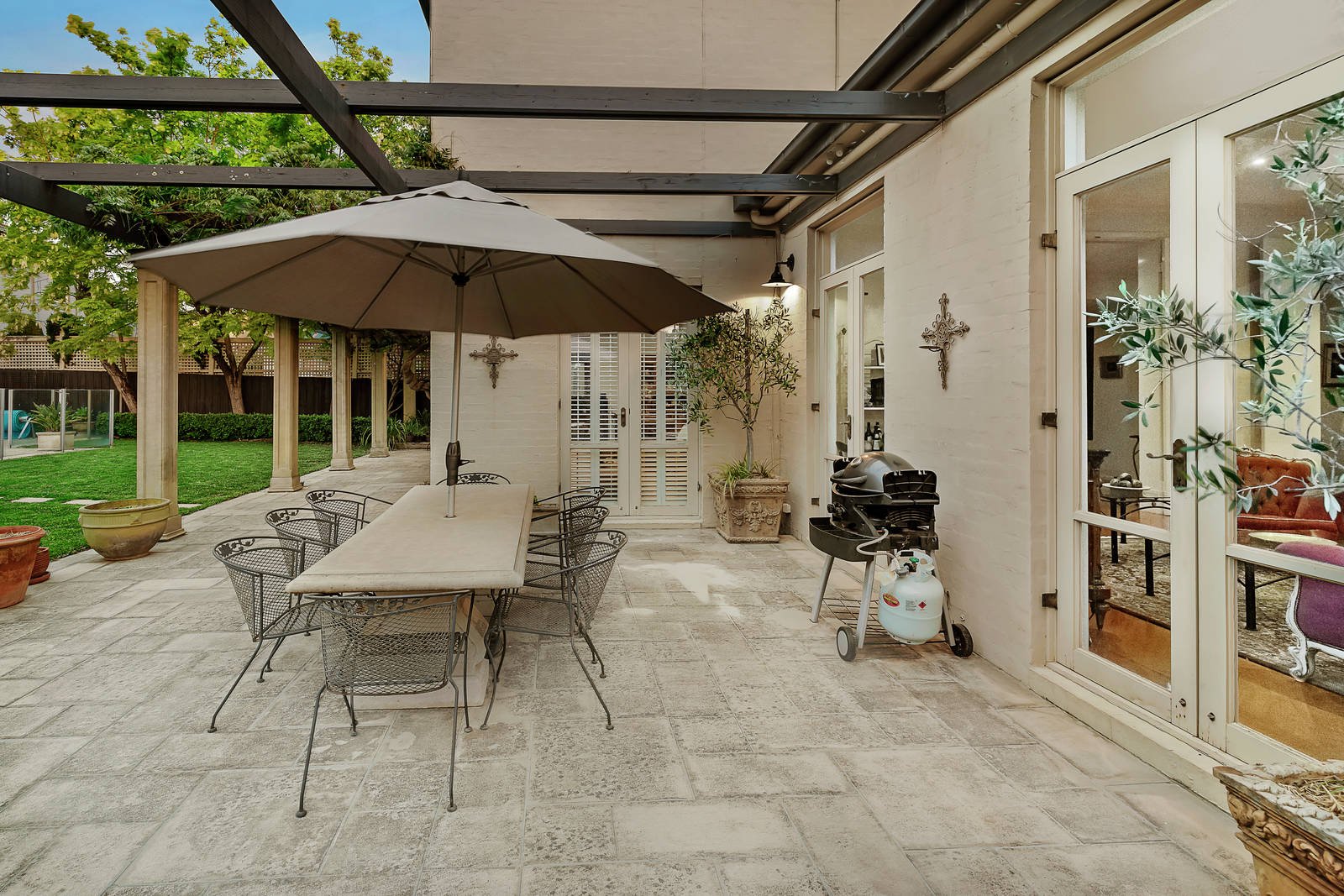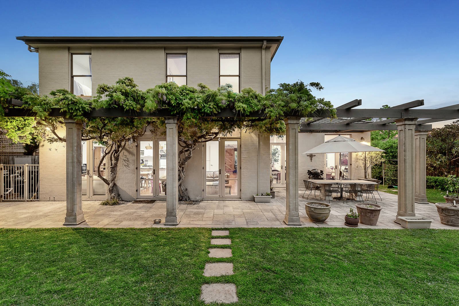 Behind the glorious Tuscan inspired gardens, the inviting interior spaces feature high ceilings and timber floors through the broad entrance hall, a fitted home office and expansive sitting and dining rooms either side of a 2-way gas fireplace. The spectacular scale continues in the open plan living and dining room with a superb granite kitchen appointed with European appliances and walk in pantry. A series of French doors connect all the living areas with the picturesque landscaped north-facing private garden featuring a fabulous 18m gas-heated lap-pool and wisteria covered terraces, perfect for outdoor entertaining. An abundance of accommodation upstairs comprises four double bedrooms with built in robes, a family bathroom and large main bedroom with en suite and walk in robe.