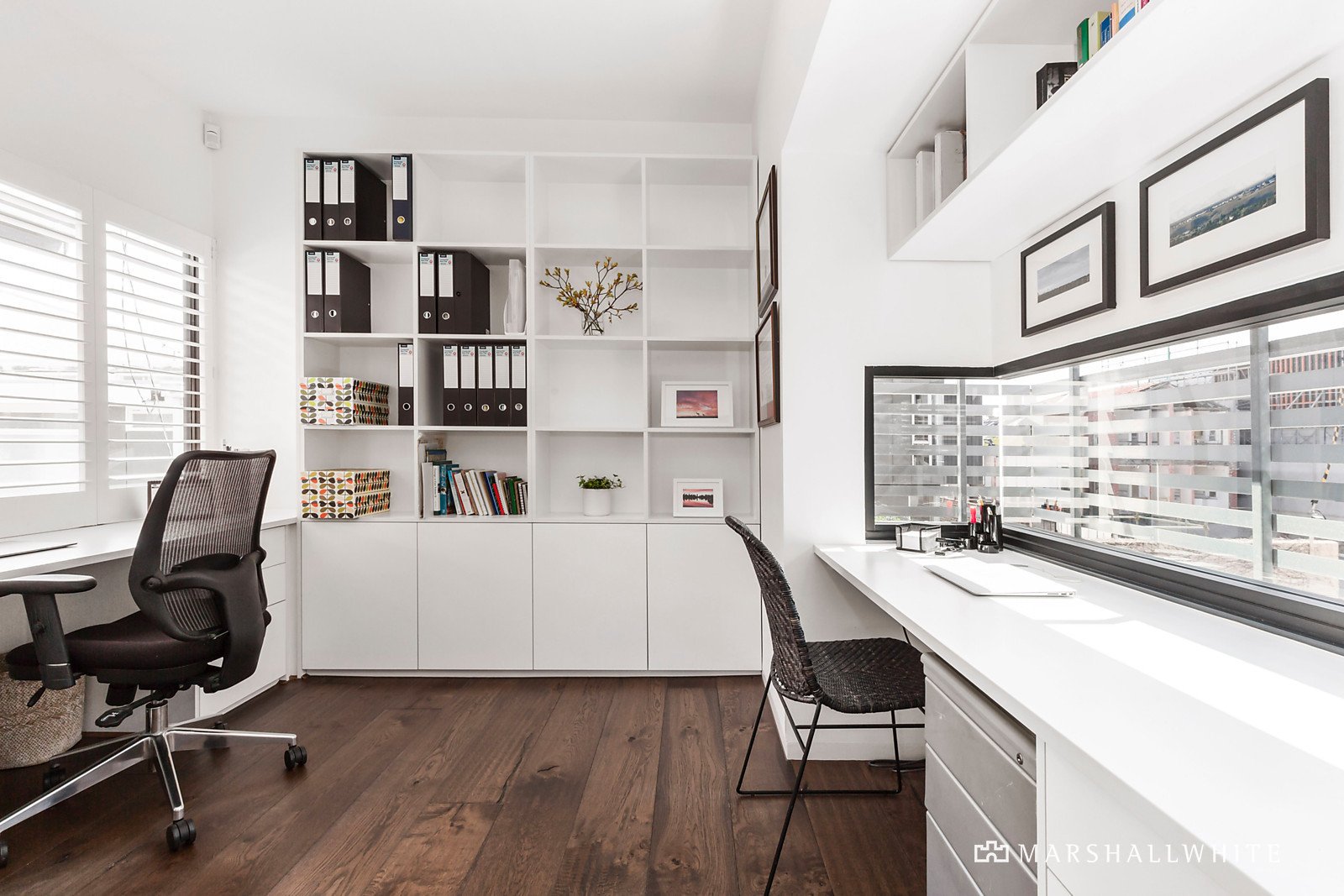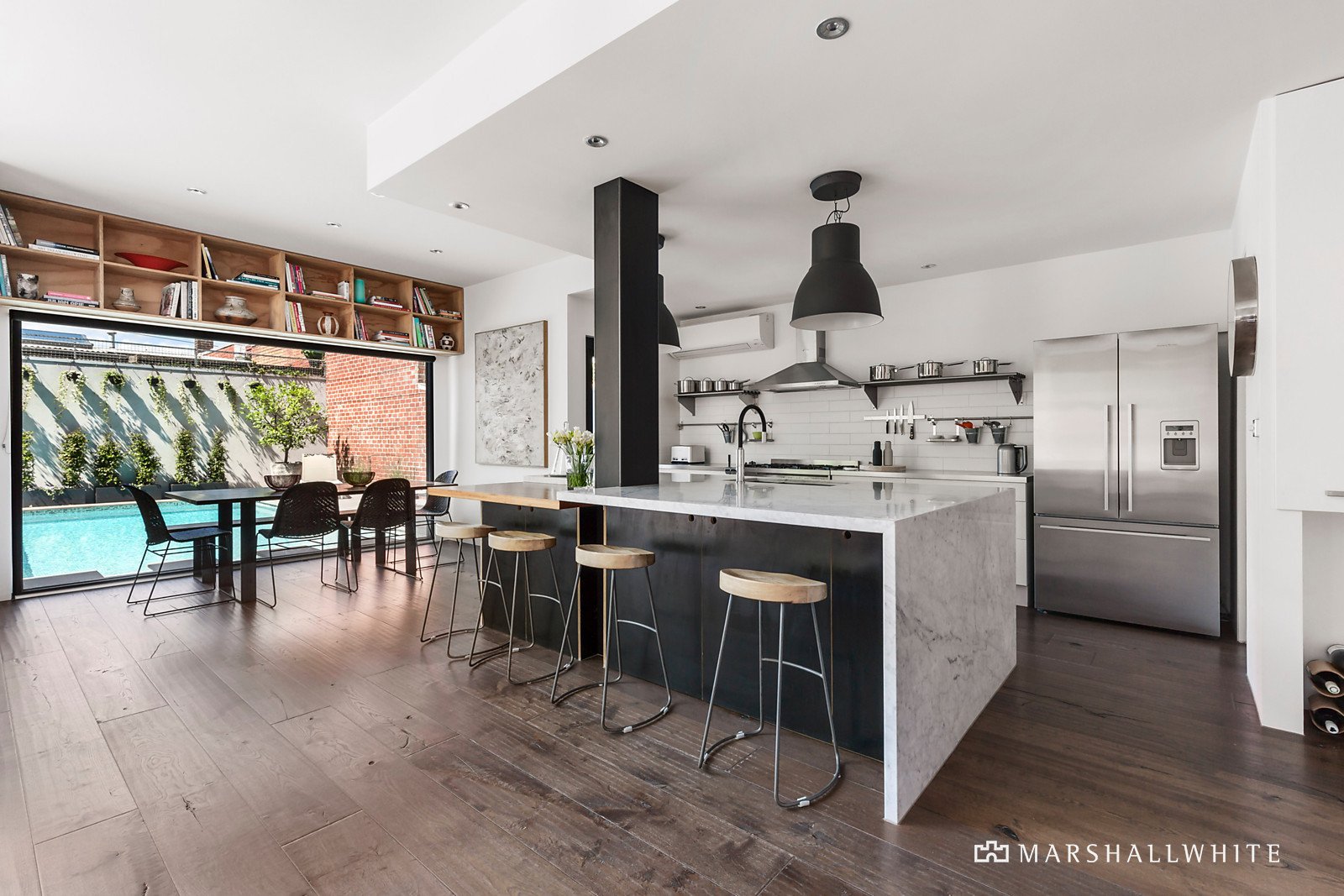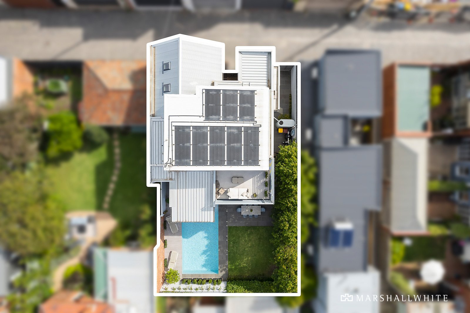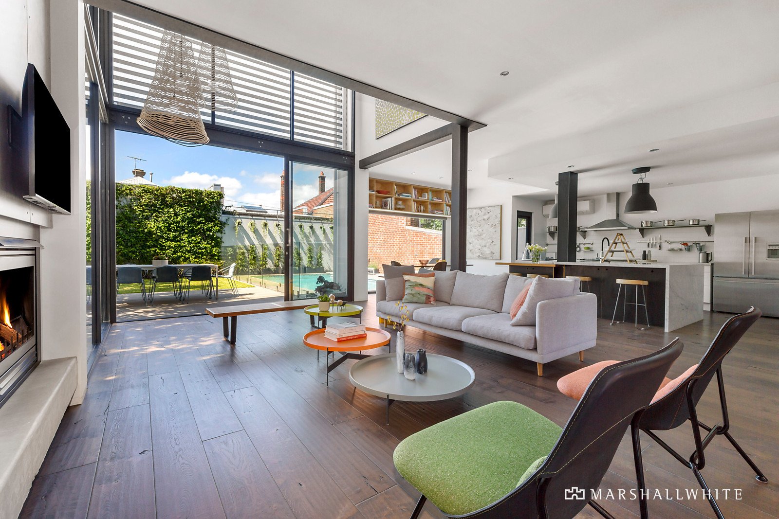 Original exposed brick walls and recycled oak floors are paired with bespoke joinery, soaring voids and vast expanses of glass through the expansive open plan living and dining area featuring a gas log fire and premium Smeg kitchen with a marble island bench and walk in pantry. Corner opening stacking glass sliders extend the living and entertaining options out to the breathtaking private north-facing landscaped garden and picturesque glass mosaic tiled solar heated pool. Framed by tall Manchurian Pears, a large bluestone terrace beneath a remote sun-awning is ideal for lengthy summer lunches in a garden that is a Middle Park rarity in size and serenity. The rich oak floors continue upstairs to two generous bedrooms with walk in robes, desks and designer ensuites, a fabulous loft, dedicated home office with dual work stations and a sensational fully fitted media room. Enjoying its own level, the stunning main bedroom with customised joinery, walk in robe and lavish ensuite opens to a large private north-facing terrace offering panoramic city views.