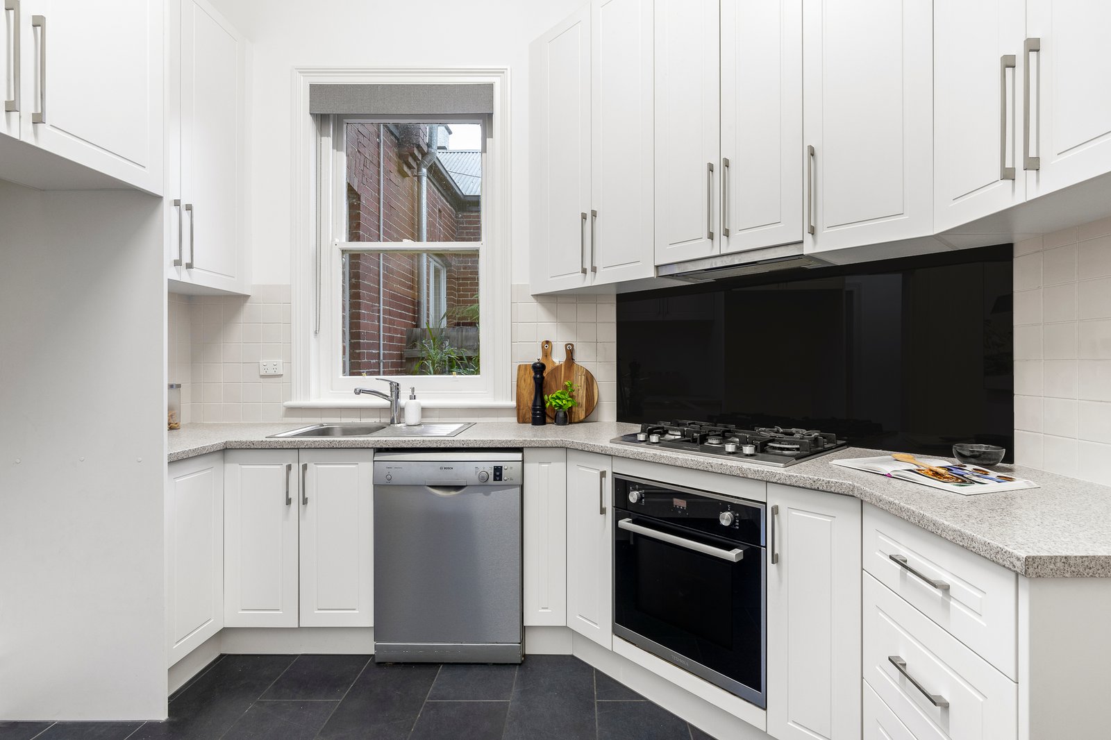 The interior features a Baltic Pine and polished hardwood flooring through the hallway leading to three bedrooms, a pristine updated bathroom, a generous living/dining room, well-equipped kitchen with Bosch and Technika stainless steel appliances and a WIP. Opening to a sun-drenched verandah with adjacent laundry/WC, overlooking a leafy private garden. Ideal for relaxing, dining or entertaining family and friends. Other features of this delightful home include a R/C air conditioner, decorative OFP (living room) and quality kitchen and bathroom fittings.