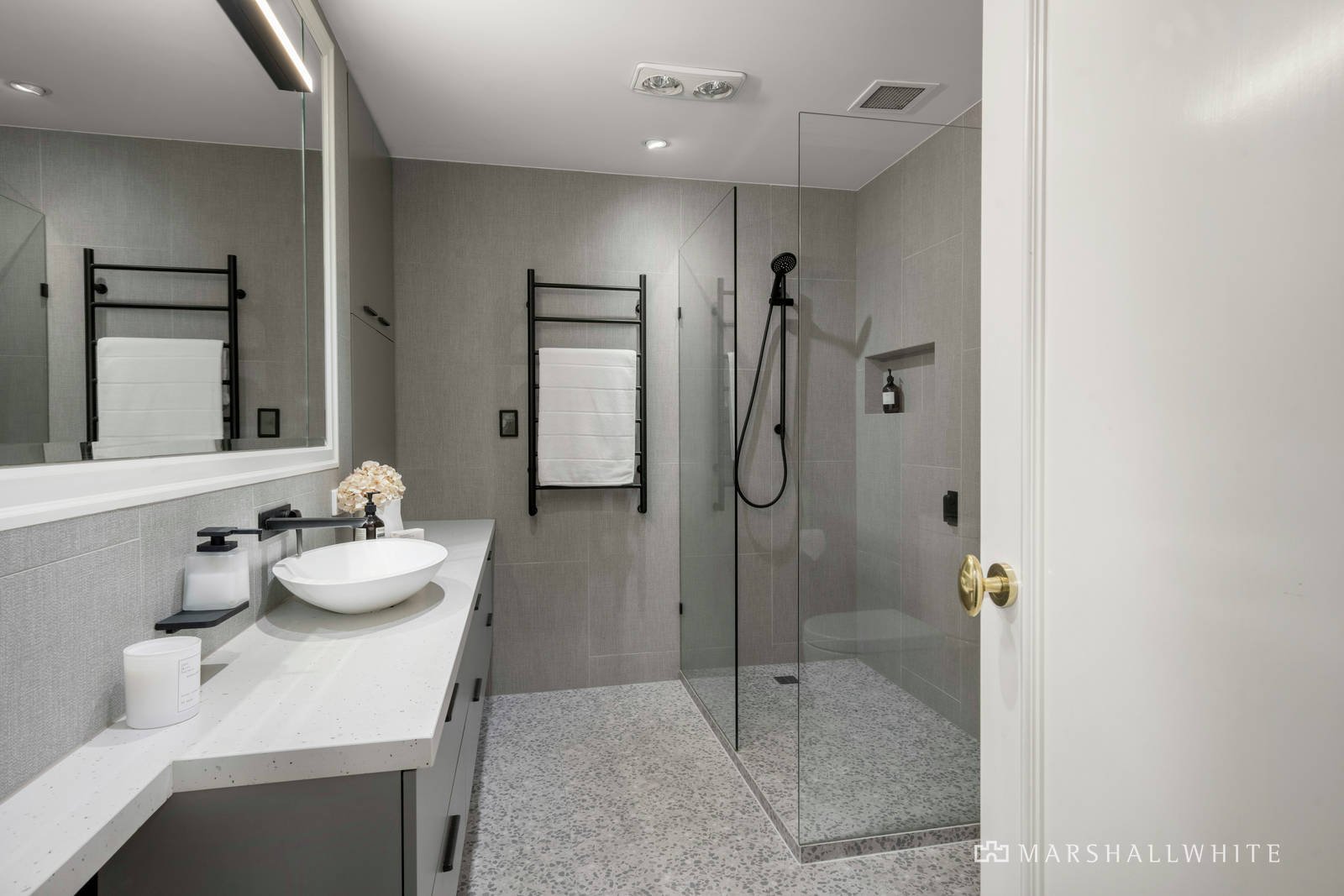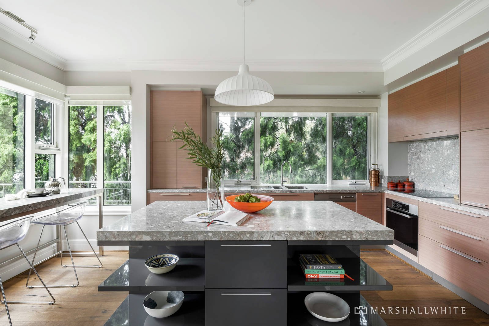 Richly hued wide oak floors flow through the welcoming entrance foyer and through to the expansive open plan living and dining room warmed by a gas log fire. French doors open the living area to a large undercover north-facing terrace, an idyllic venue for al fresco dining while enjoying Yarra glimpses through the lush foliage. The state-of-the-art kitchen boasts swathes of stone, Miele/Asko appliances, an integrated fridge/freezer and stone breakfast bar set against a beautiful leafy backdrop. The gorgeous main bedroom with designer en suite and walk in robe is matched by a second double bedroom with built in robe and stylish bathroom. There is also a spacious home office available as a third bedroom.