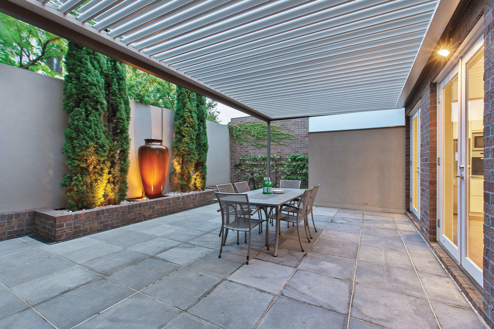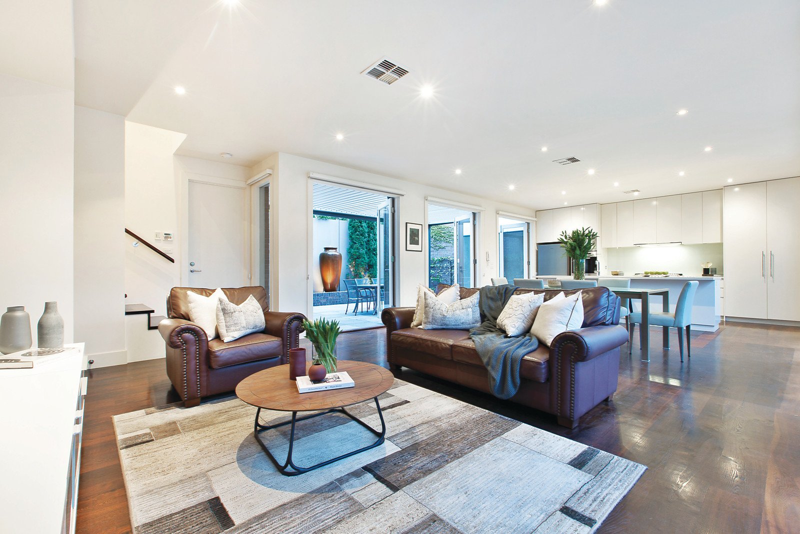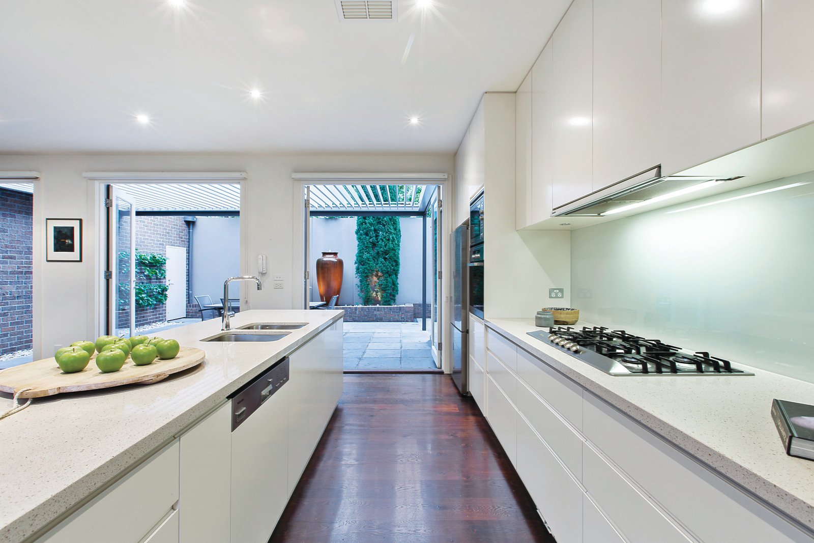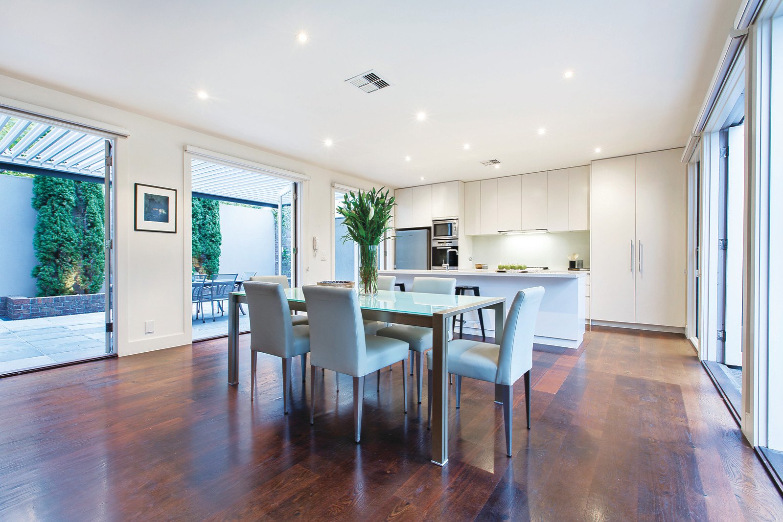 Natural light streams through the wide hallway to an elegant sitting room with gas fireplace. Dark timber floors flow through the expansive living and dining room opening through French doors on one side to a private terrace, and through bi-fold doors to a large northwest-facing landscaped courtyard with tranquil water feature and espaliered pears. The modern gourmet kitchen is appointed with stone benches and Miele appliances. Superbly proportioned family accommodation comprises a glorious main bedroom with lavish en-suite and walk in robe, three additional double bedrooms with robes and a stylish bathroom.