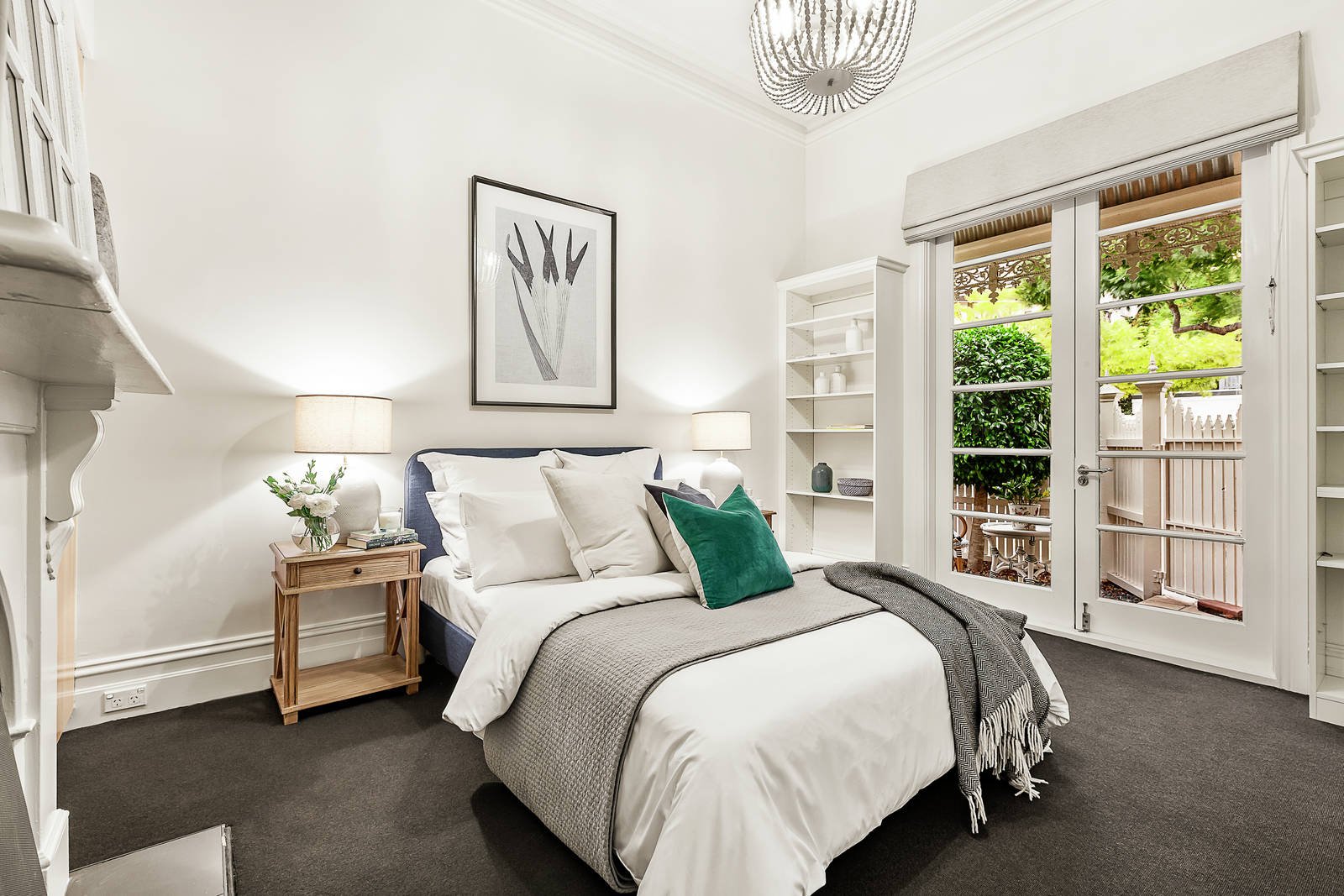 The arched hallway featuring high ceilings introduces two beautiful bedrooms with open fires and built in robes and a designer bathroom with stunning bespoke tiles. The gourmet kitchen appointed with stone benches and the generous sun-drenched living and dining room beneath a curved ceiling opens to a private decked northwest courtyard with BBQ and sun-awning.