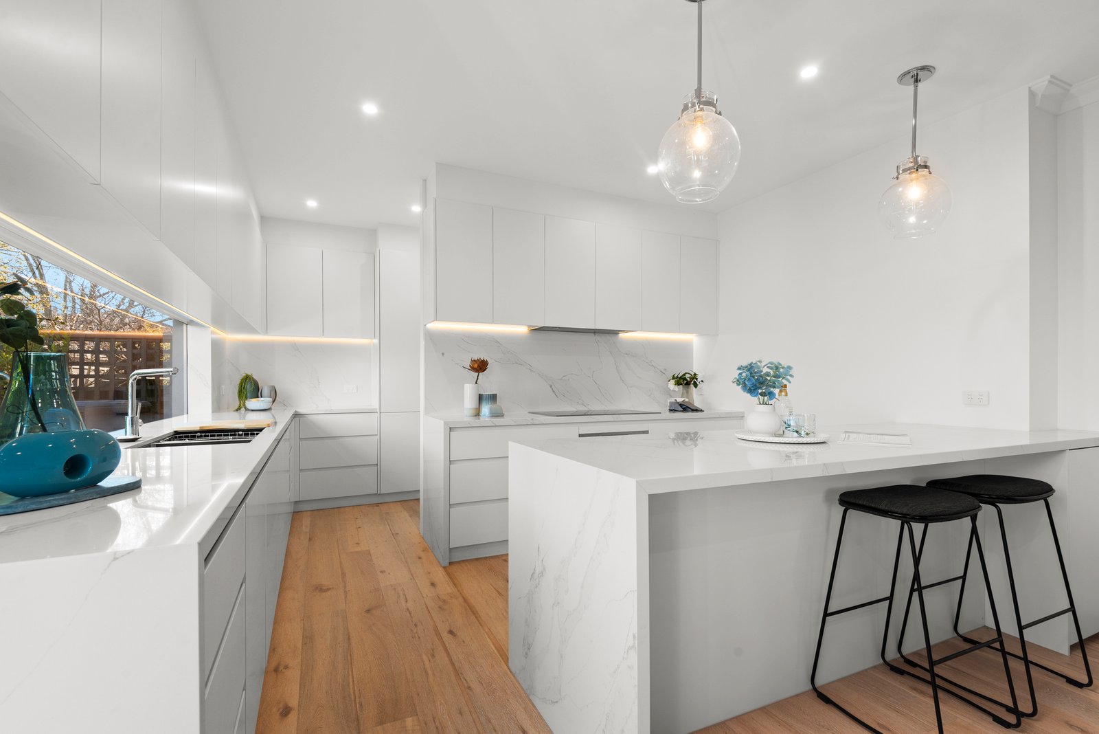 With a seamless connection to a generous entertainers’ deck and a brilliant glass splash back that introduces glorious light and delightful garden vistas, the kitchen is an inspiring space, perfectly presented with stone bench tops, volumes of cabinetry and a suite of brand new Bosch appliances that include induction cooking. Additional highlights of this visually impressive home include a main bedroom ensuite, large mirrored robes in both bedrooms, a double lock-up garage with additional driveway parking and direct internal access, as well as a large central bathroom with a frameless screened shower and independent bathtub, secure video entry, plantation shutters, central heating, air conditioning and split systems.