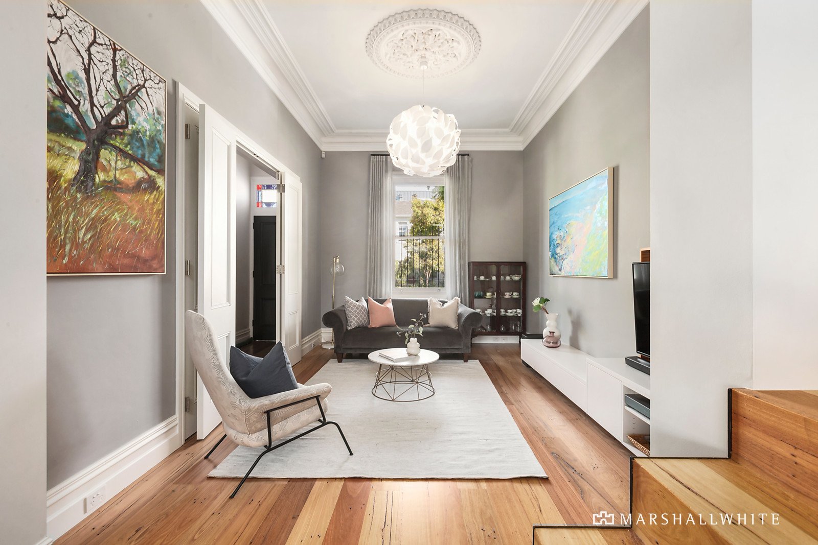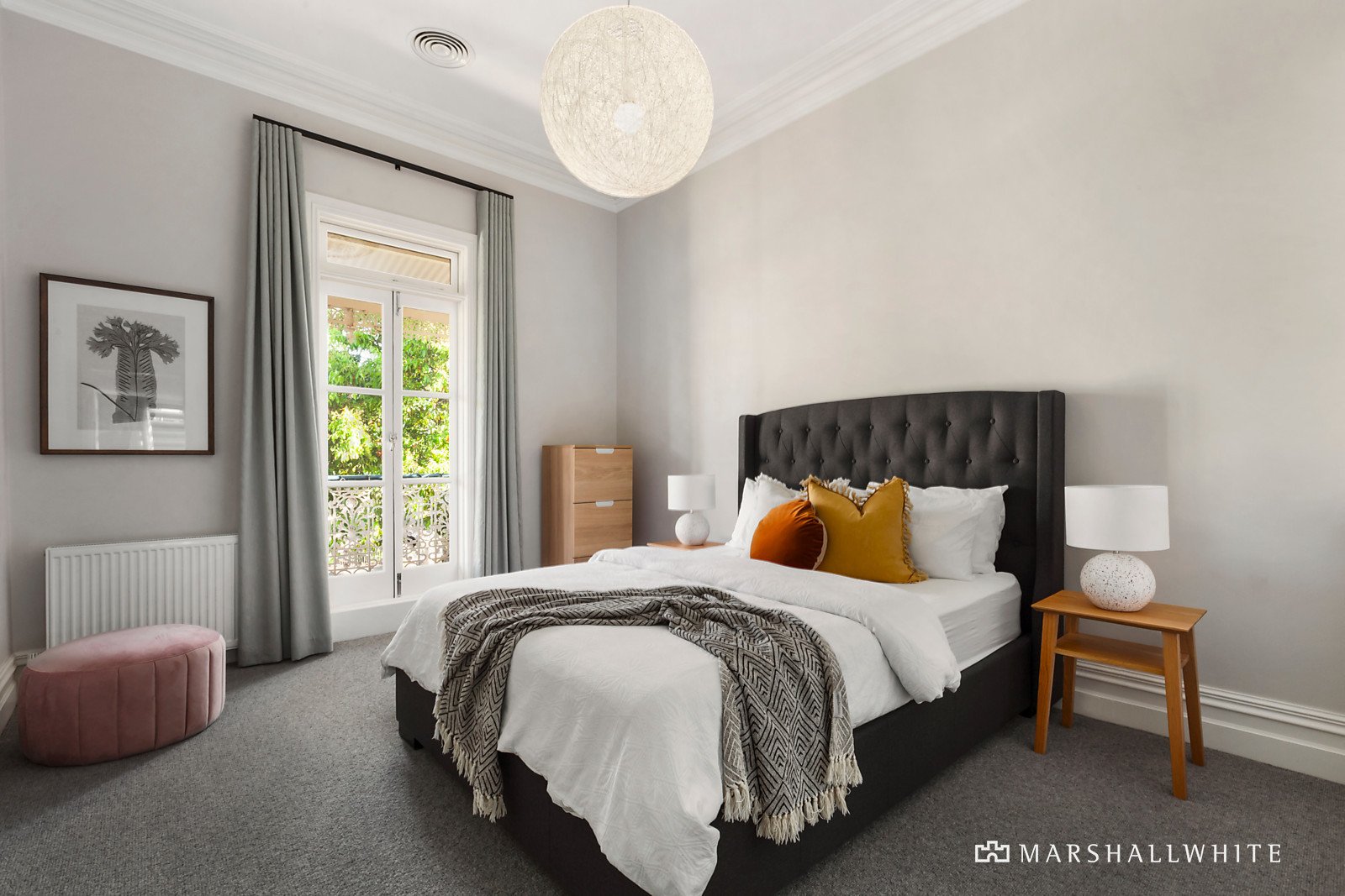 A spectacular architect designed renovation in the area's most prized location close to the South Melbourne market, Albert Park Lake, and St Vincent Gardens has added 21st century designer style to the magnificent original dimensions of this glorious double fronted freestanding c1868 balconied Victorian residence. A wide hallway with period features introduces a true entertainer's house with a generous living room opening directly through to a custom bespoke kitchen and dining area featuring Dekton benches and Meile/Bosch appliances. Polished concrete floors and stacking glass sliders allow for a seamless transition to the north-facing landscaped garden with timber feature fence and rear lane access offering potential off street parking. The lavish master bedroom with en-suite and walk in robe is further complemented by two bedrooms and two stylish additional bathrooms. A third living area/home-office with wet bar and window seat take full advantage of beautiful city views. Superbly finished and appointed with an alarm, video intercom, hydronic heating, RC/air-conditioning, slab heating, designer lighting, remote blinds, remote external louvres, separate laundry and ample storage.