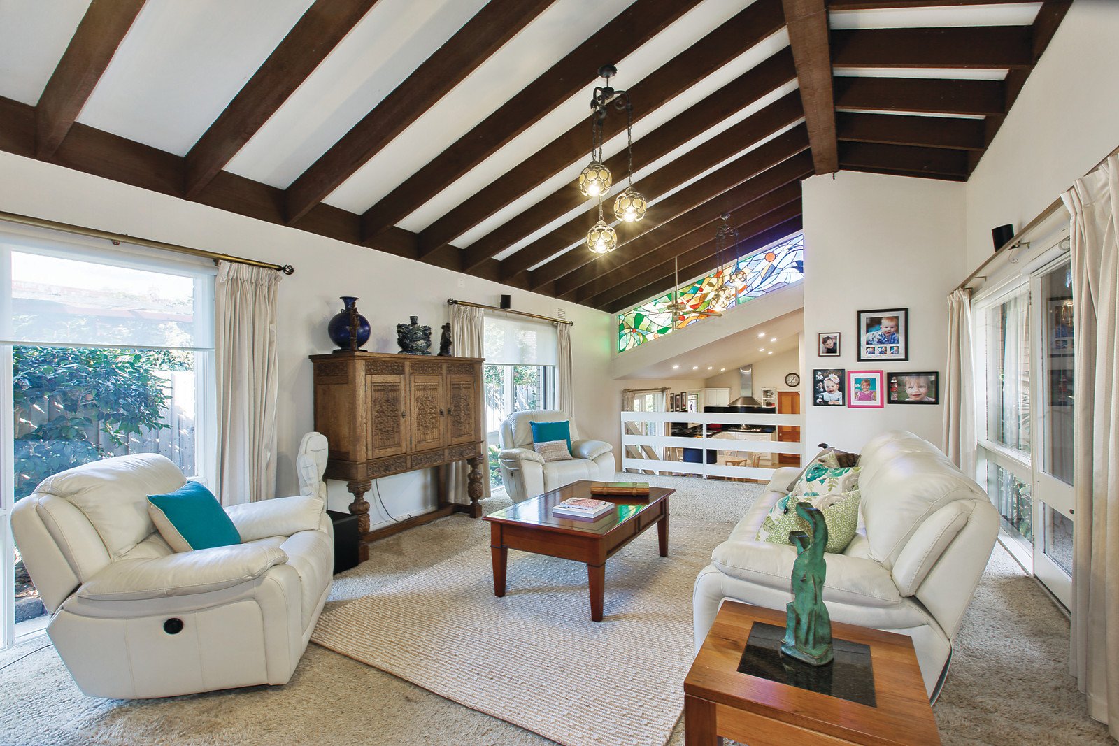 Set well back from the street, the marble foyer introduces a home office, main bedroom with ensuite and walk in robe, two additional double bedrooms with built in robes and a Travertine bathroom with spa bath. An upstairs self-contained living room with kitchenette and balcony, double bedroom with walk in robe and bathroom. Timber floors and vaulted ceilings define the expansive formal living and dining room. The casual dining area and gourmet kitchen featuring granite benches step up to a large family living room beneath vaulted beamed ceilings.