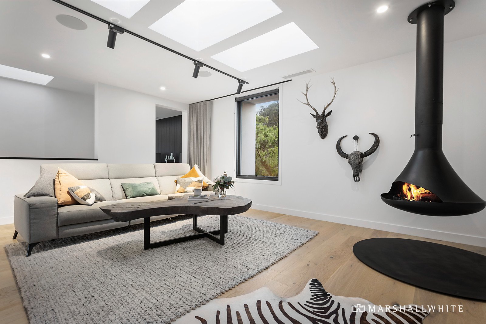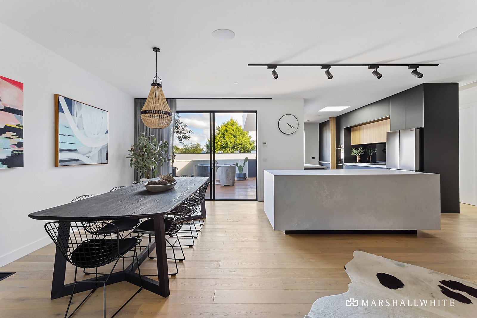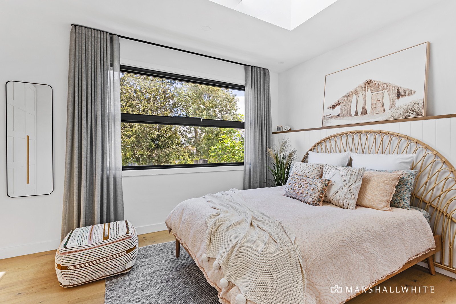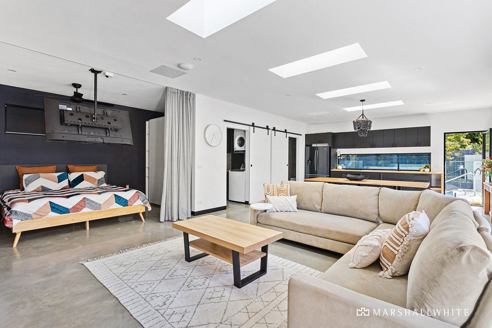 Exhibiting a harmonious vogue that blurs the lines between art deco, cubism and Californian mid-century aesthetics, the residence seamlessly fuses a distinguished design that is superbly crafted from beginning to end. The open living area has been fashioned with engineered Oak flooring, sheer curtains and soaring ceilings, edged by a stone kitchen that features high-end appliances, a butler's pantry and a bi-fold servery to the entertaining deck.