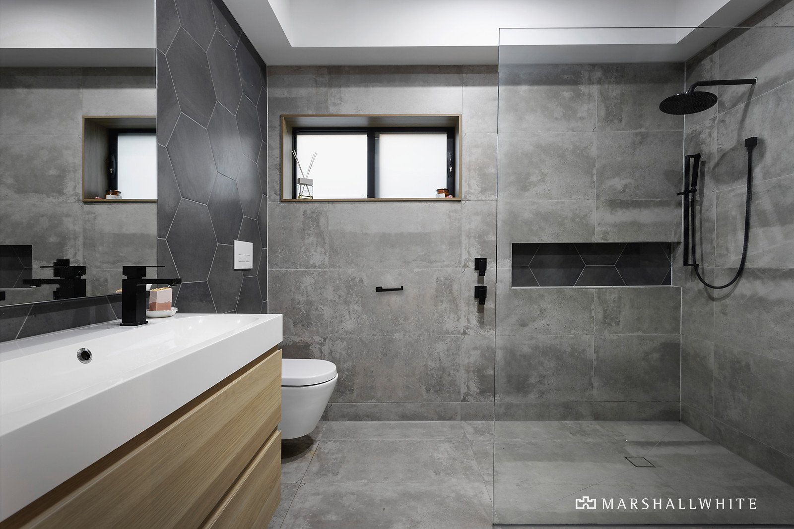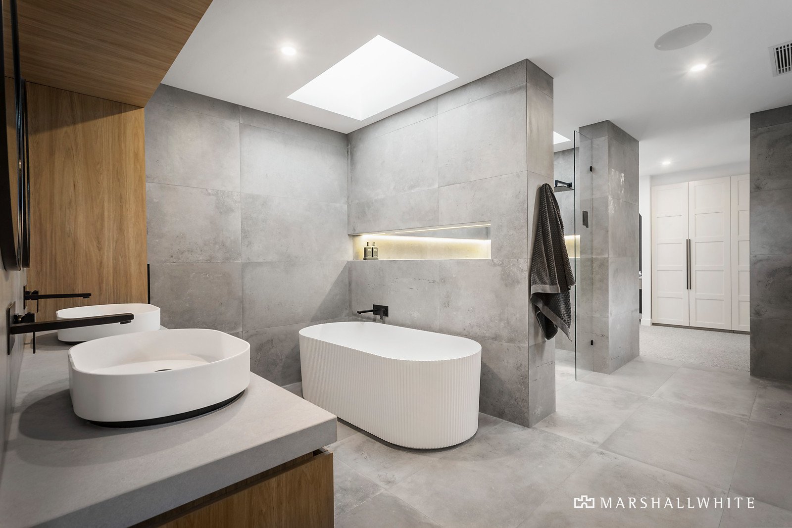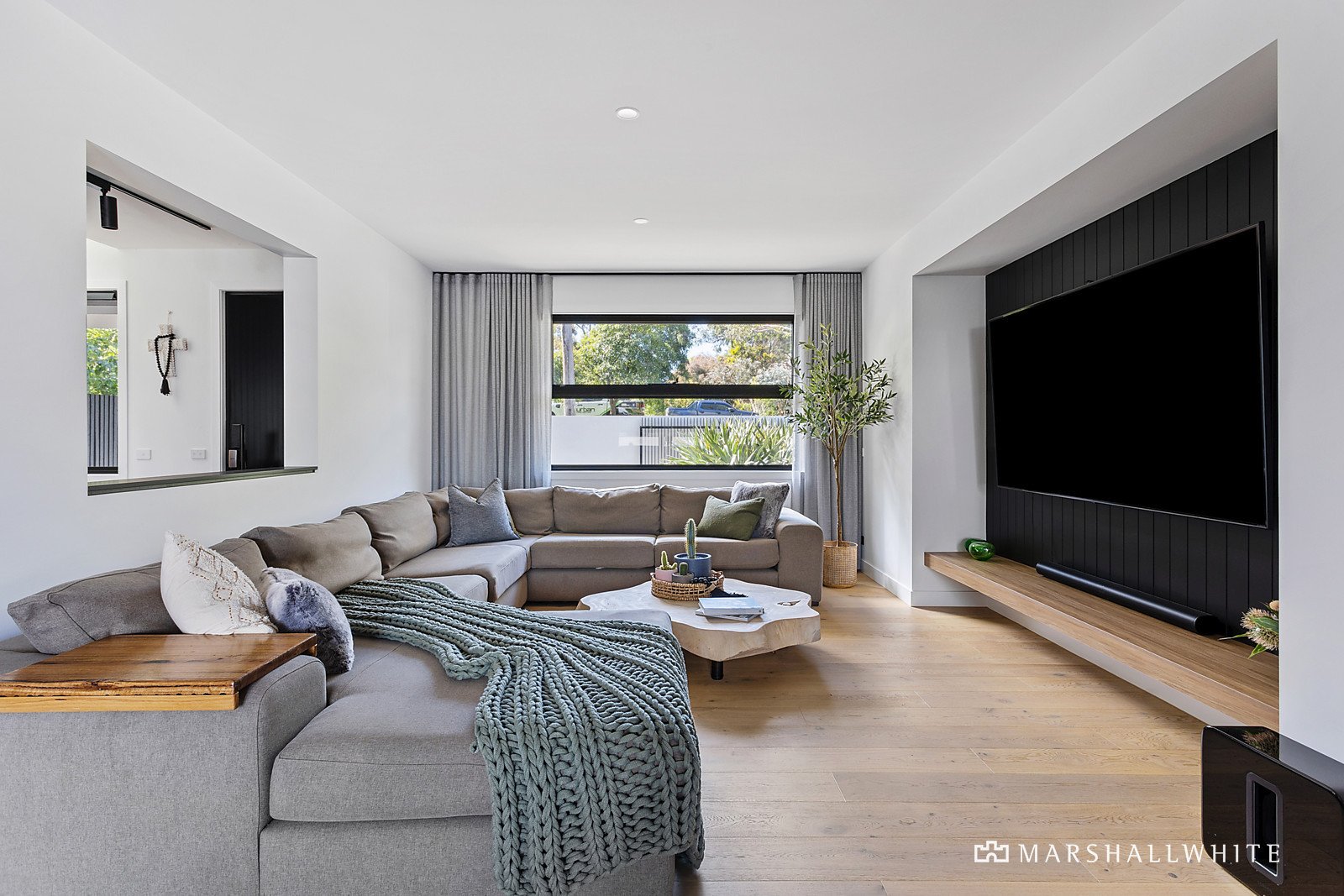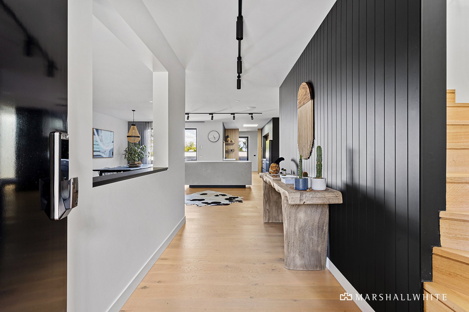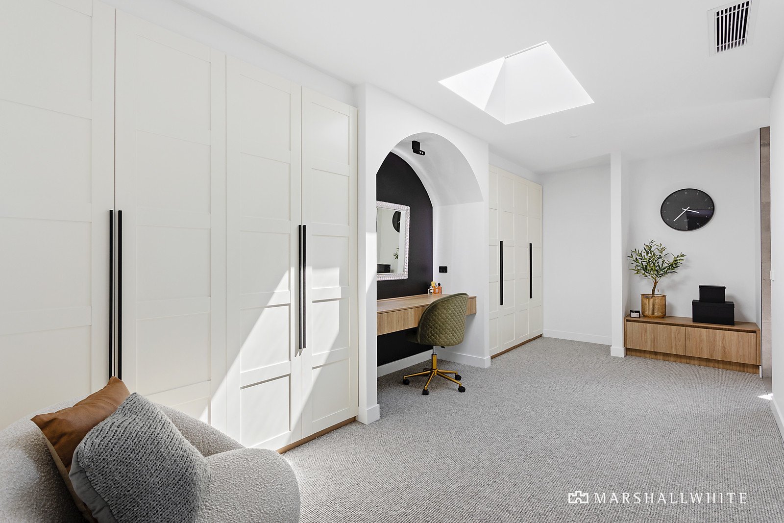 Exhibiting a harmonious vogue that blurs the lines between art deco, cubism and Californian mid-century aesthetics, the residence seamlessly fuses a distinguished design that is superbly crafted from beginning to end. The open living area has been fashioned with engineered Oak flooring, sheer curtains and soaring ceilings, edged by a stone kitchen that features high-end appliances, a butler's pantry and a bi-fold servery to the entertaining deck.